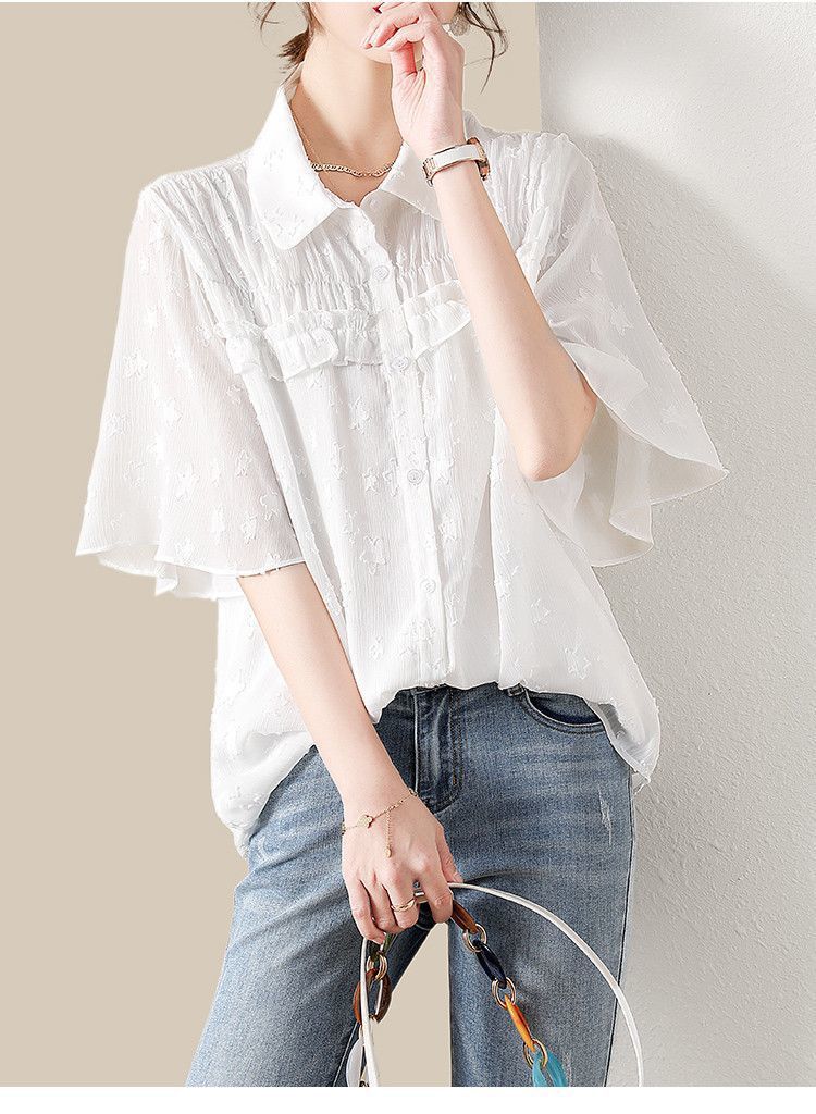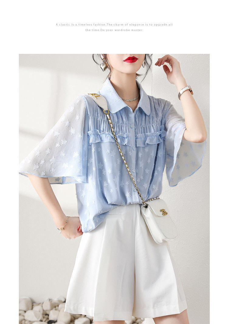 프랑스 스타일 어깨 쉬폰 최고 여자 2024 년 여름 패셔너블 루즈 슬리밍 올 매치 니치 칙칙한 셔츠