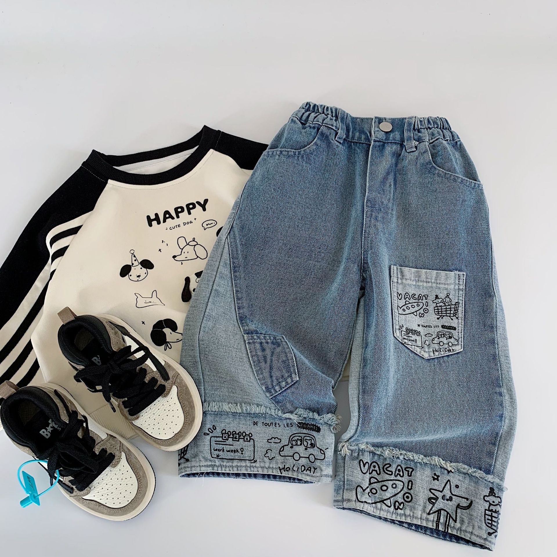 Maibao 아동용 청바지 2025 가을 새로운 한국 스타일 남성과 여성의 아기 느슨한 캐주얼 바지 아동 바지 유행스토어 가기