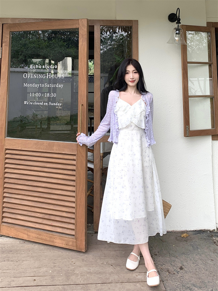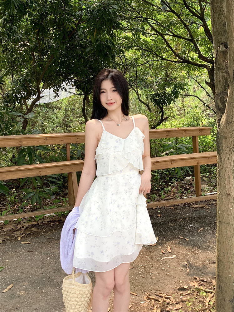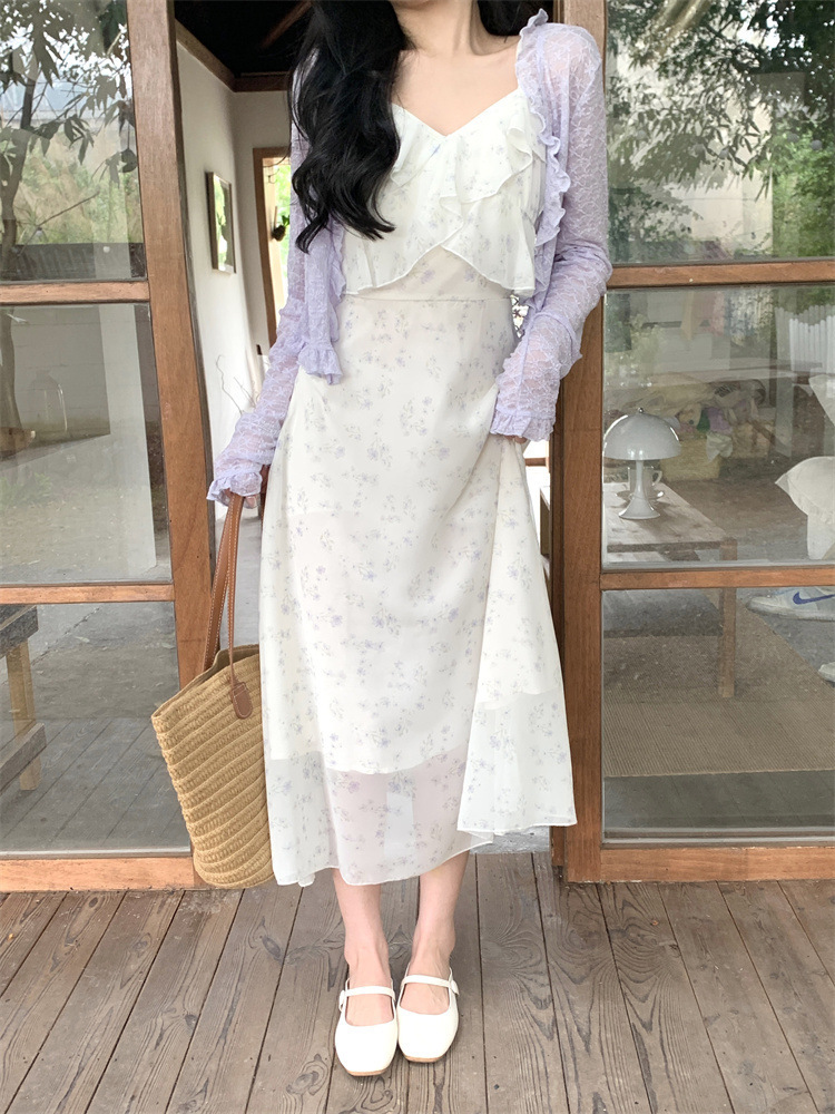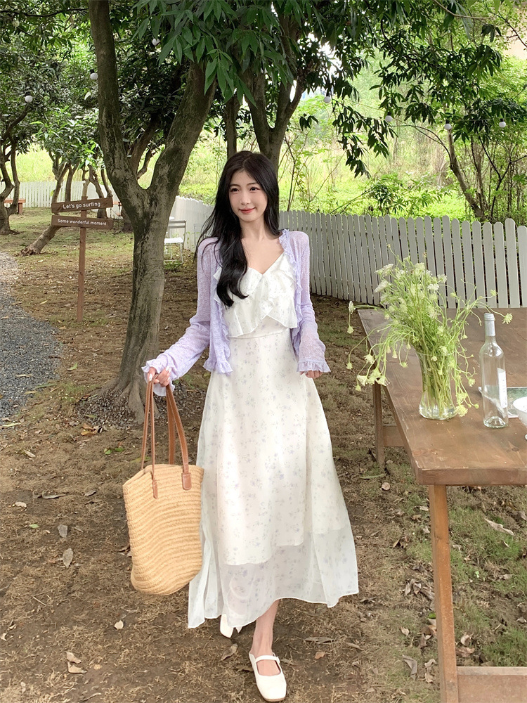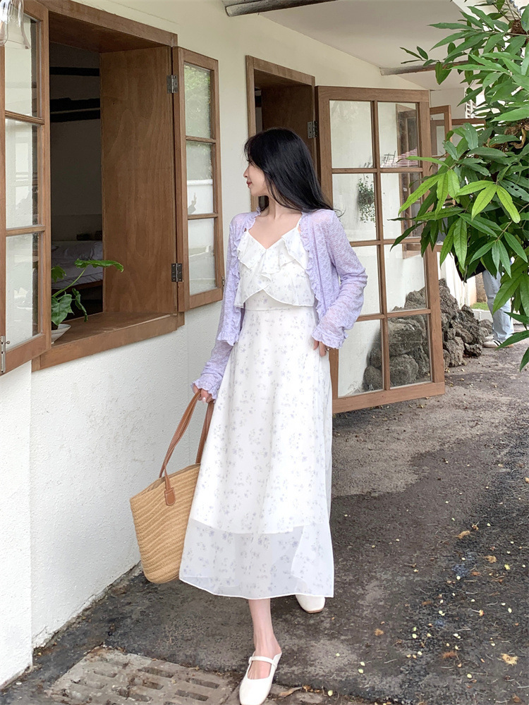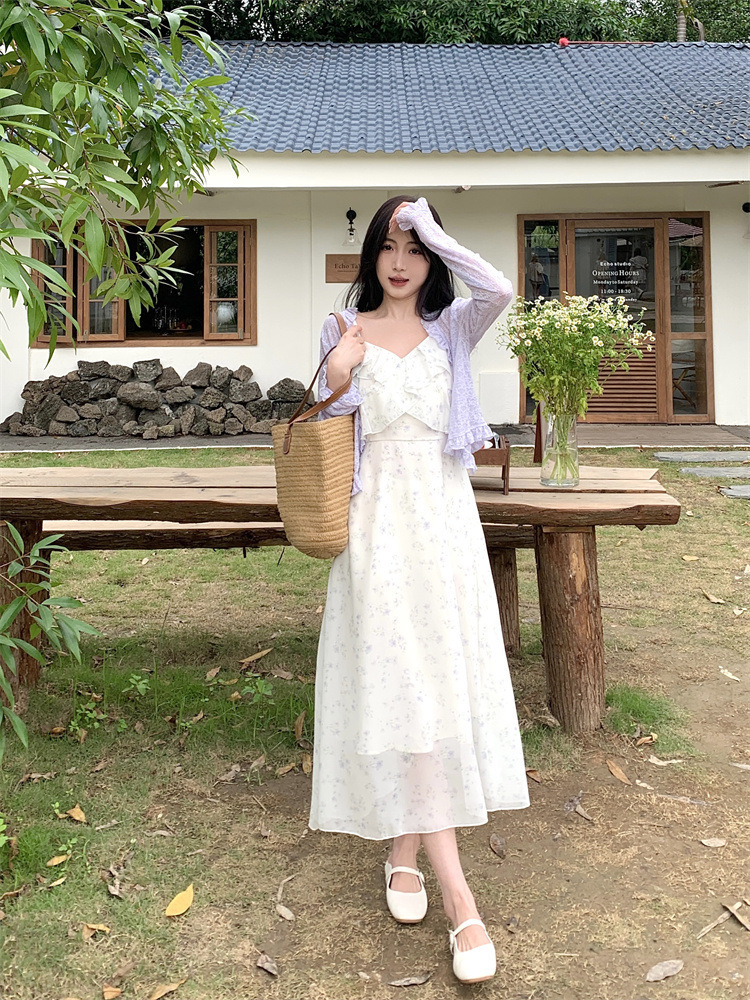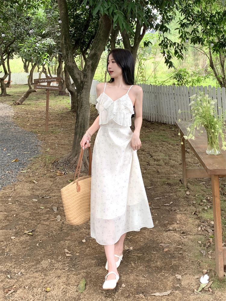 플러스 사이즈 프렌치 쉬폰 슬링 원피스 여성용 여름 스커트 통통녀 슬림 핏 세트 플로럴 원피스 투피스 세트