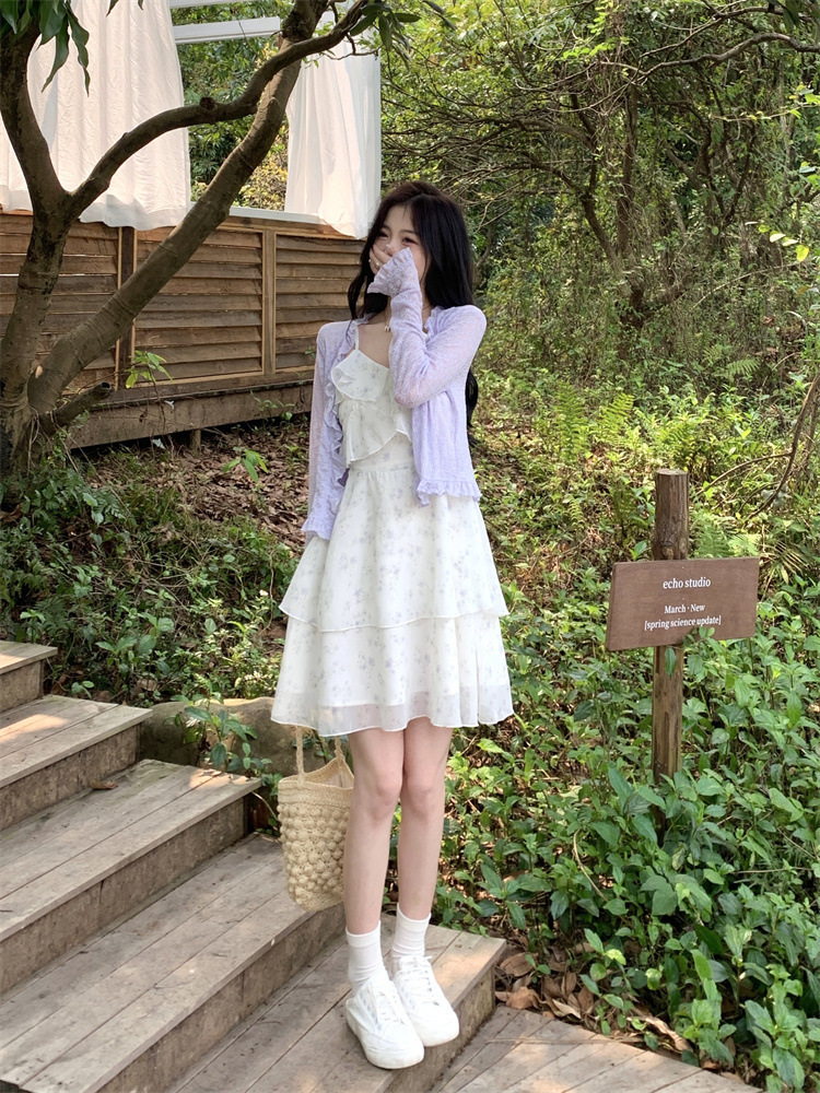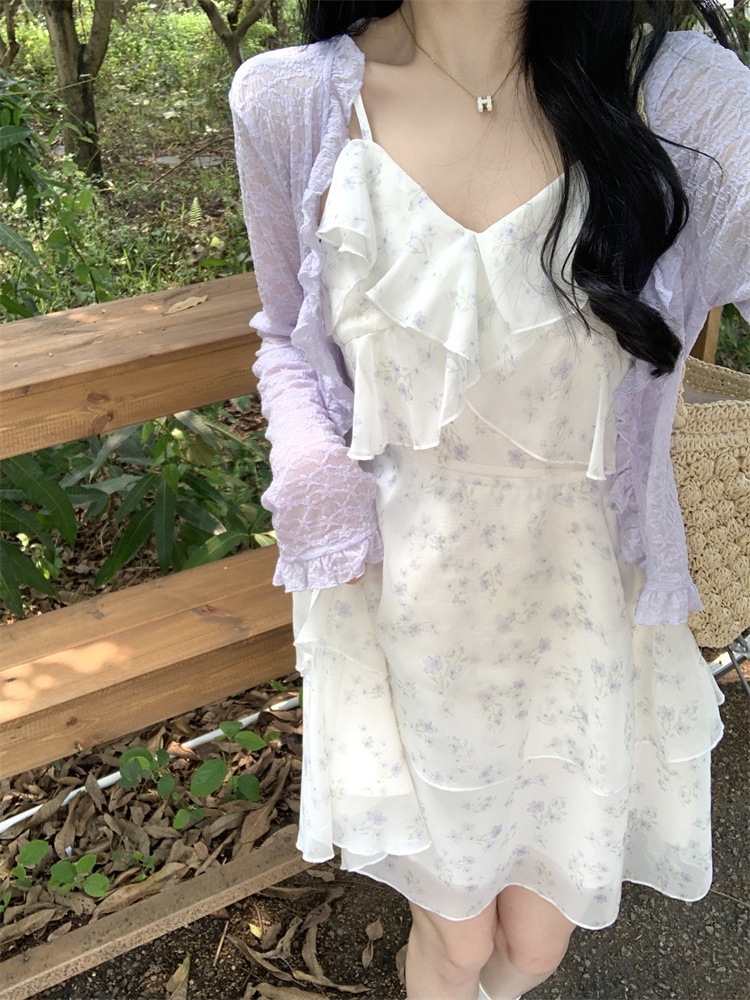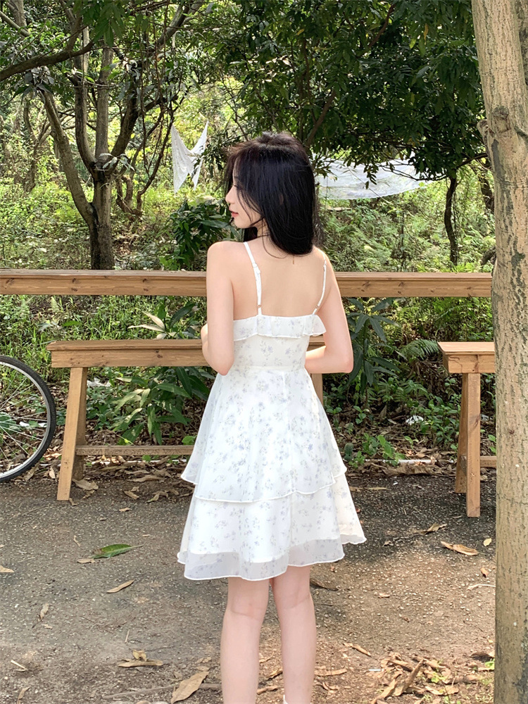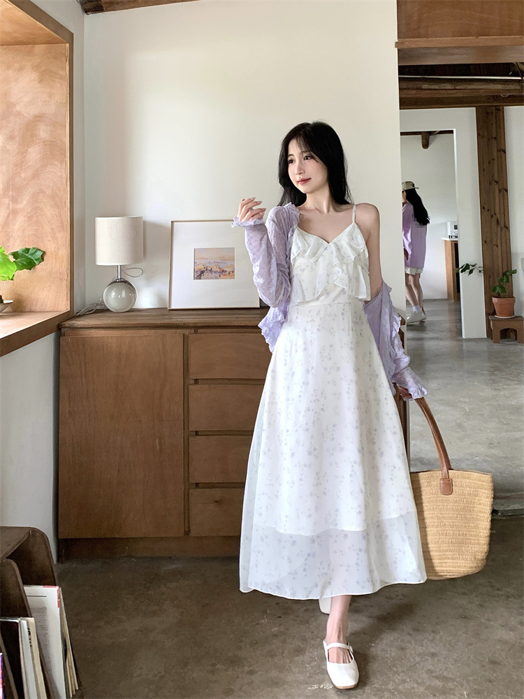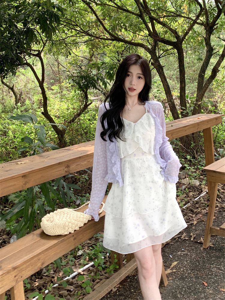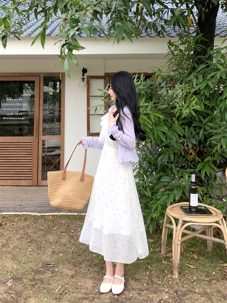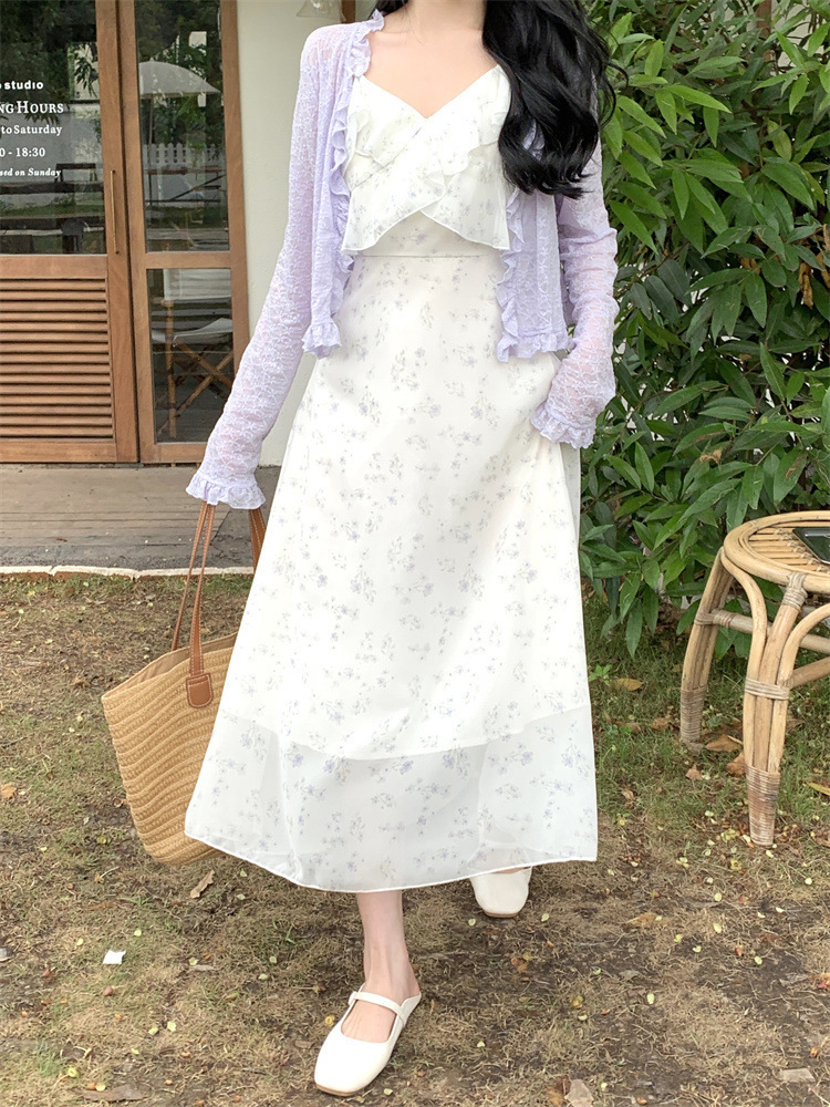 플러스 사이즈 프렌치 쉬폰 슬링 원피스 여성용 여름 스커트 통통녀 슬림 핏 세트 플로럴 원피스 투피스 세트