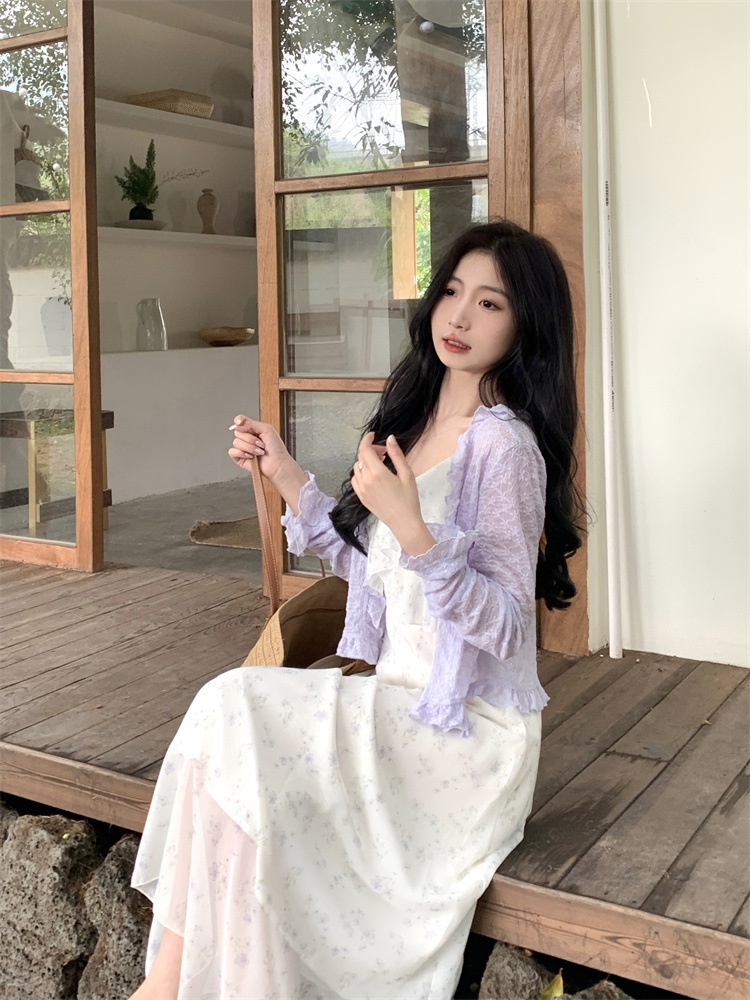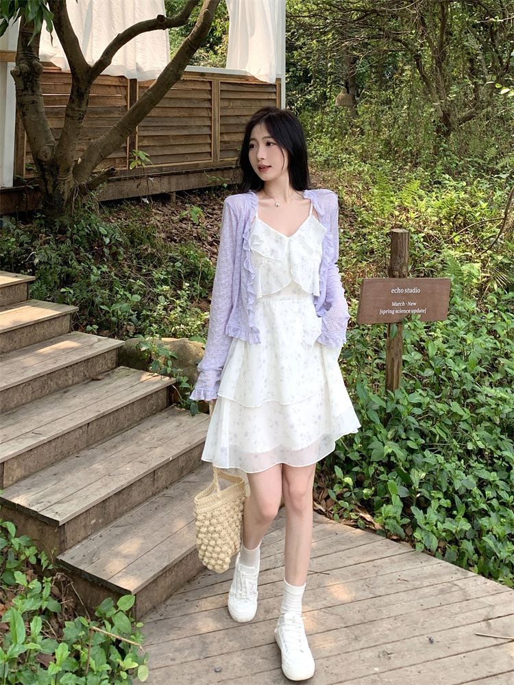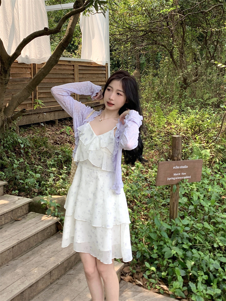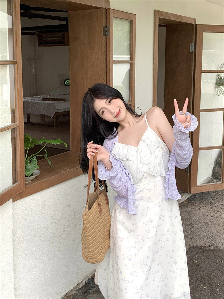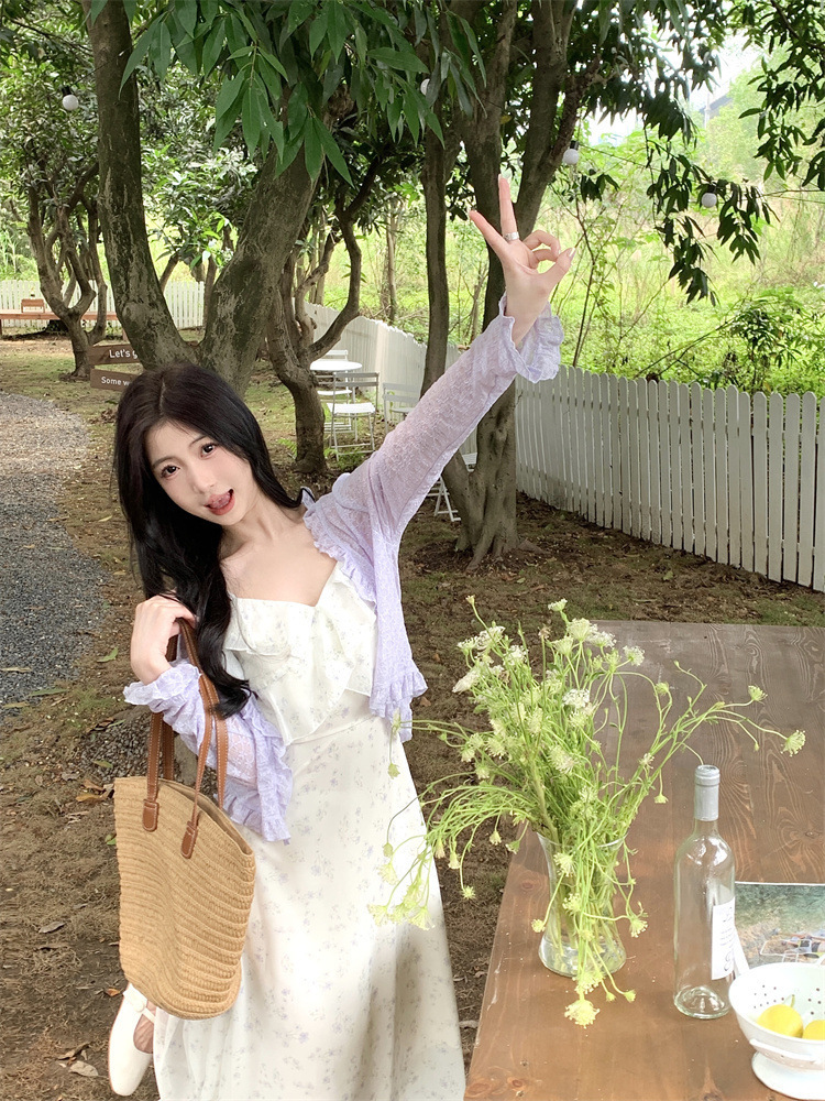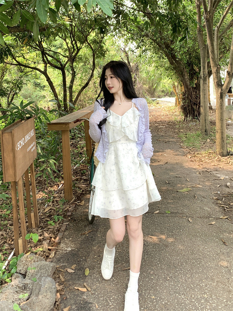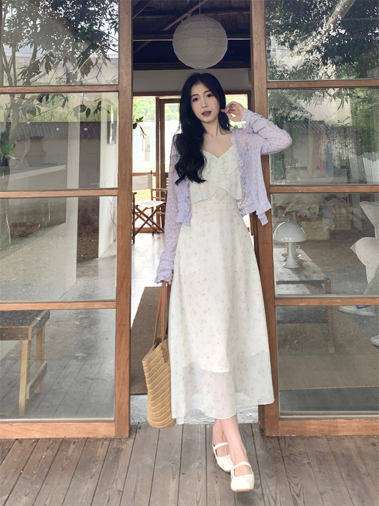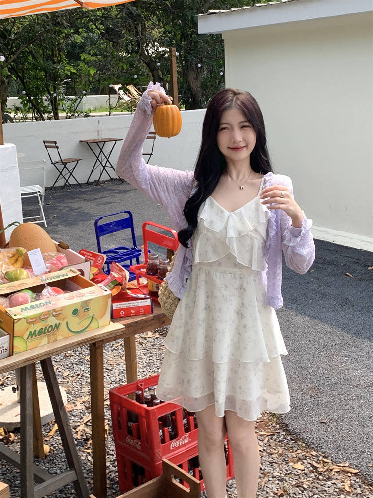 플러스 사이즈 프렌치 쉬폰 슬링 원피스 여성용 여름 스커트 통통녀 슬림 핏 세트 플로럴 원피스 투피스 세트