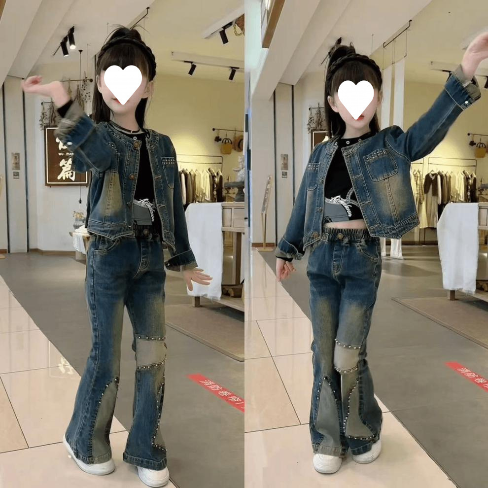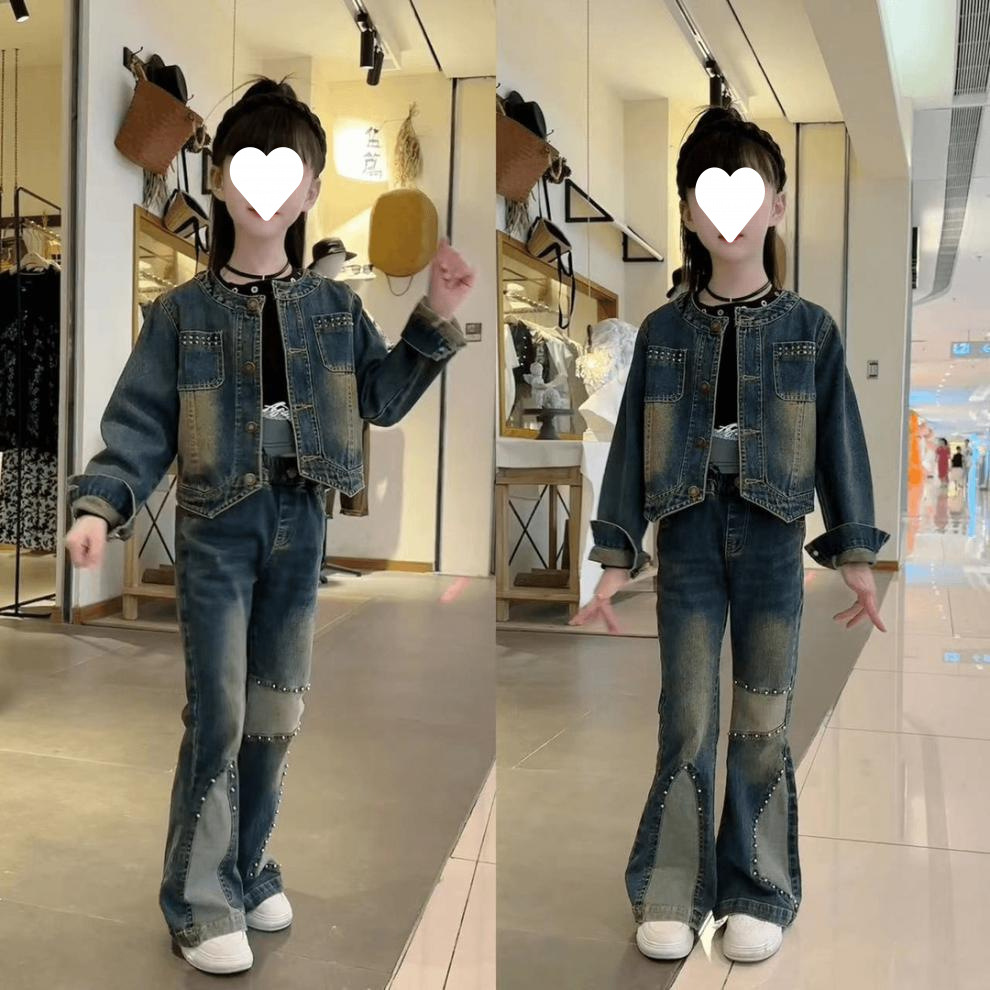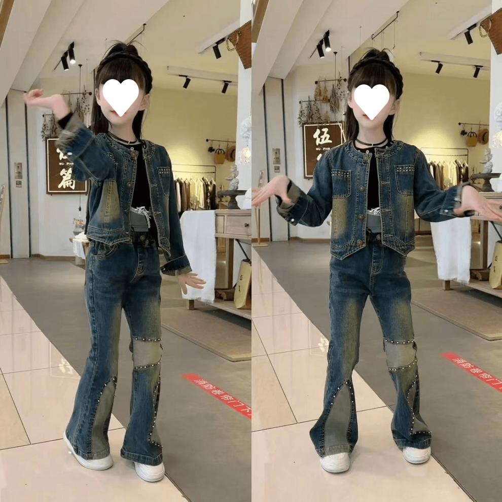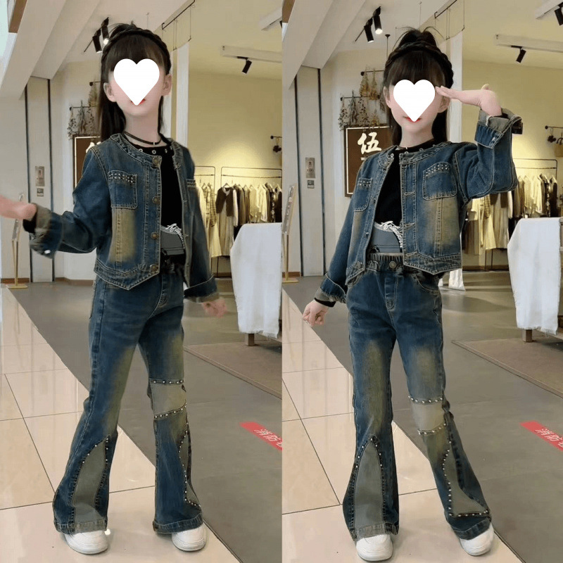 소녀의 봄과 가을 새로운 한국 스타일 유행 짧은 데님 바지 세트 소녀 투피스 세트스토어 가기