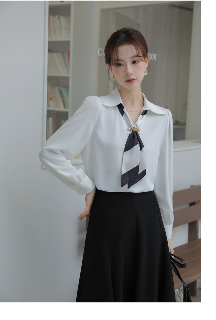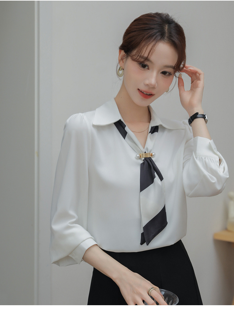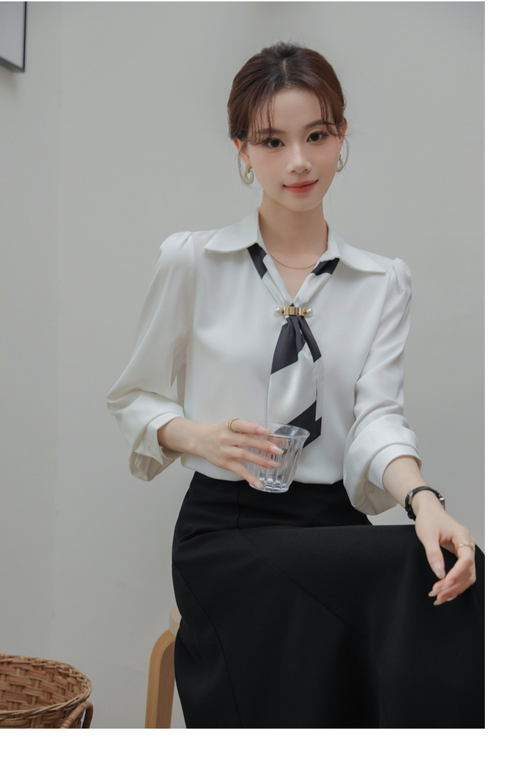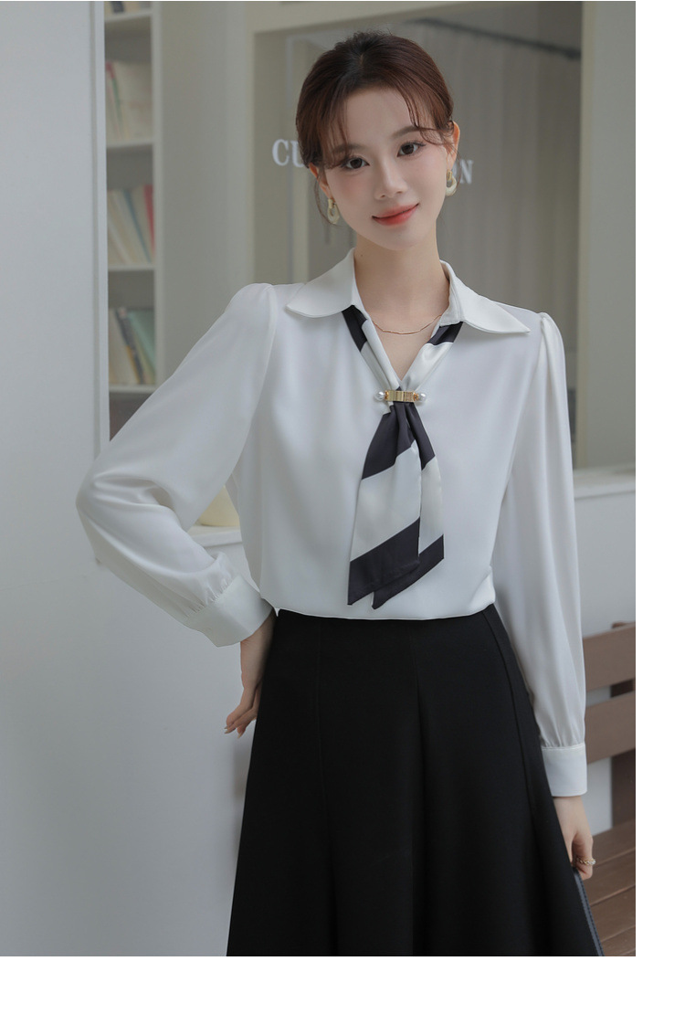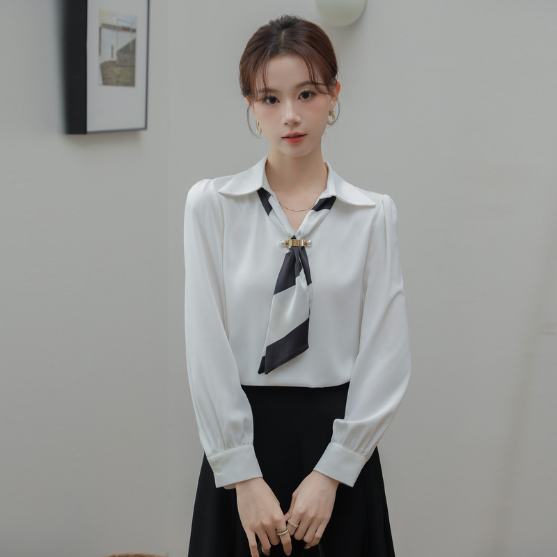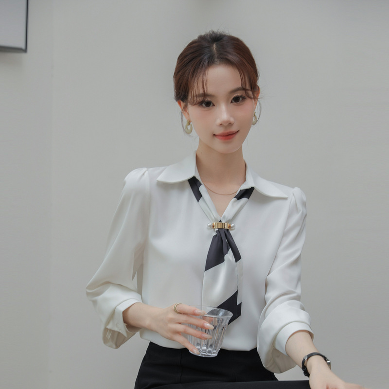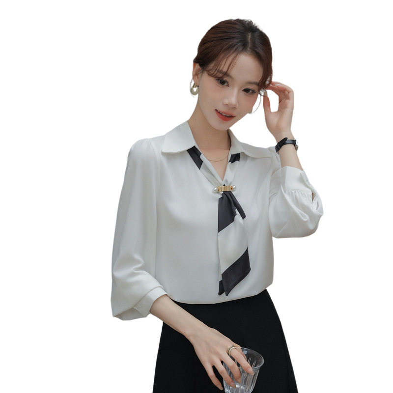 화이트 셔츠 여성의 2025 새로운 가을 V-넥 커리어 통근 인터뷰 스트랩 프랑스 유행 우아한 여성 셔츠스토어 가기