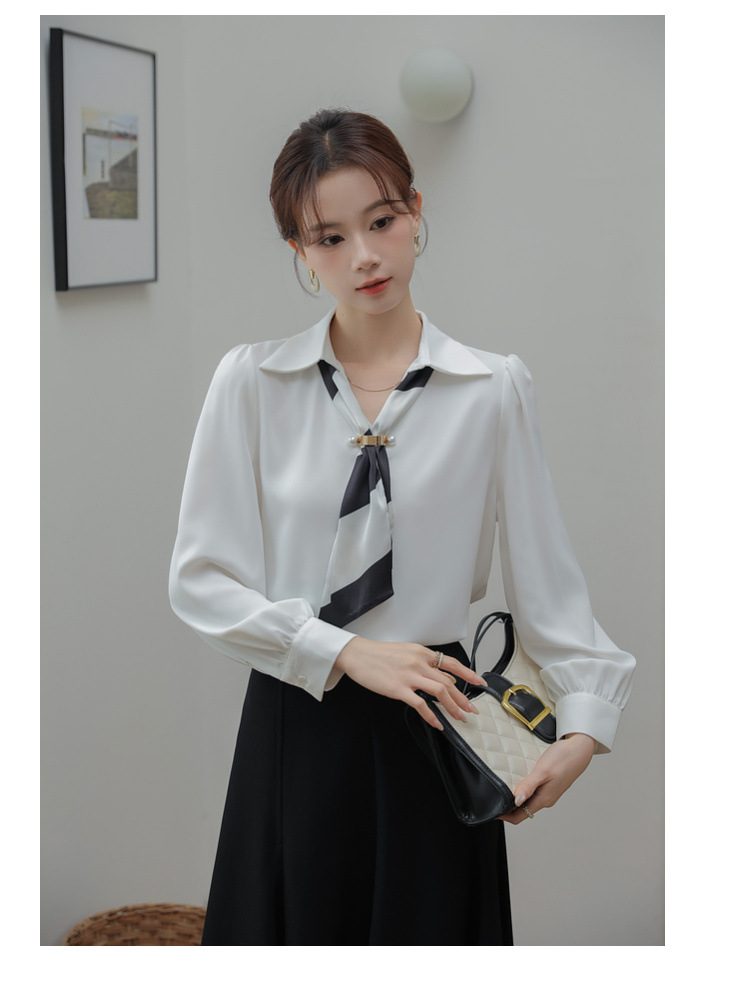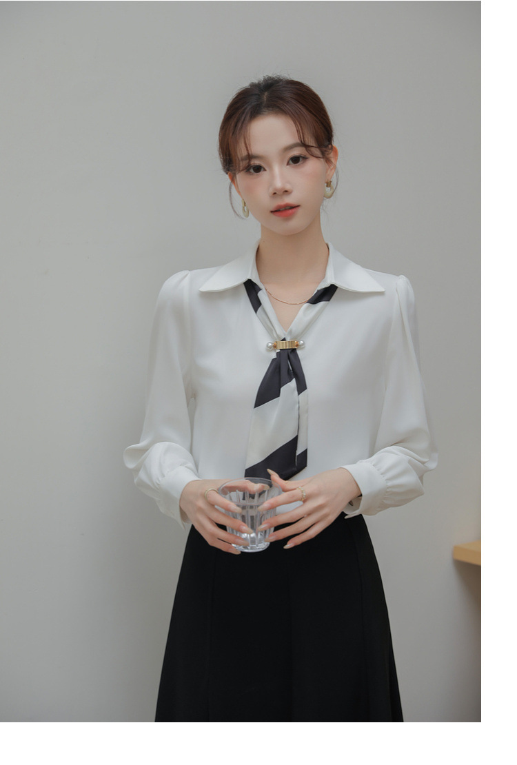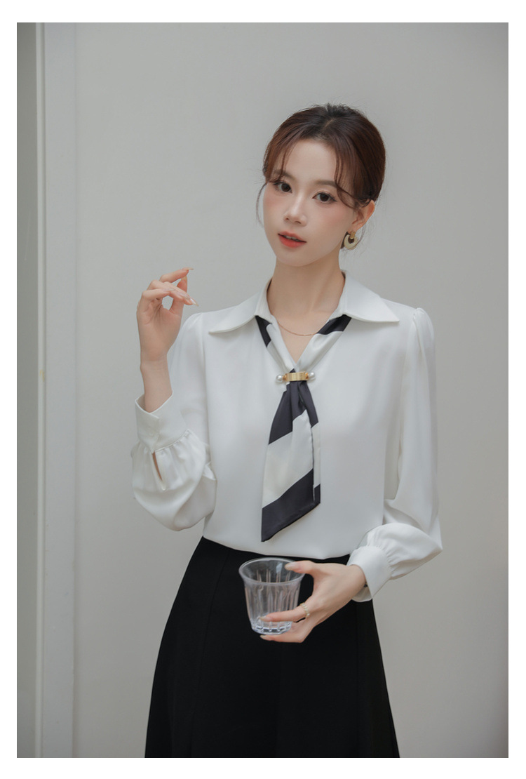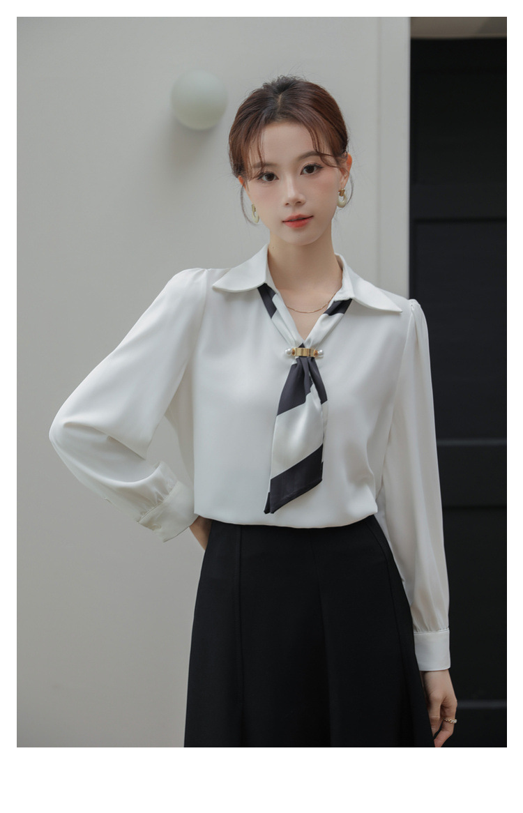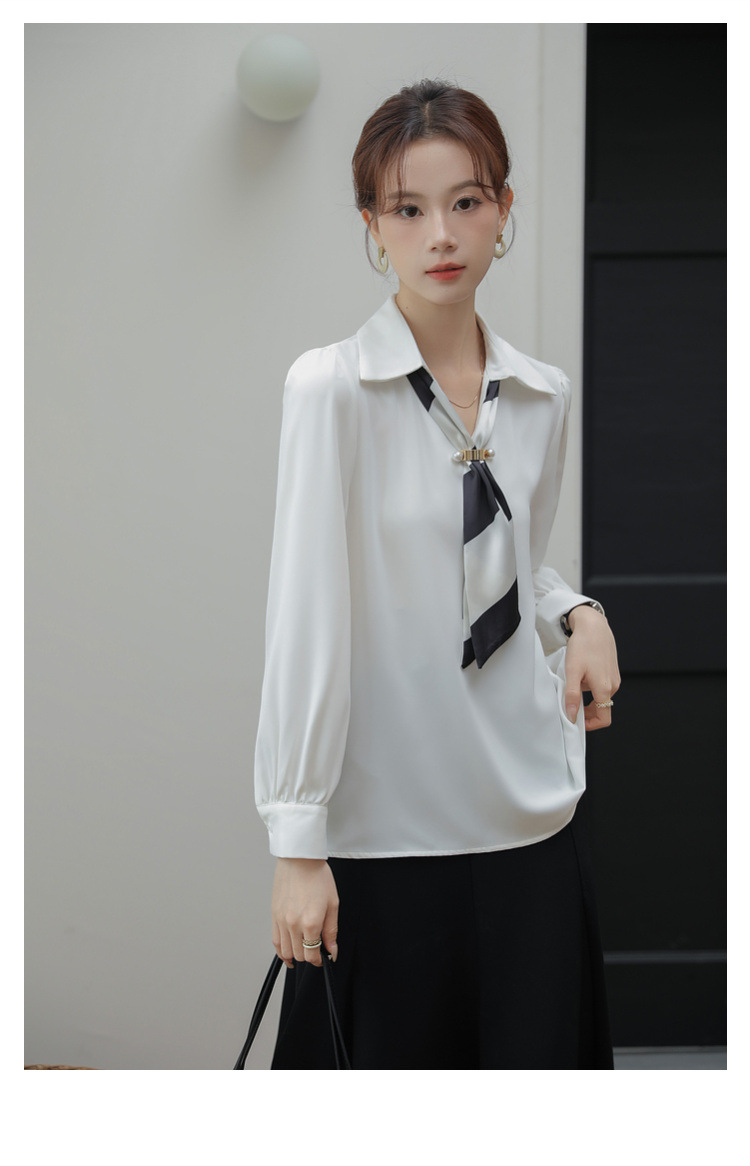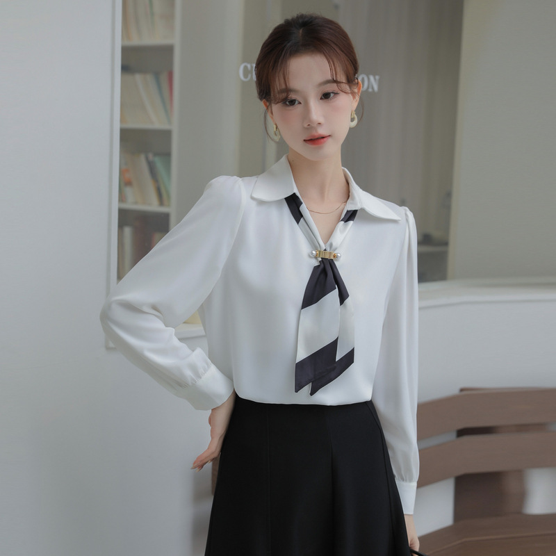화이트 셔츠 여성의 2025 새로운 가을 V-넥 커리어 통근 인터뷰 스트랩 프랑스 유행 우아한 여성 셔츠스토어 가기