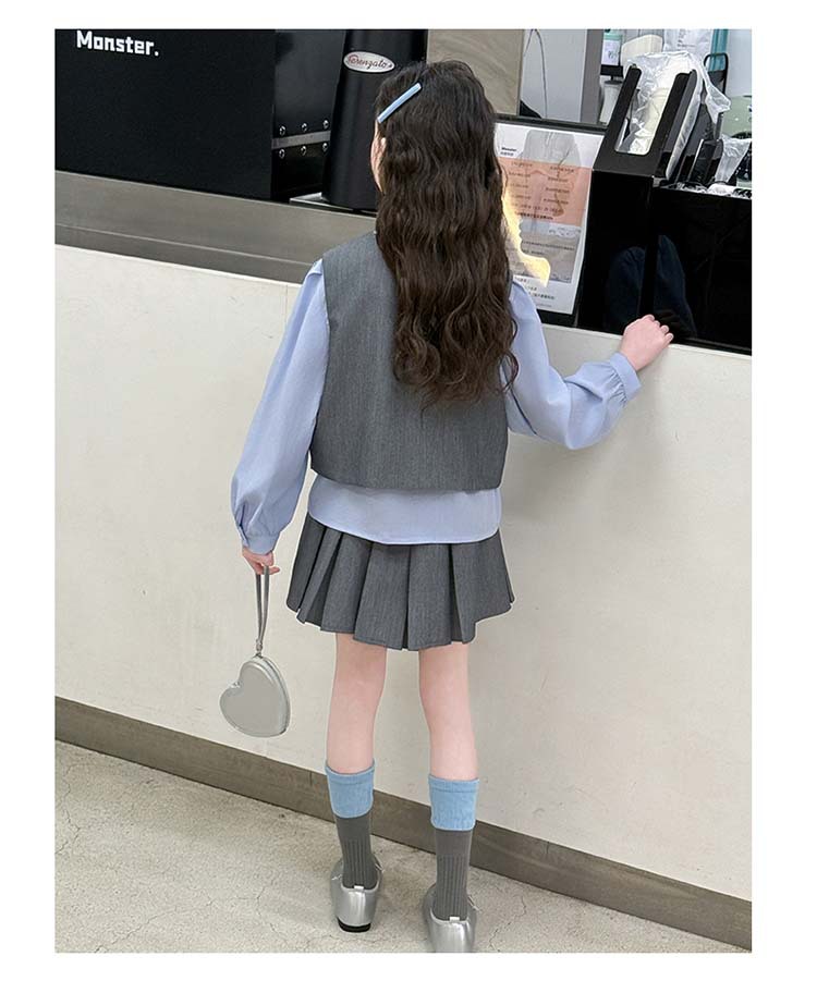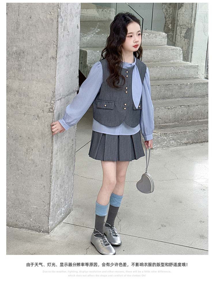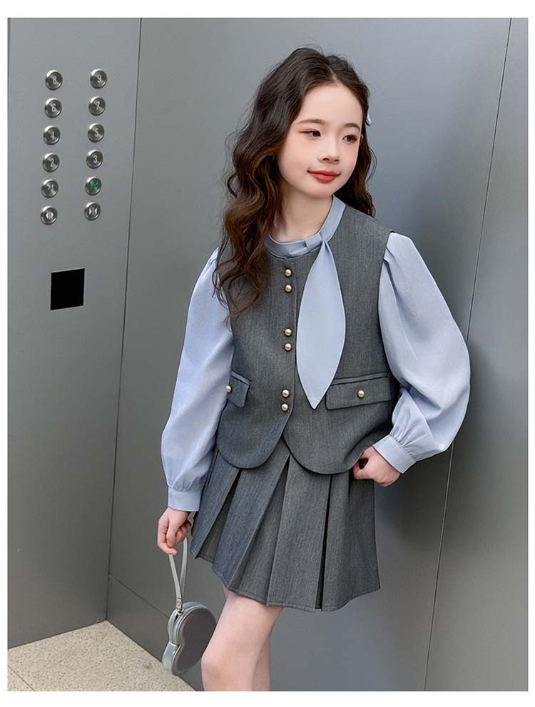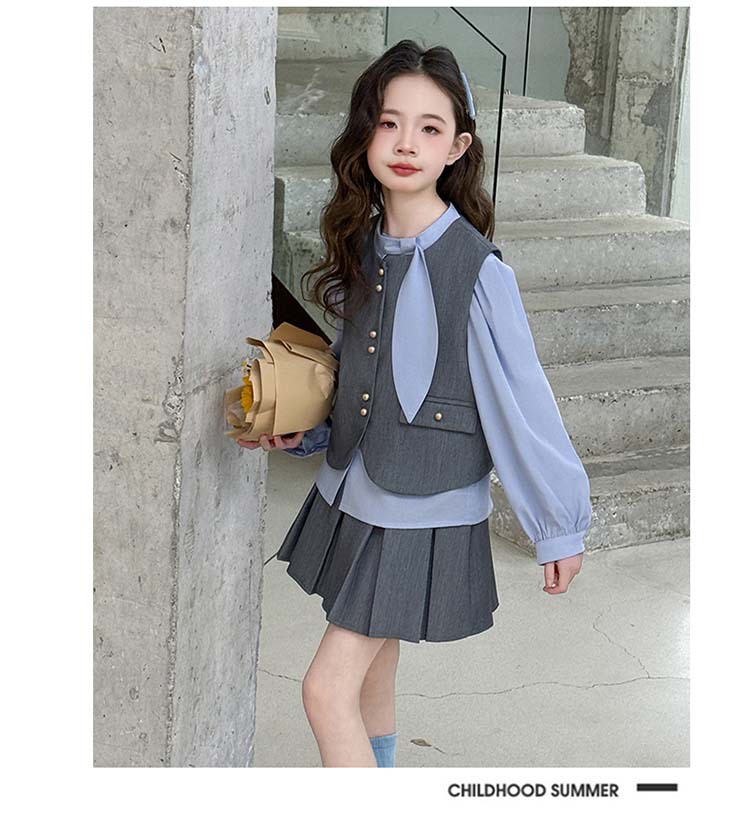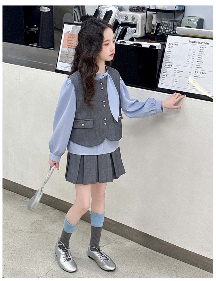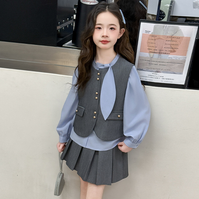 여자 세트 봄 2025 새로운 어린이 셔츠 JK 치마 대학 스타일 3 피스 세트 소녀 주름 치마 3 피스 세트