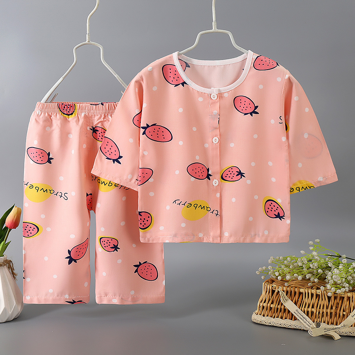 2022 년 아동면 실크 잠옷 세트 여름 아기 얇은 카디건 홈 의류 면 실크 에어컨 의류 헤어 세대스토어 가기