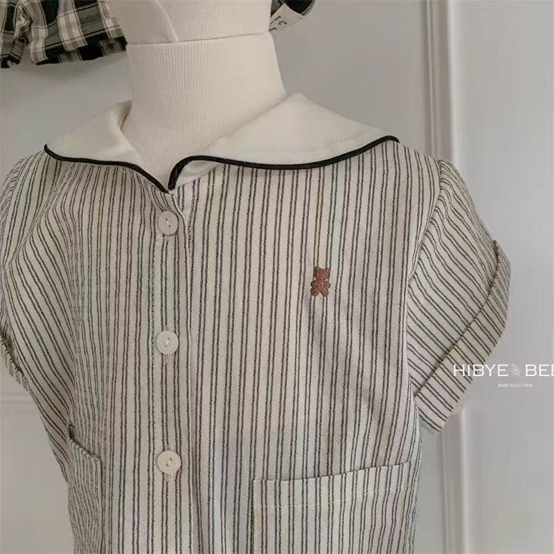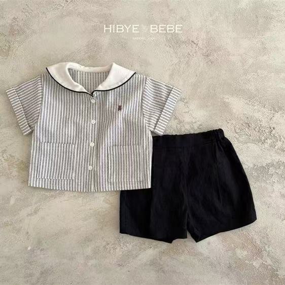 한국 아동복 여름 어린이 소년과 소녀의 해군 칼라 줄무늬 셔츠 면 빈티지 인형 칼라 남성 및 여성 보물 세트스토어 가기