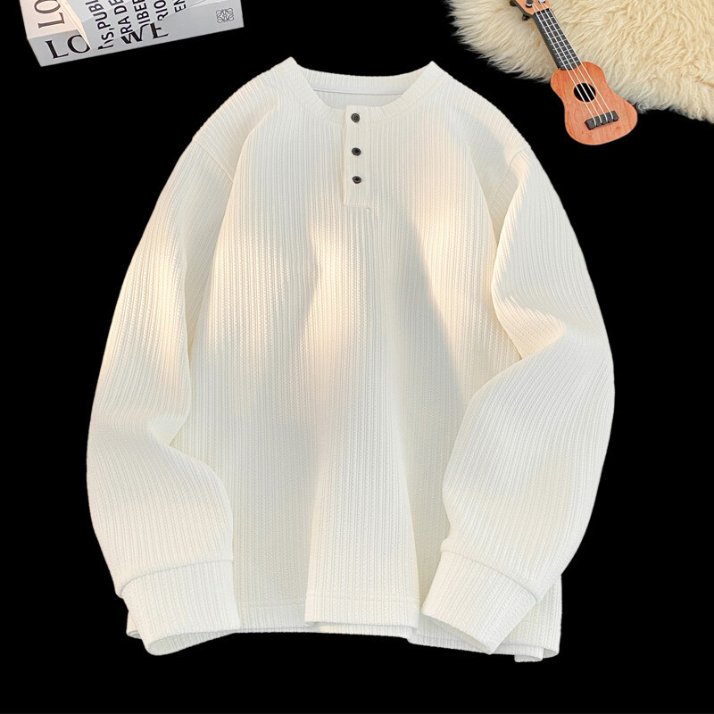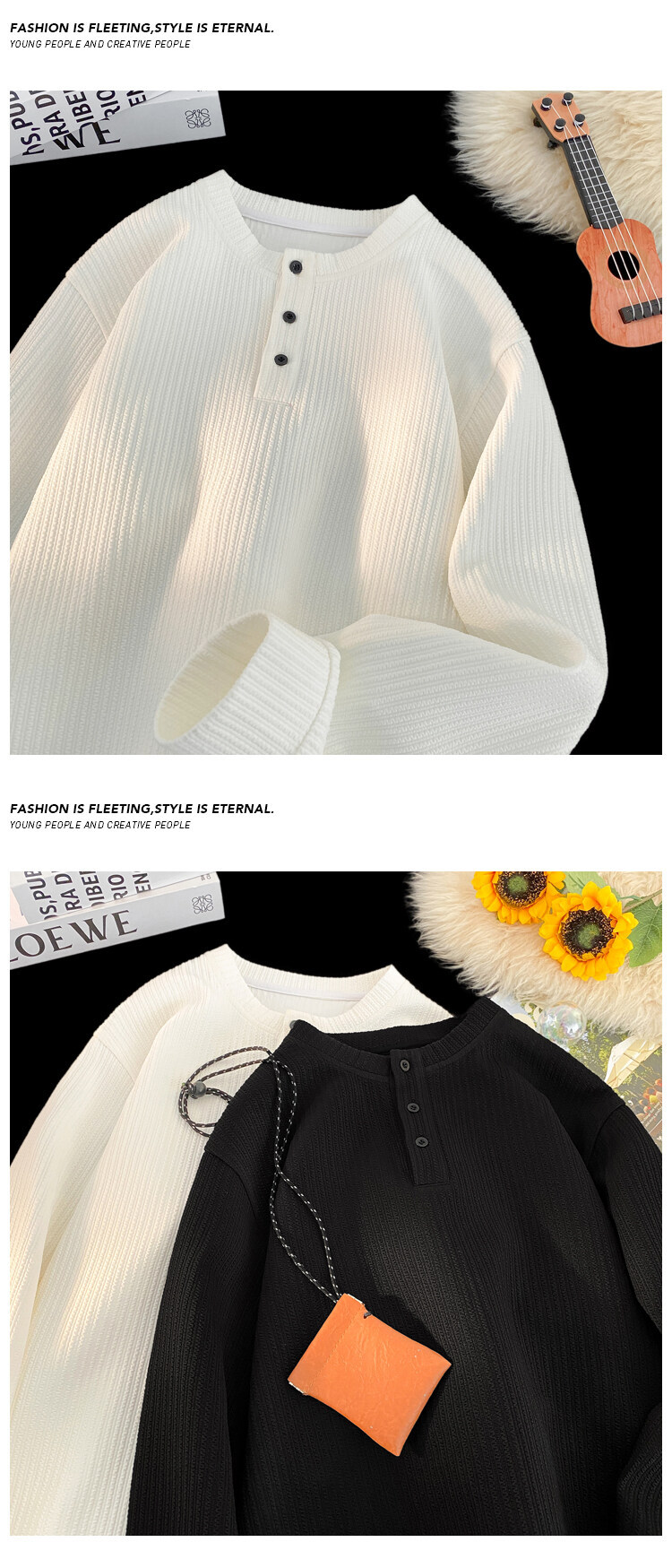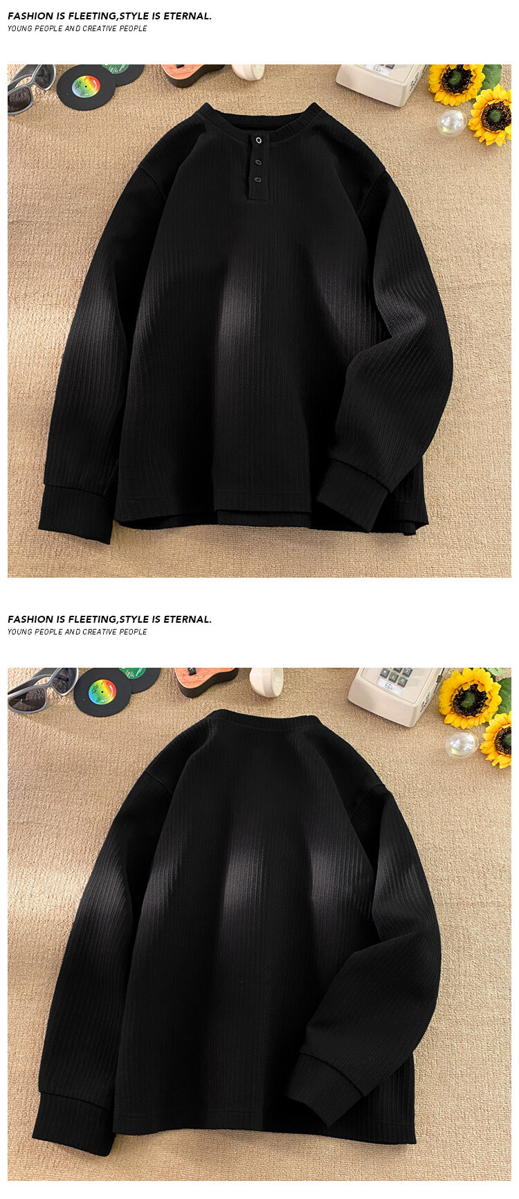 텍스처 긴팔 티셔츠 남성용 봄 미국 캐주얼 스웨터 루즈 커플의 간단한 라운드 넥 탑 버튼 티셔츠