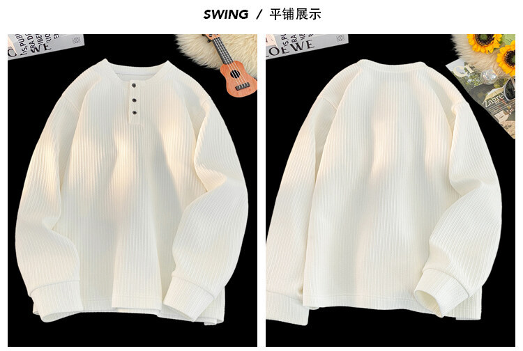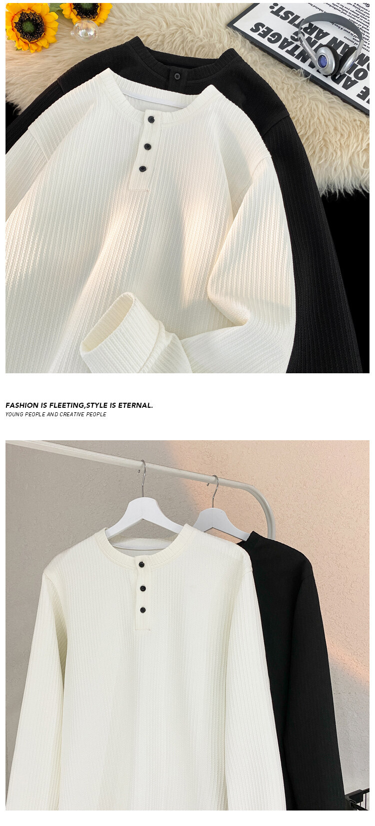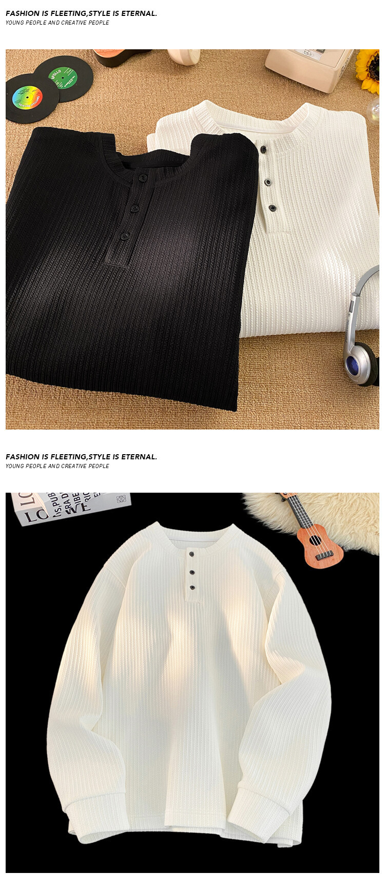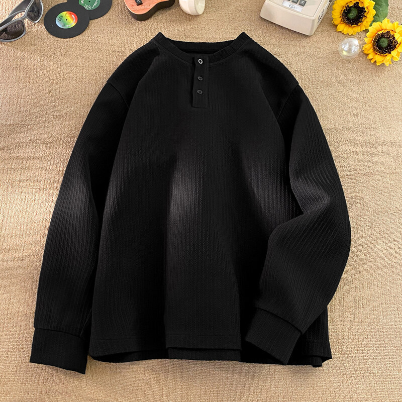 텍스처 긴팔 티셔츠 남성용 봄 미국 캐주얼 스웨터 루즈 커플의 간단한 라운드 넥 탑 버튼 티셔츠