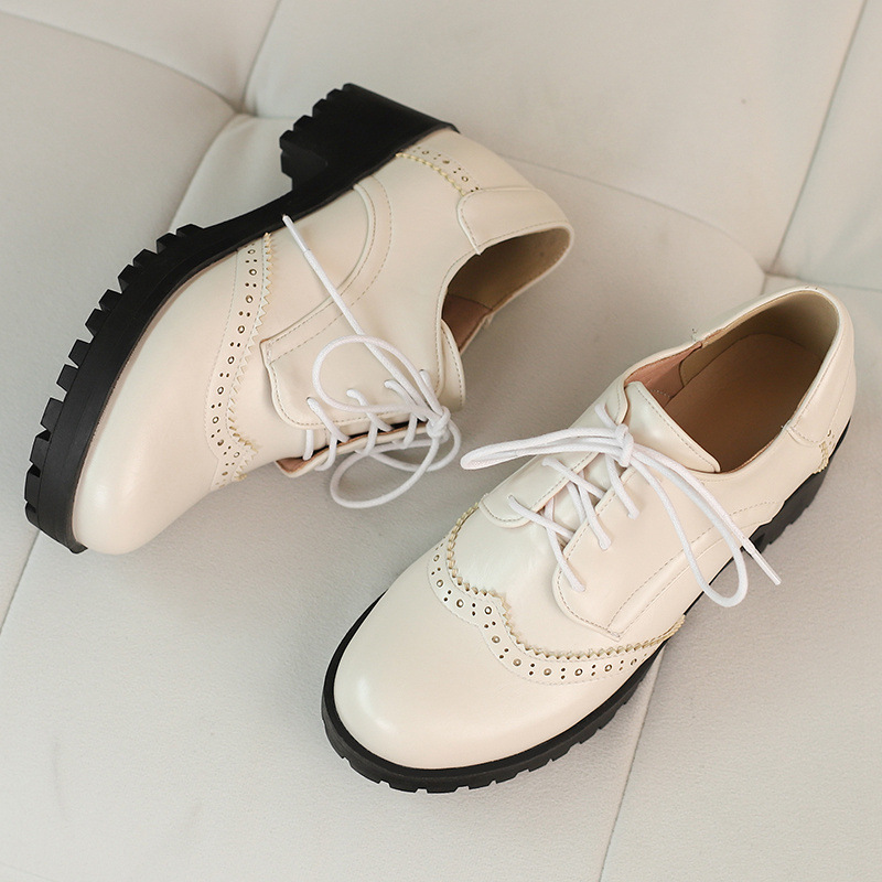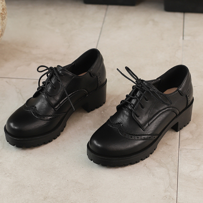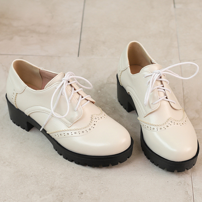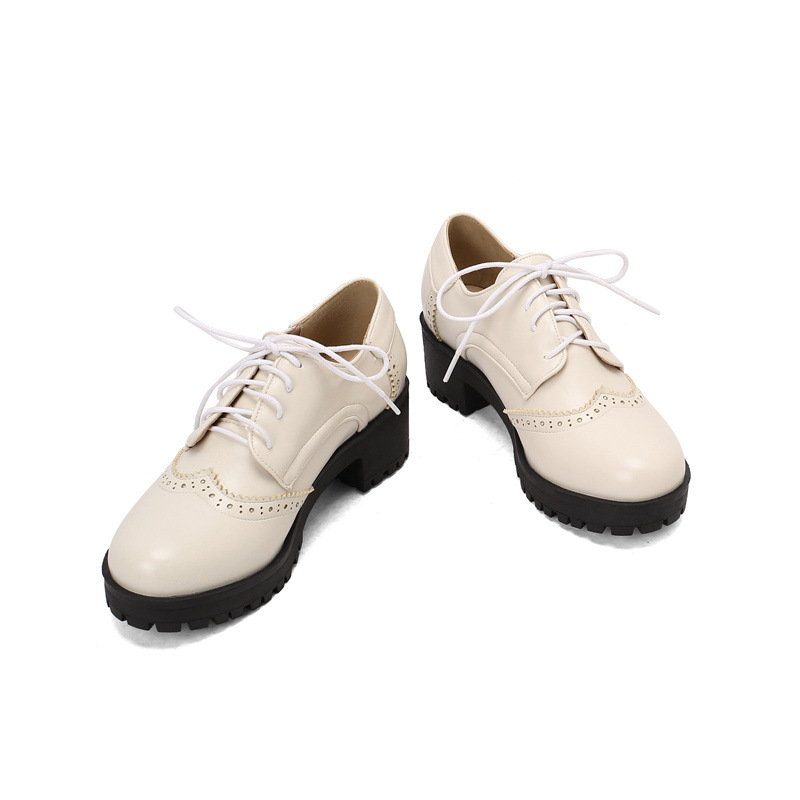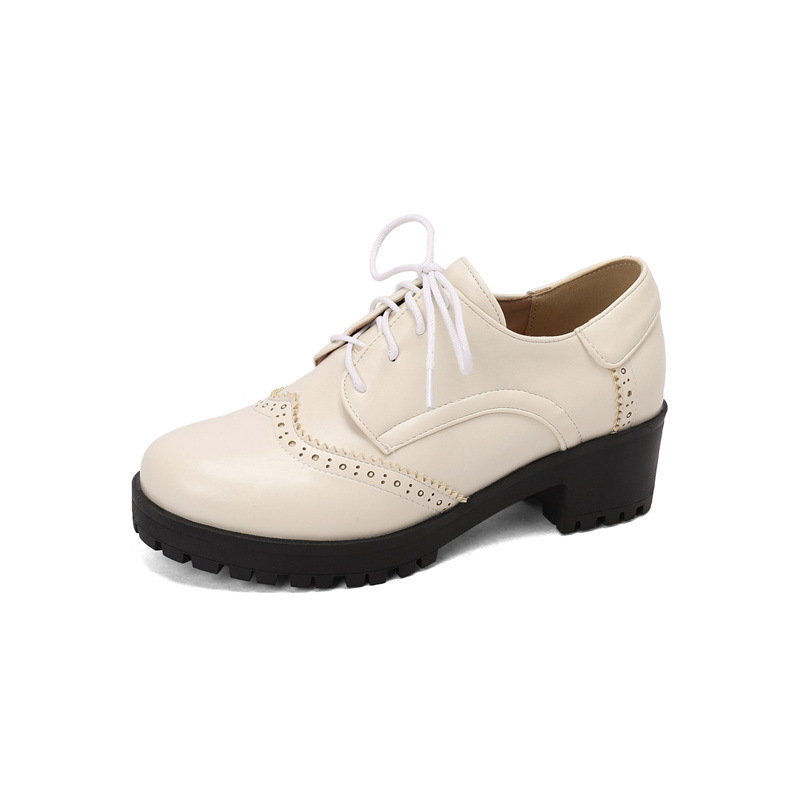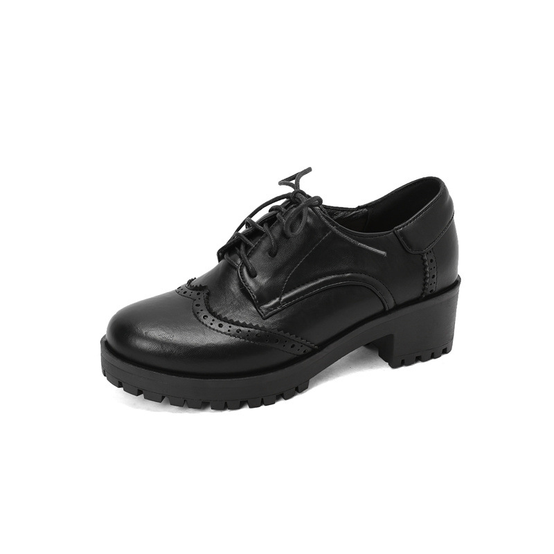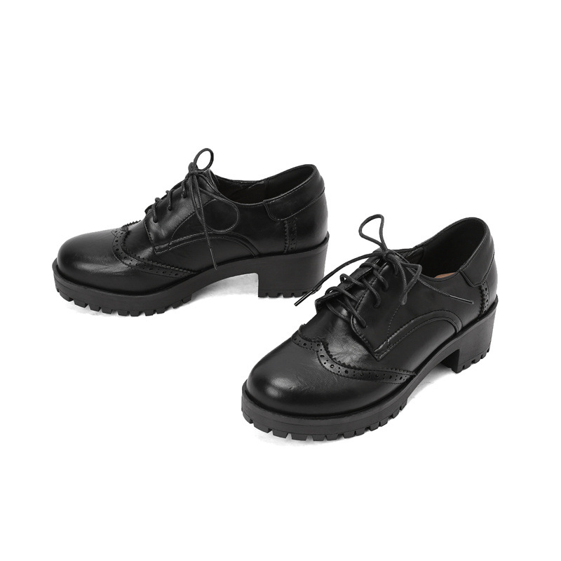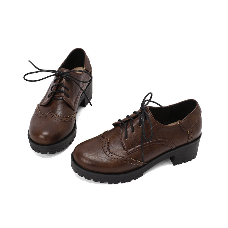 34-45 플러스 사이즈 작은 가죽 신발 봄과 가을 두꺼운 단일 청키 힐 하이힐 레트로 프론트 레이스 업 대외 무역 국경 여성 신발
