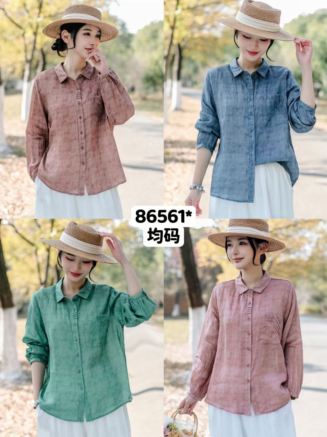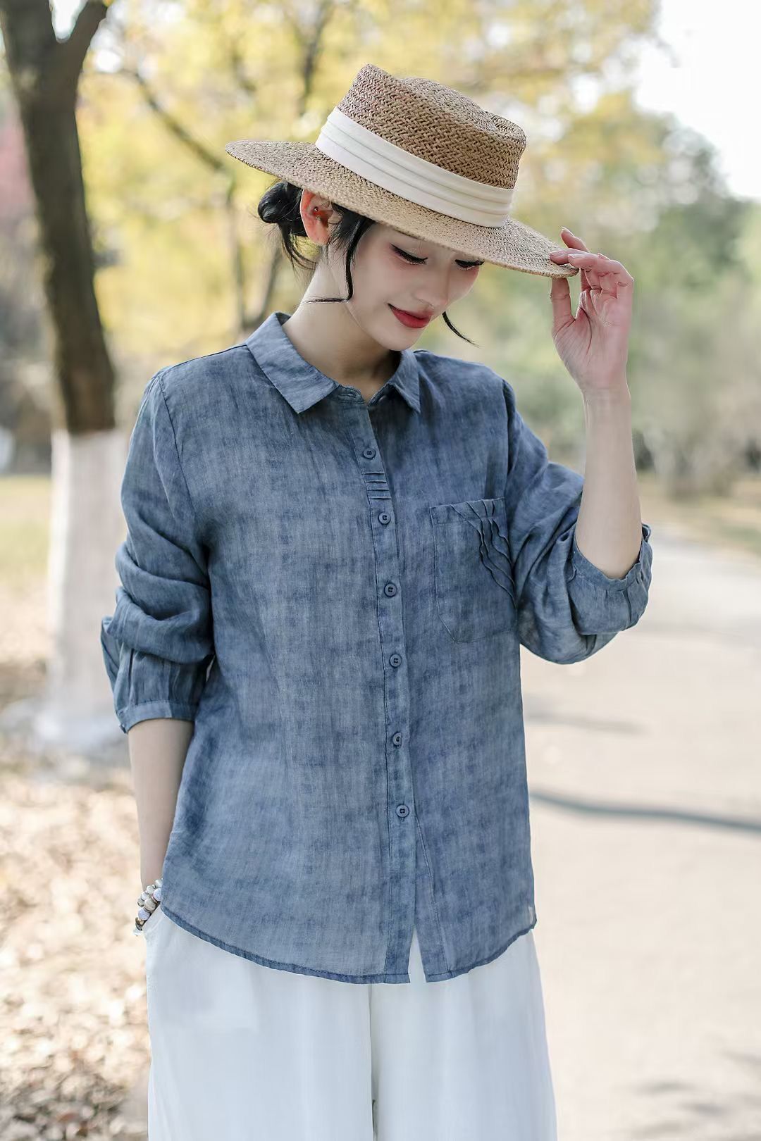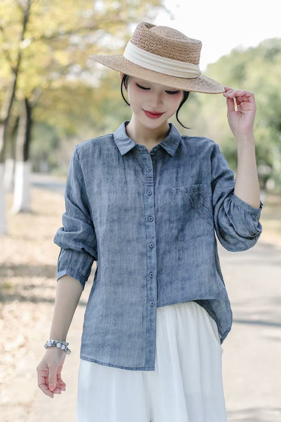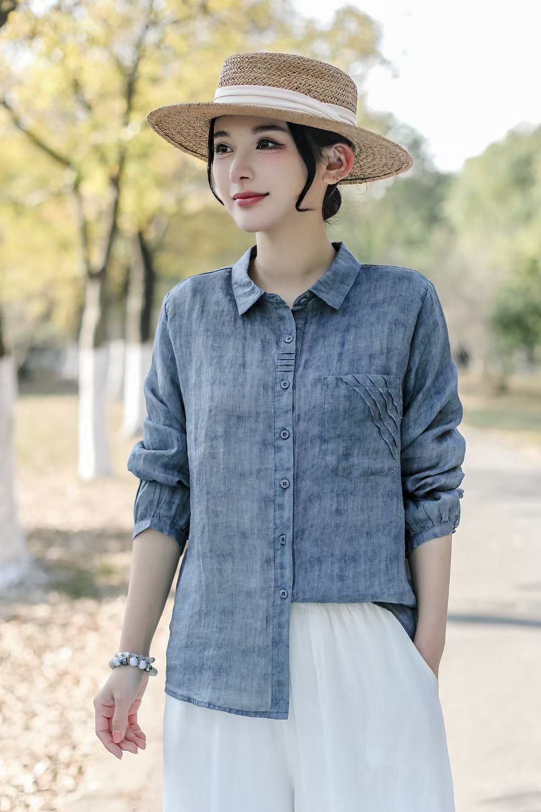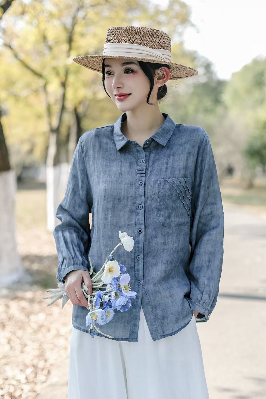 봄 2025 새로운 예술적 복고풍 느슨한 옷깃 셔츠 옷깃 포켓 주름 셔츠스토어 가기