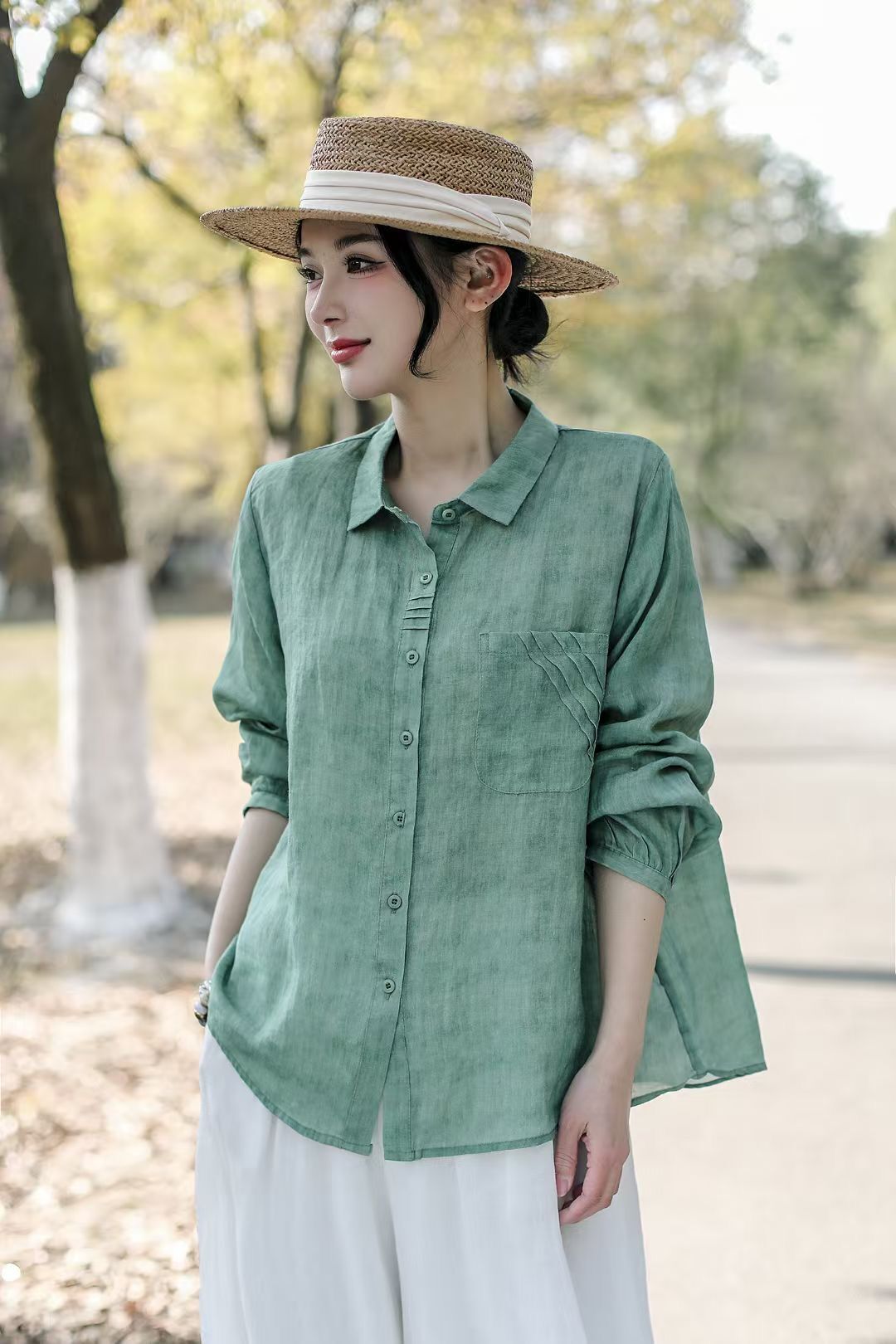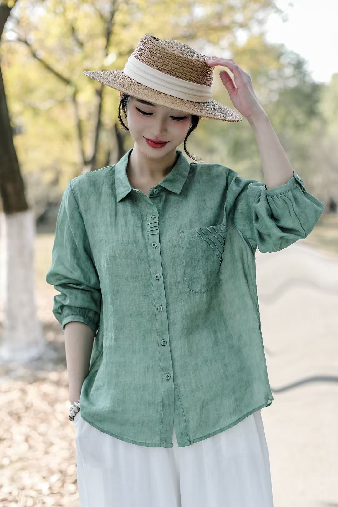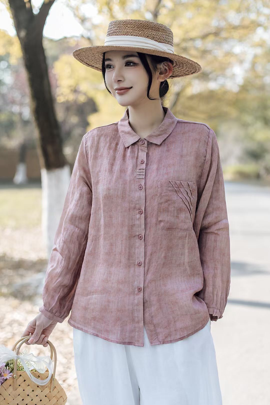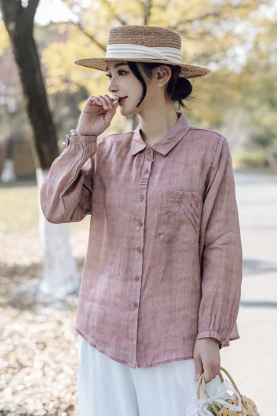 봄 2025 새로운 예술적 복고풍 느슨한 옷깃 셔츠 옷깃 포켓 주름 셔츠