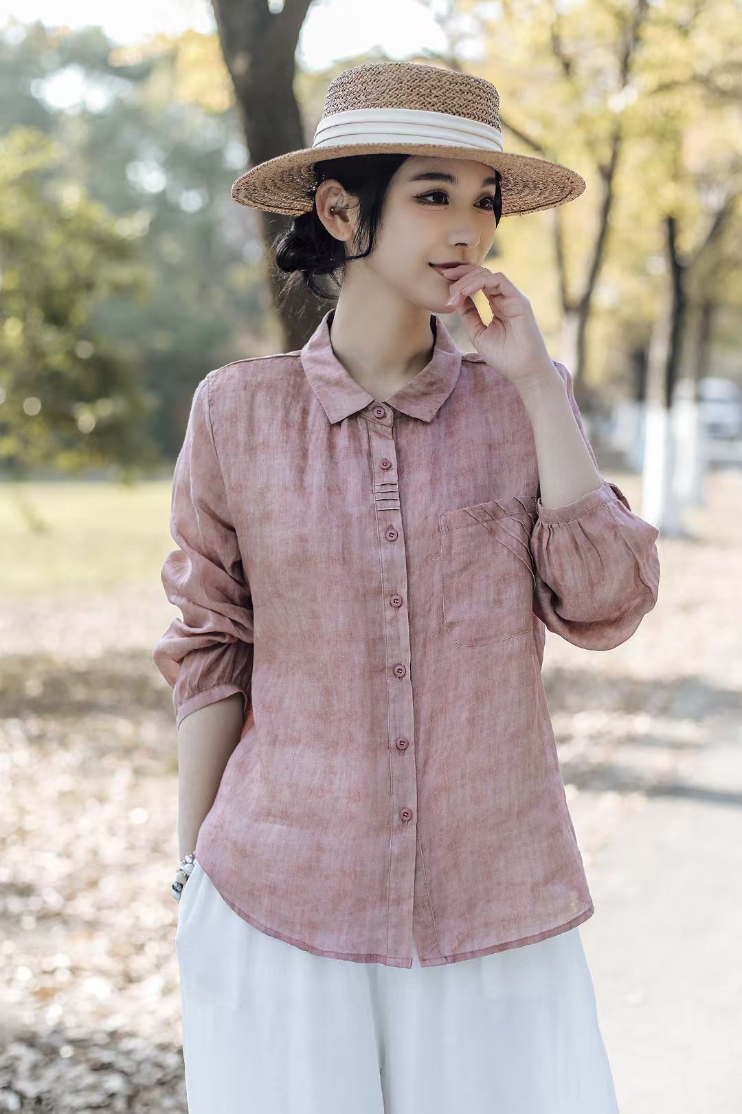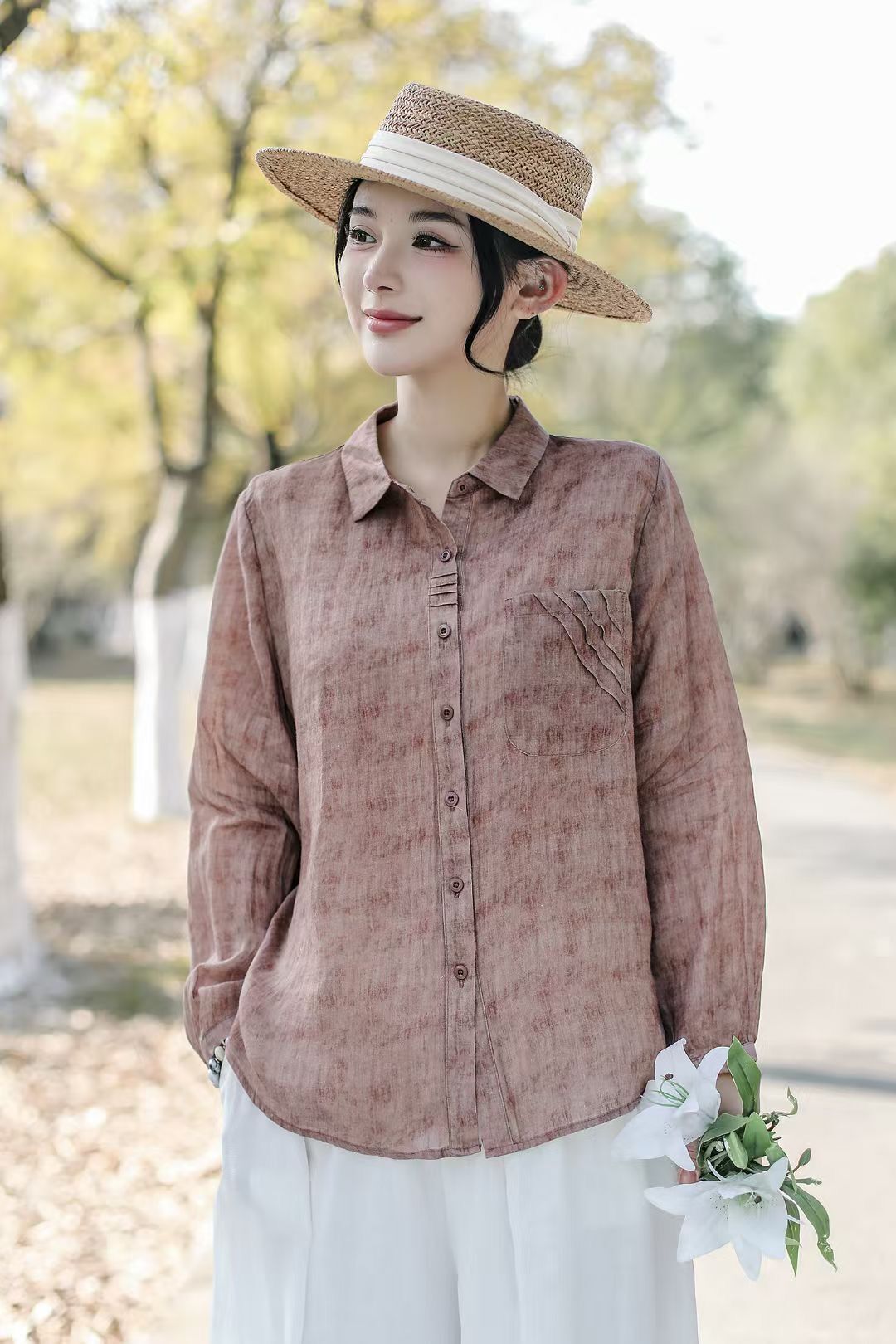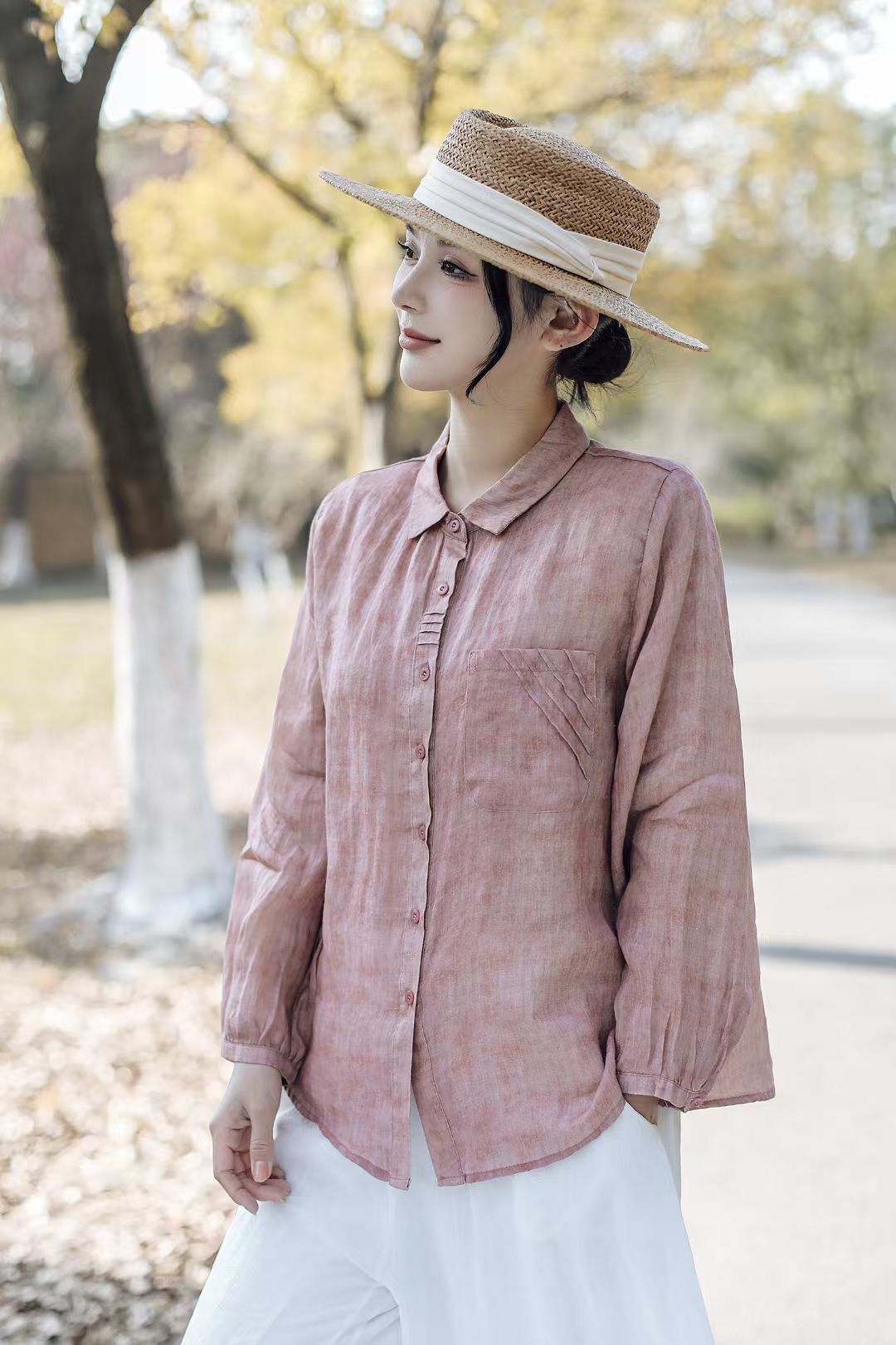 봄 2025 새로운 예술적 복고풍 느슨한 옷깃 셔츠 옷깃 포켓 주름 셔츠