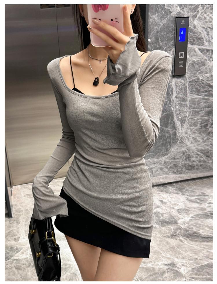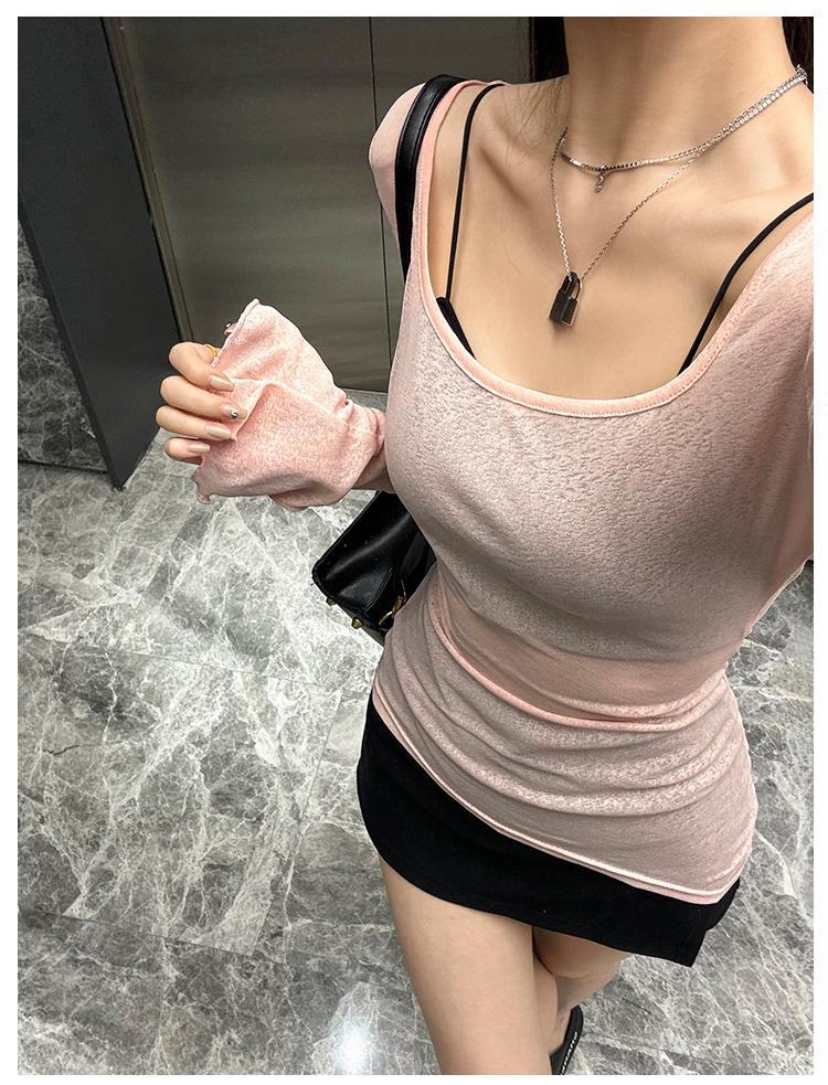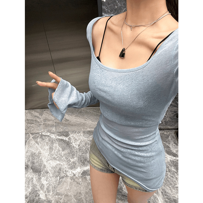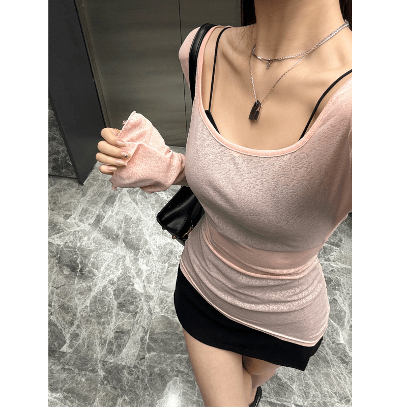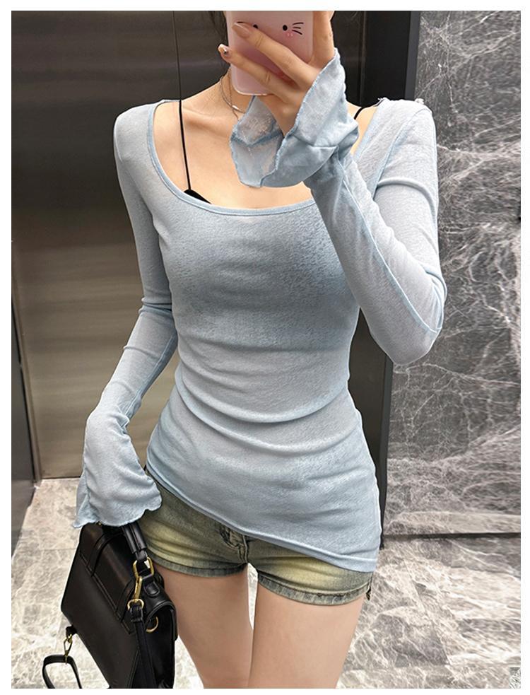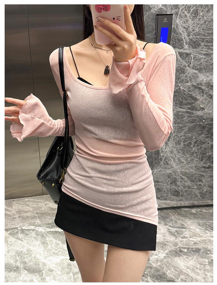 2025 핑크 U 넥 긴팔 티셔츠 여성용 여름 슬림 핏 슬리밍 트럼펫-소매 긴 T 달콤한 스파이스 소녀 섹시한 탑