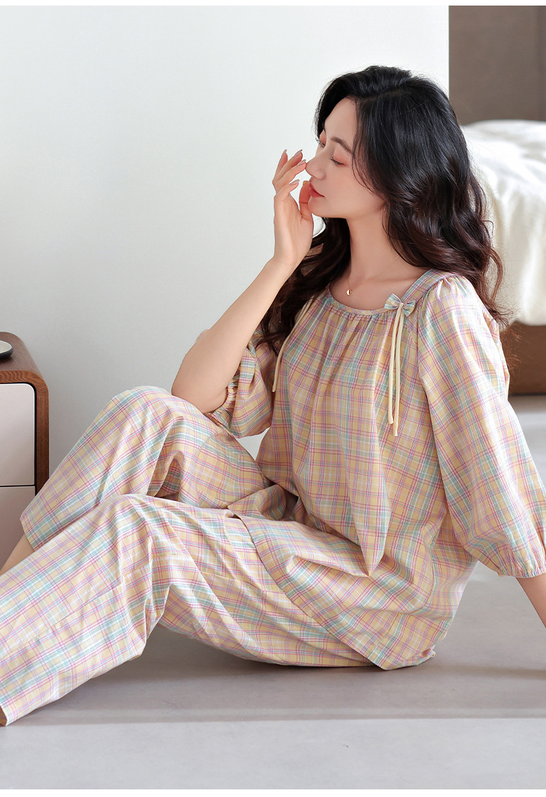 잠옷 여성의 봄과 여름 면화 슬리브 바지 중년 어머니 짠 면화 플러스 사이즈 홈 옷 세트