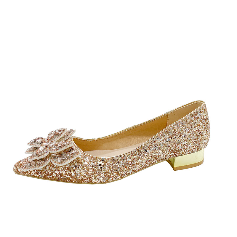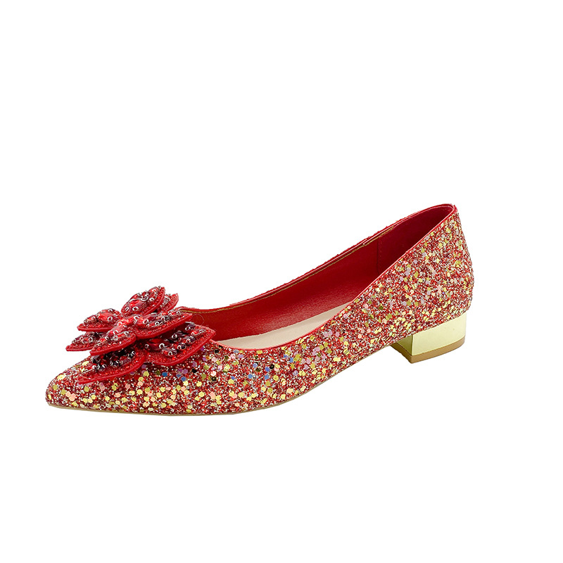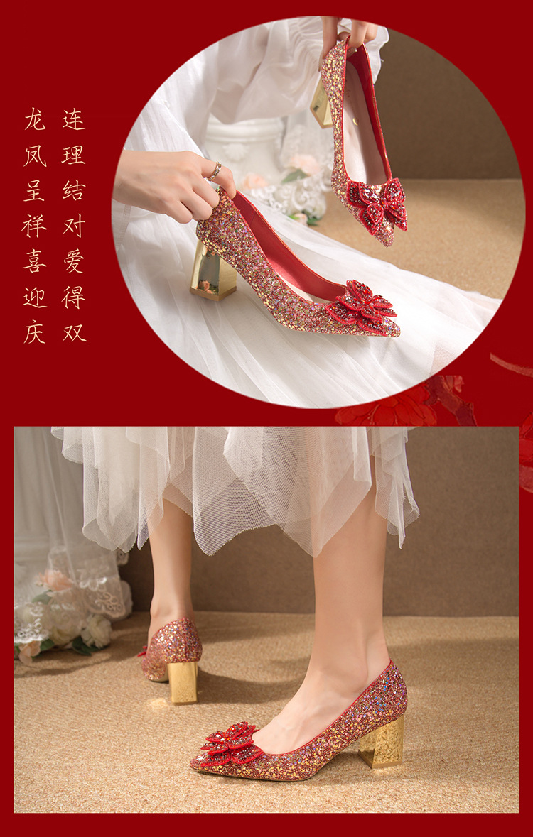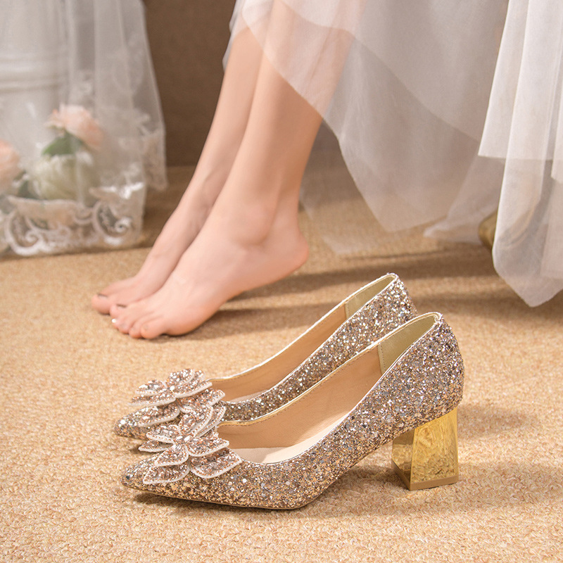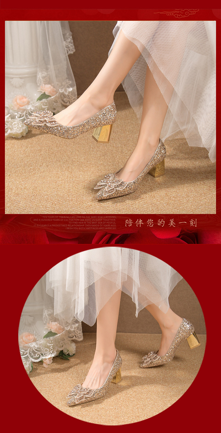 크리스탈 하이힐 여성용 두꺼운 힐 프렌치 스타일 우아한 활 플러스 사이즈 라인석 세퀸 싱글 레이어 신발 Xiuhe 웨딩 슈즈