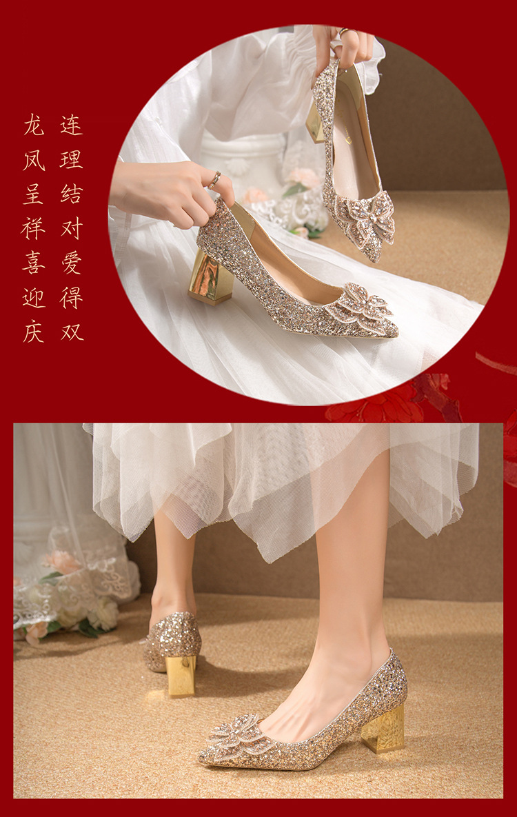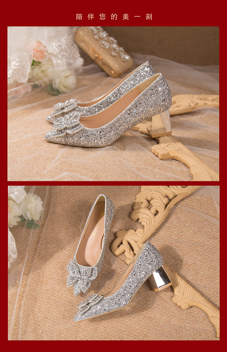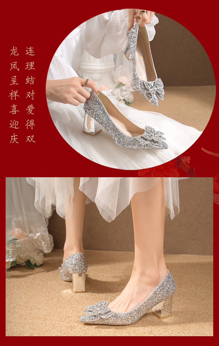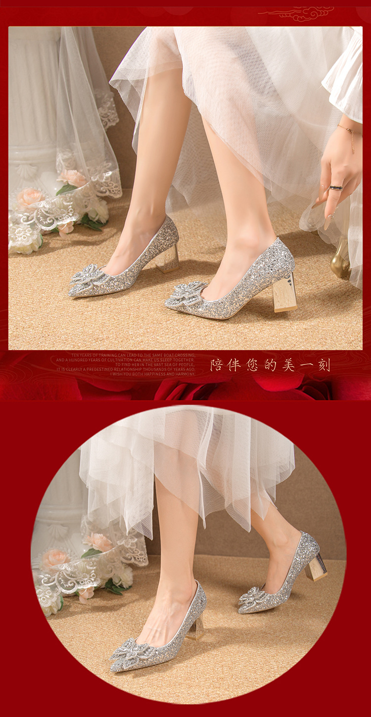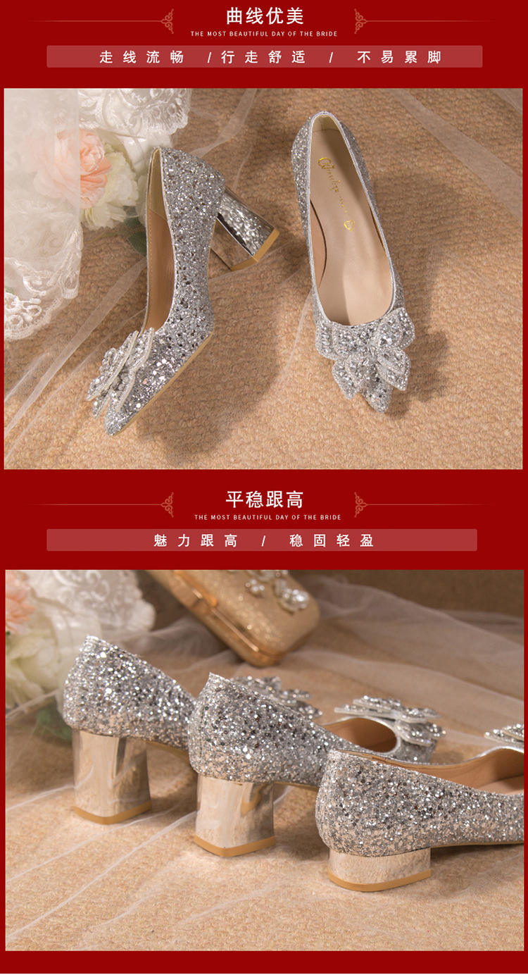 크리스탈 하이힐 여성용 두꺼운 힐 프렌치 스타일 우아한 활 플러스 사이즈 라인석 세퀸 싱글 레이어 신발 Xiuhe 웨딩 슈즈스토어 가기