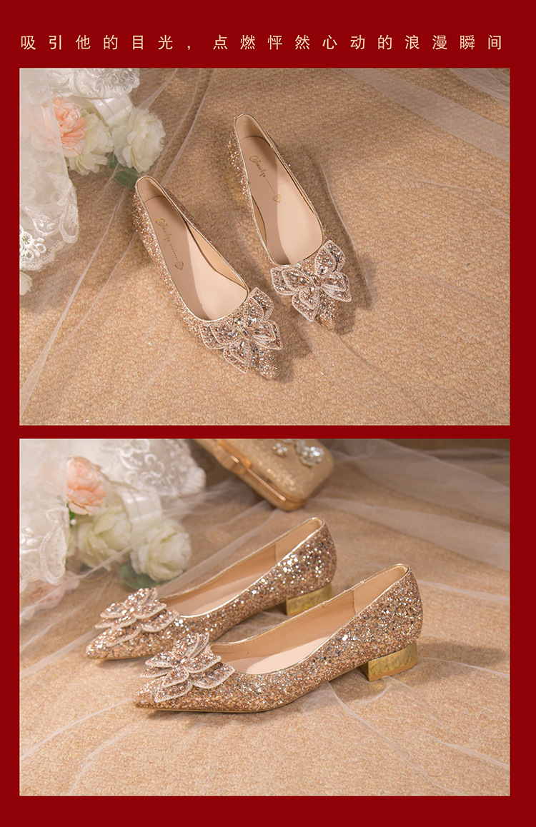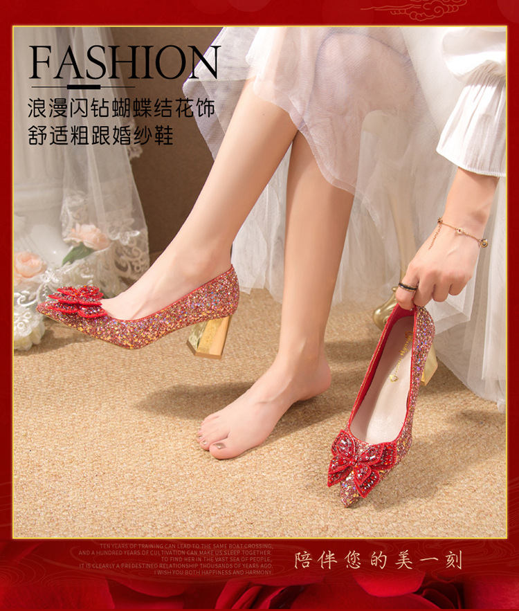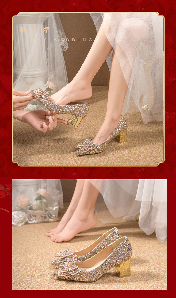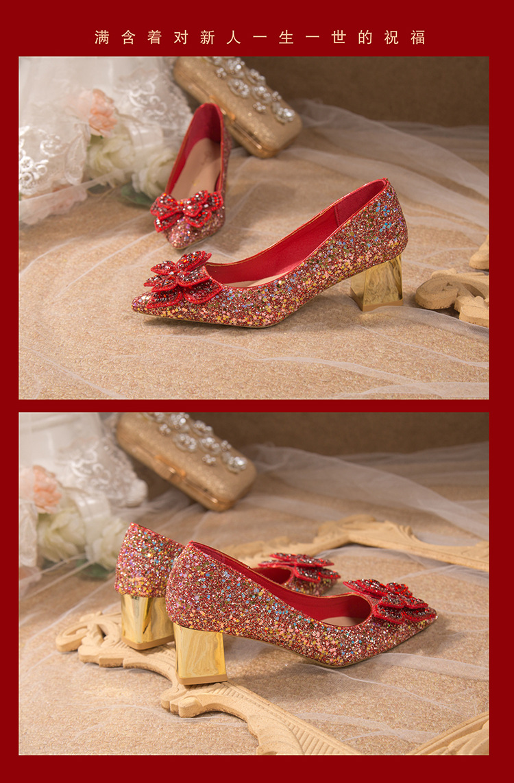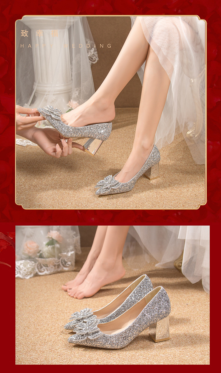 크리스탈 하이힐 여성용 두꺼운 힐 프렌치 스타일 우아한 활 플러스 사이즈 라인석 세퀸 싱글 레이어 신발 Xiuhe 웨딩 슈즈스토어 가기