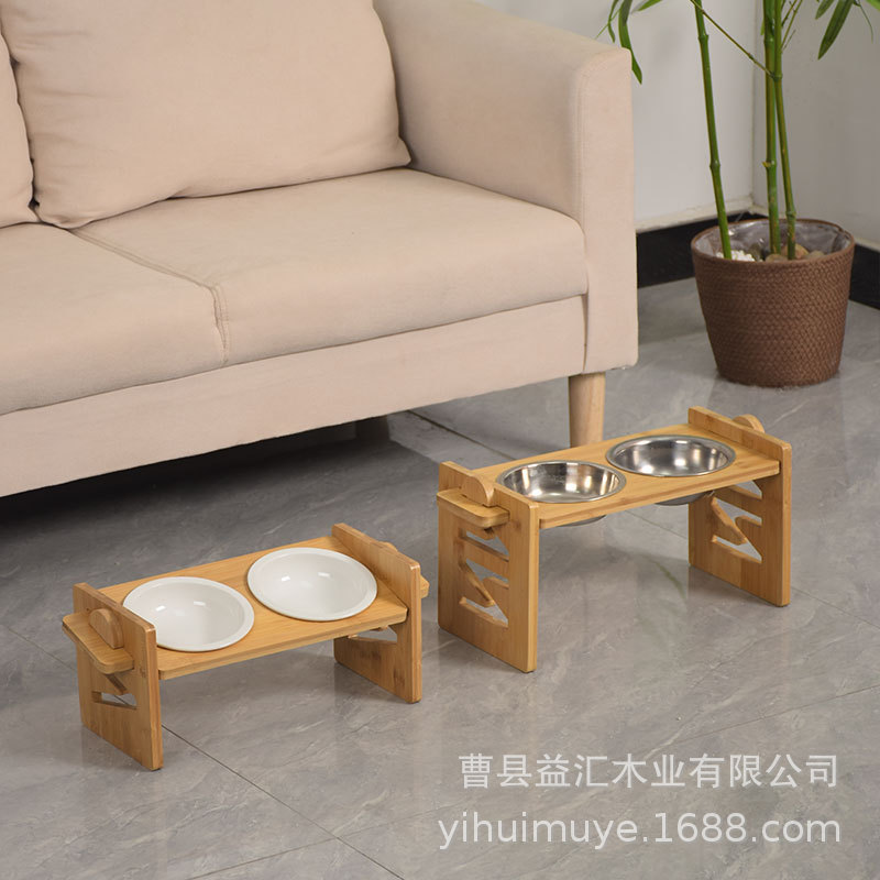 국경을 넘는 대나무 고양이 그릇 랙, 경사진 목 보호대, 애완동물 먹이 그릇, 수직 조절식 고양이 식수 랙 식탁