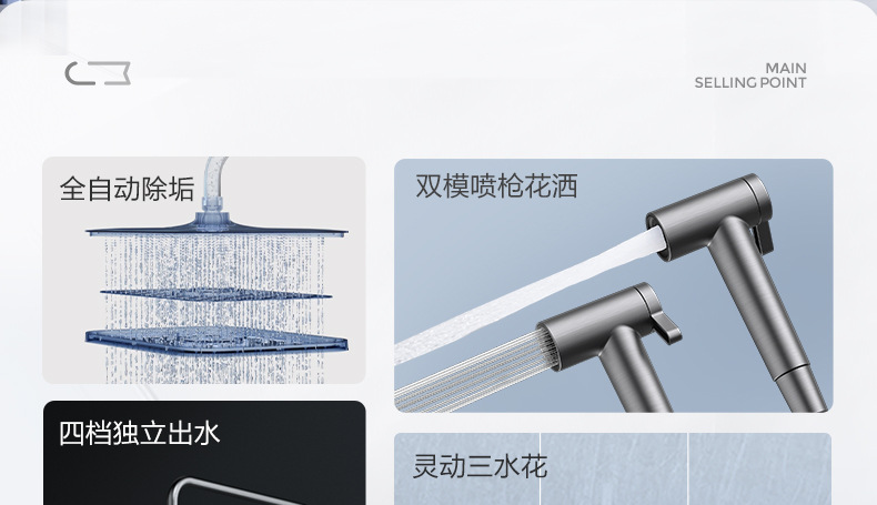 • 건그레이 키로 물 배출구 단독 제어 + 대형 수납 테이블 [탑 스프레이 + 샤워 + 스프레이 건]
