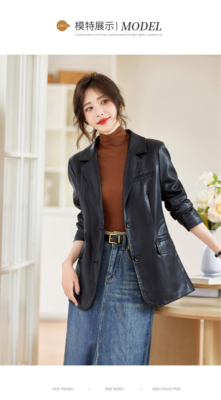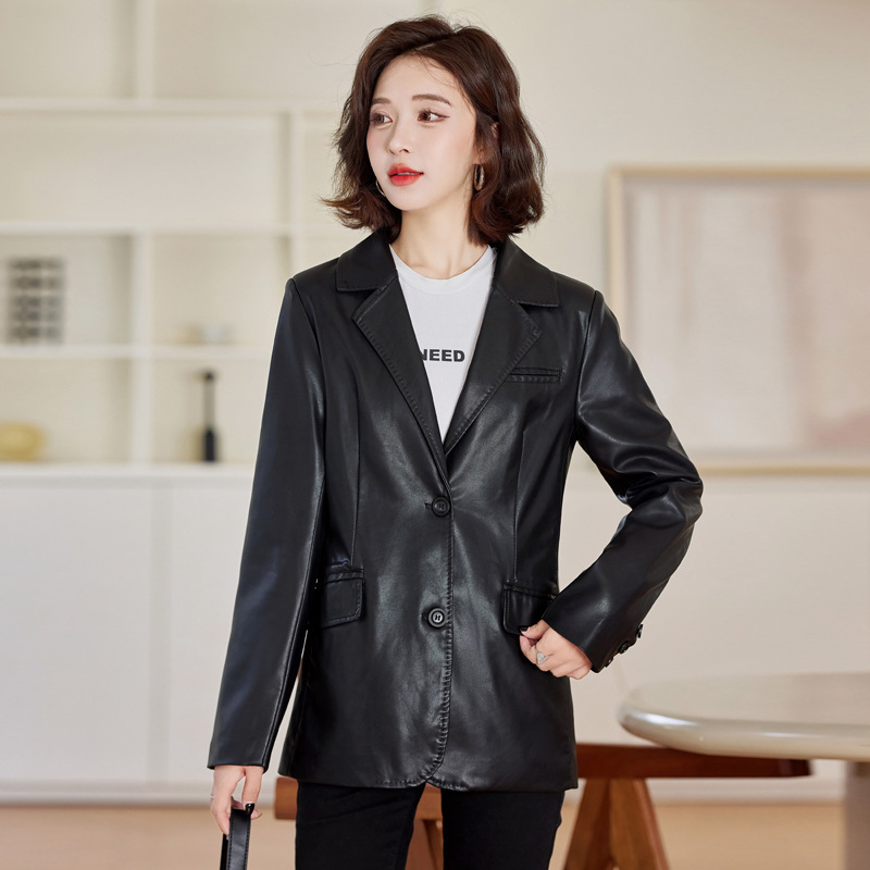 세련된 올 매치 가죽 여성의 봄과 가을 새로운 간단한 통근 핸섬 프라이드 스트리트 원피스 칼라 양가죽 자켓 코트스토어 가기