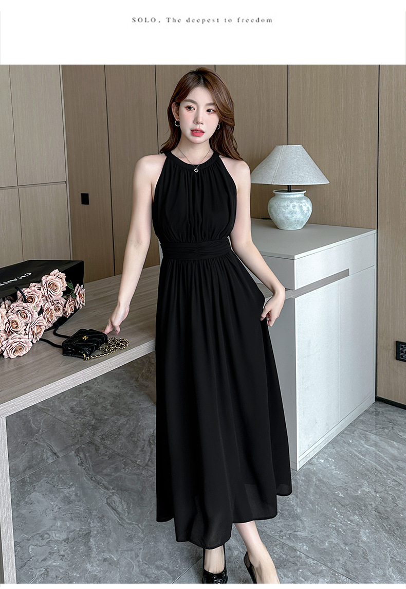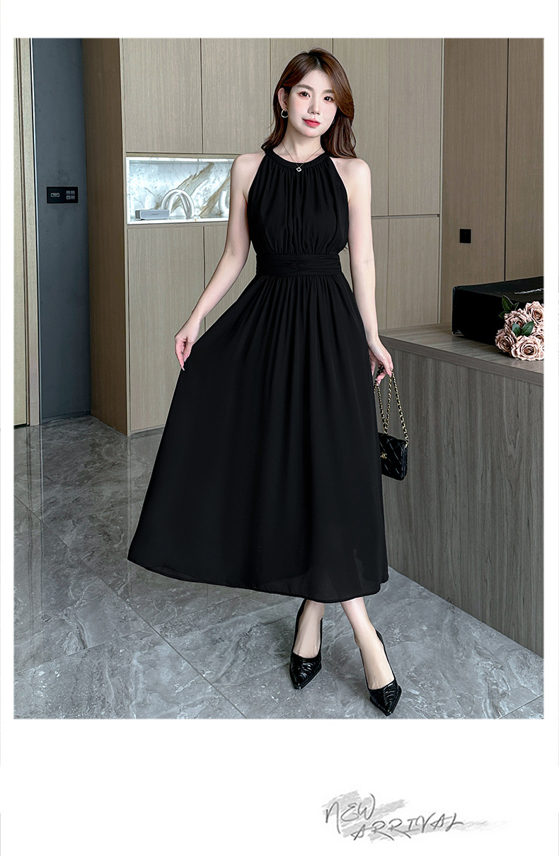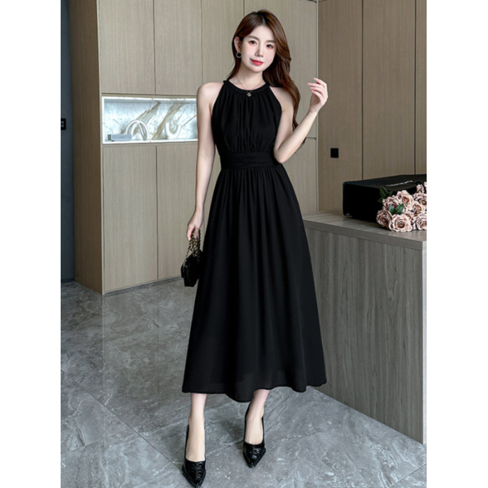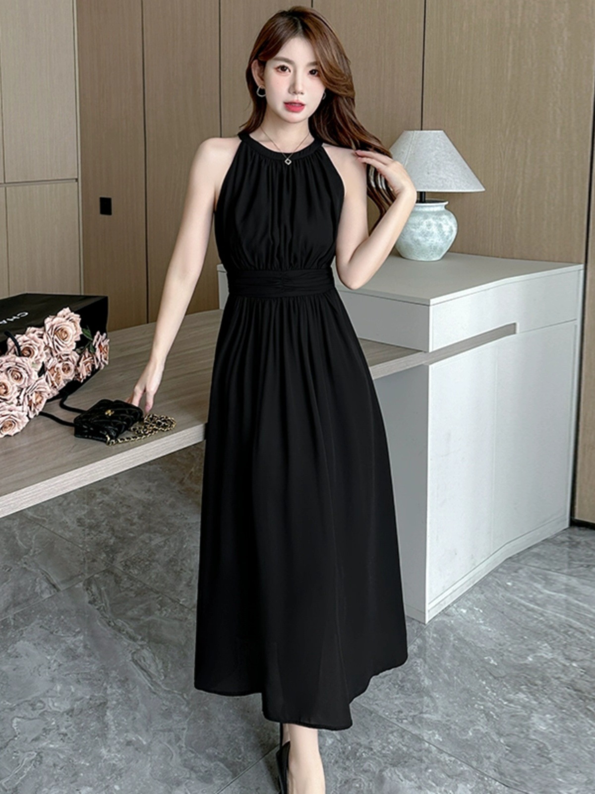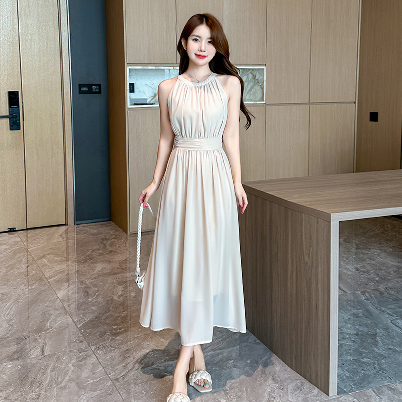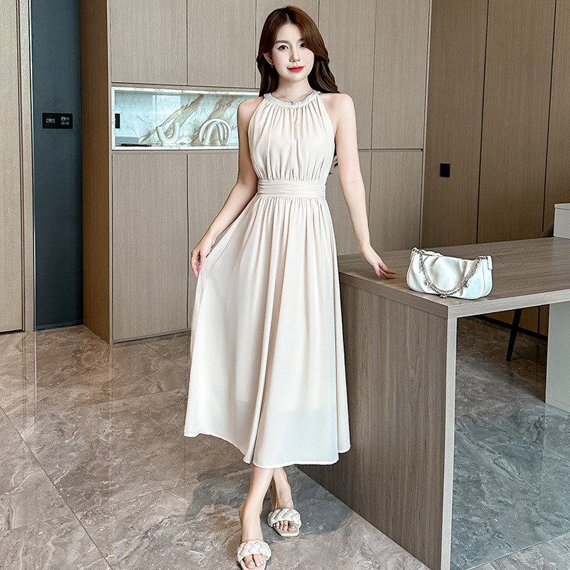 2025 년 새로운 살구색 쉬폰 원피스 봄과 여름 부드러운 기질 통근 허리 A 라인 스커트 민소매 목 원피스
