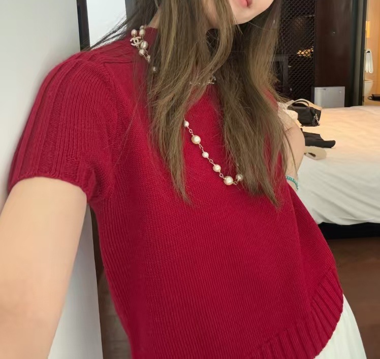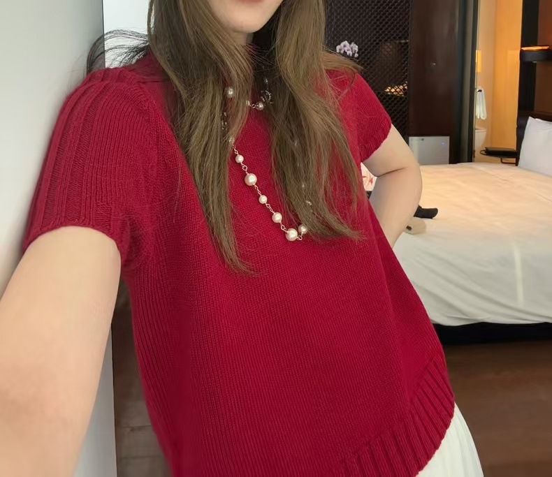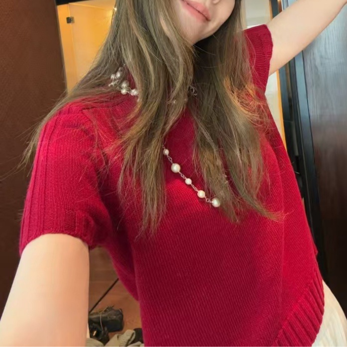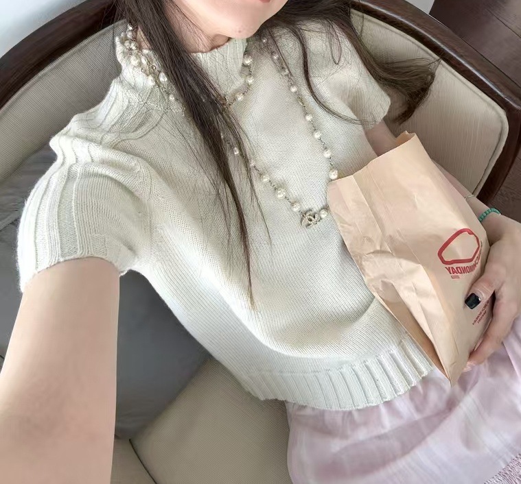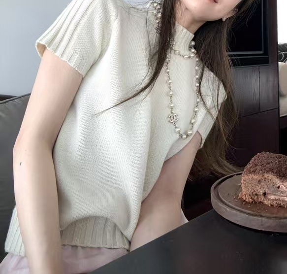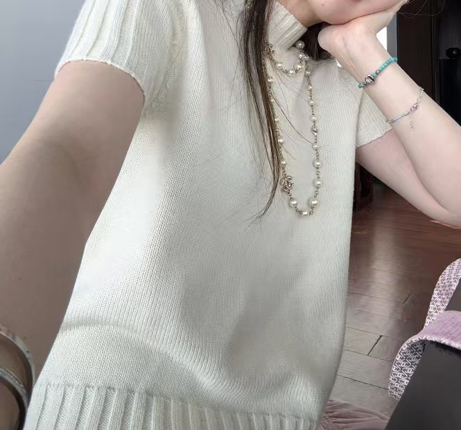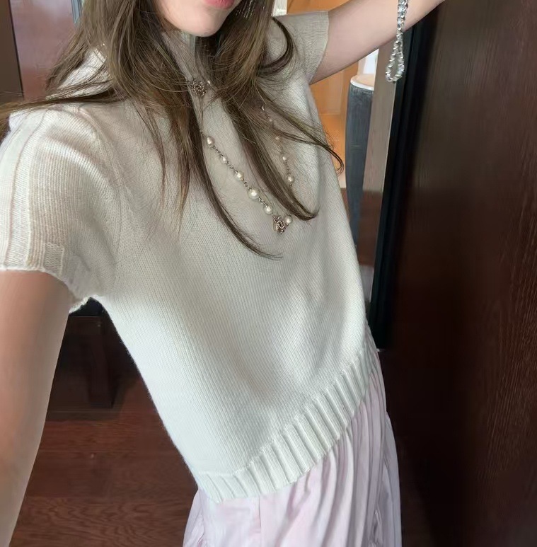 2025 한국식 봄과 여름 신형 하이 엔드 니트 스웨터 반팔 외부 착용 반 높이 목 슬림 스웨터 코트 여자 탑