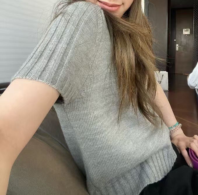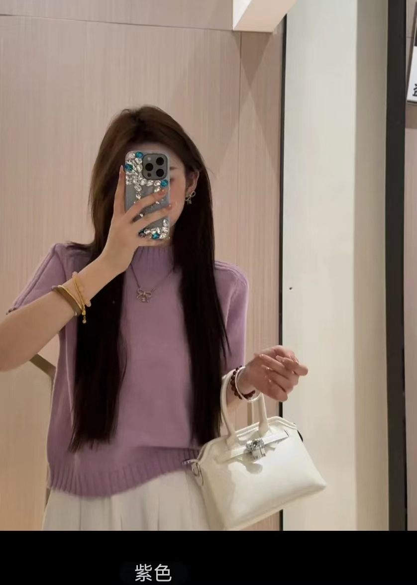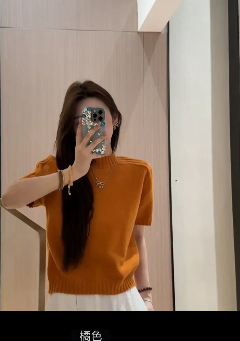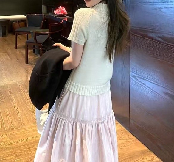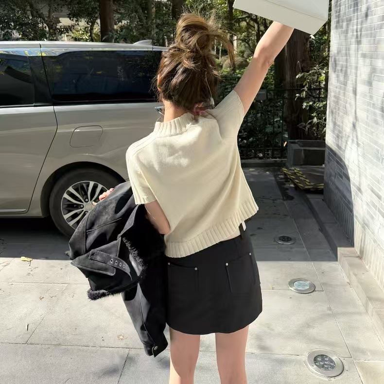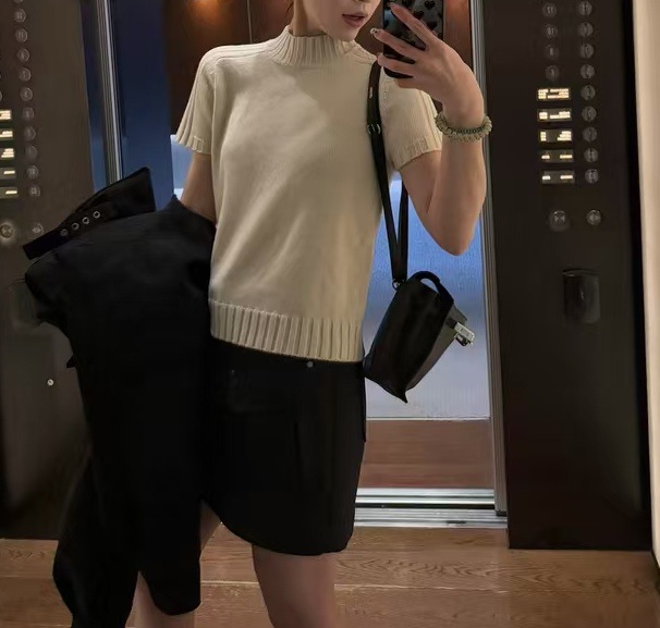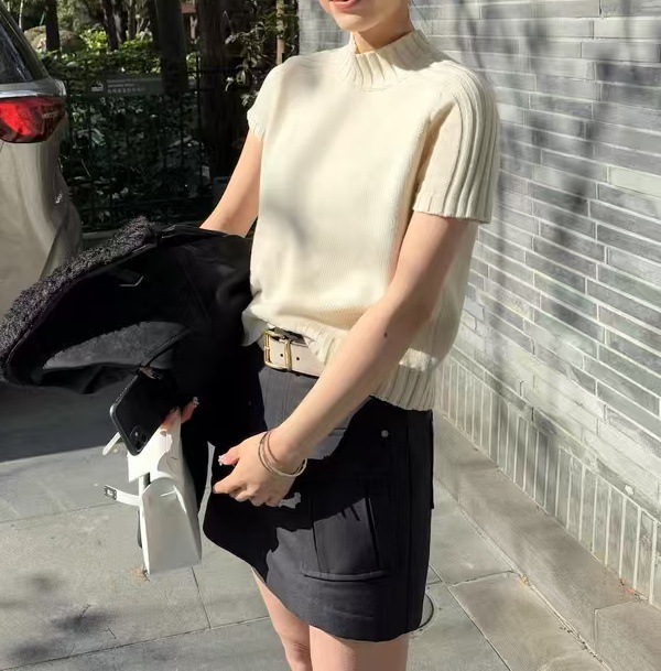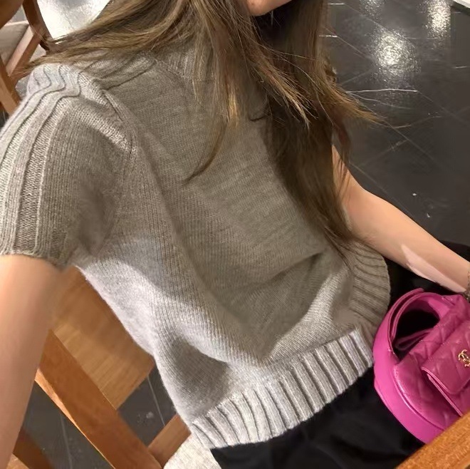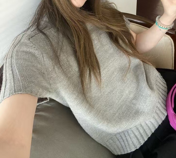 2025 한국식 봄과 여름 신형 하이 엔드 니트 스웨터 반팔 외부 착용 반 높이 목 슬림 스웨터 코트 여자 탑스토어 가기
