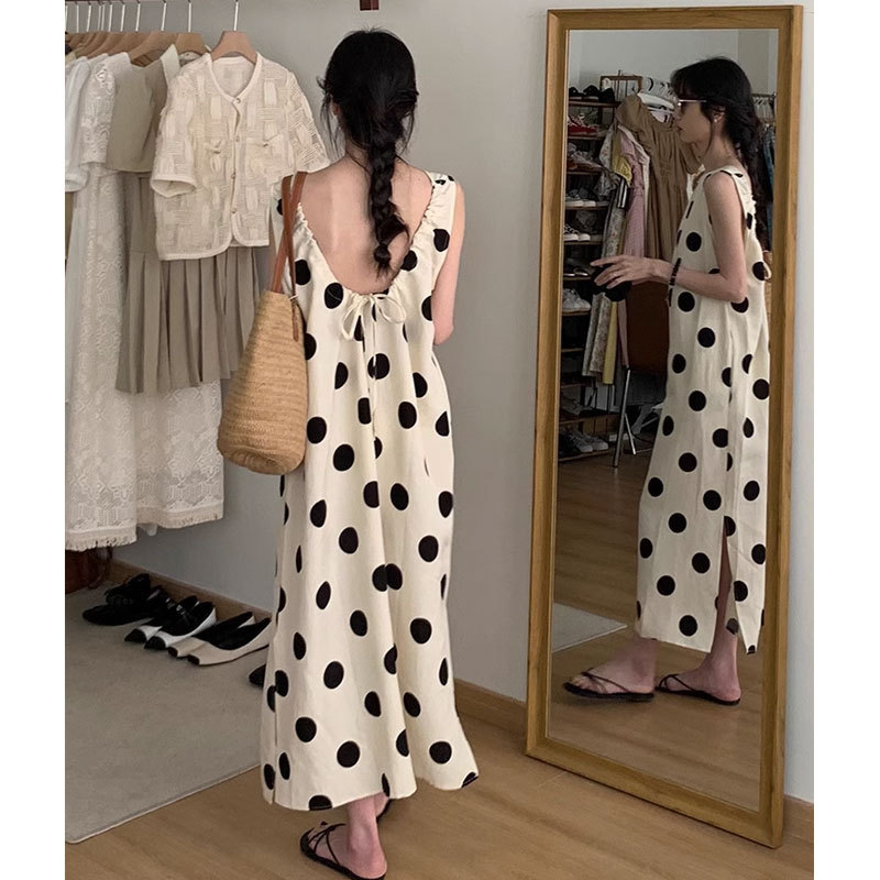 해변 홀리데이 스타일 플러스 사이즈 백리스 웨이브 닷 민소매 원피스 여성복 통통한 여성 디자인 기질 조끼 긴 원피스스토어 가기