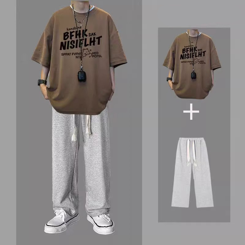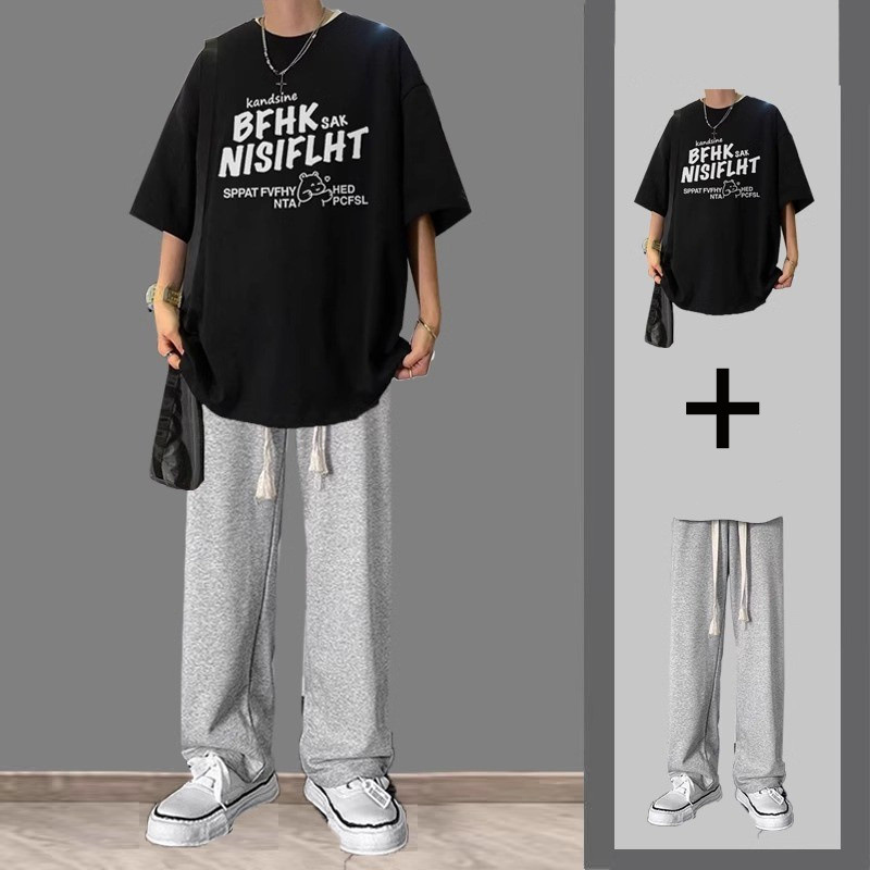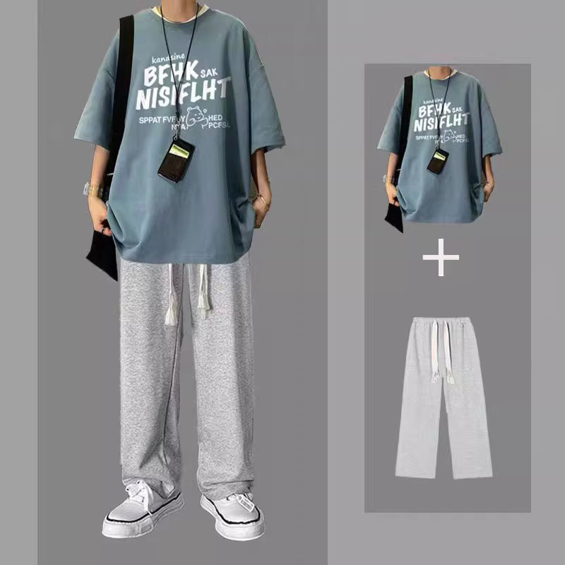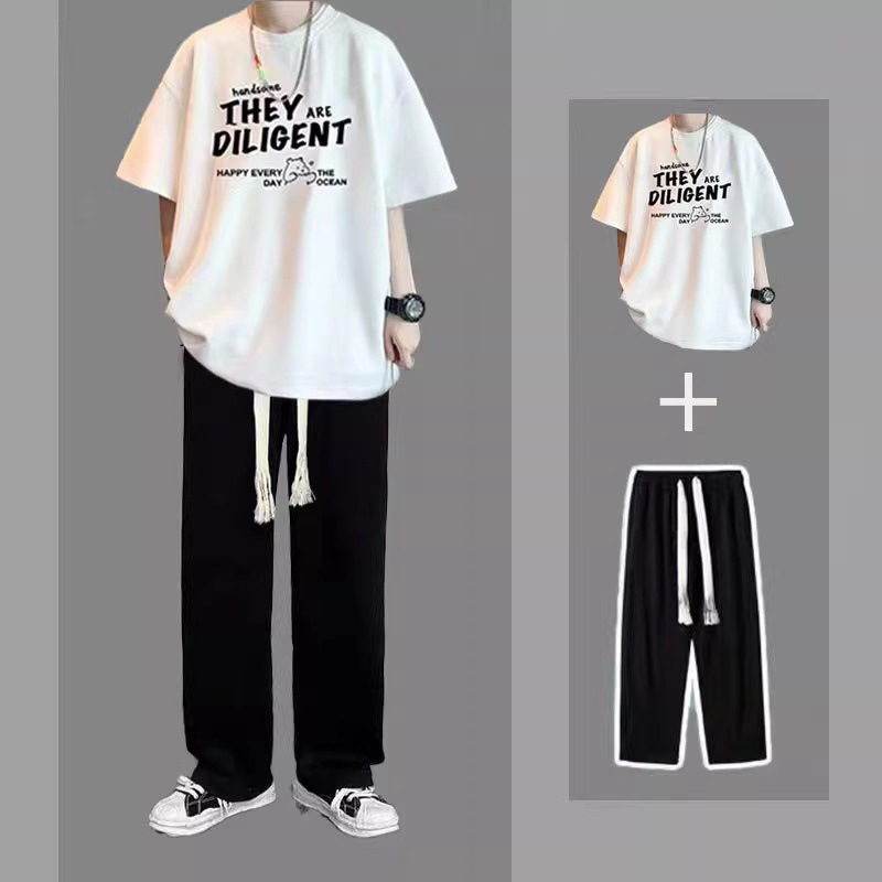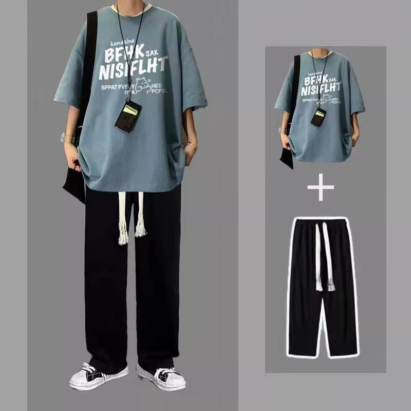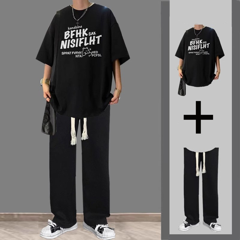 여름 반팔 티셔츠 남성용 세트 핸섬 올 매치 트렌디 캐주얼 투피스 세트 학생용 바지
