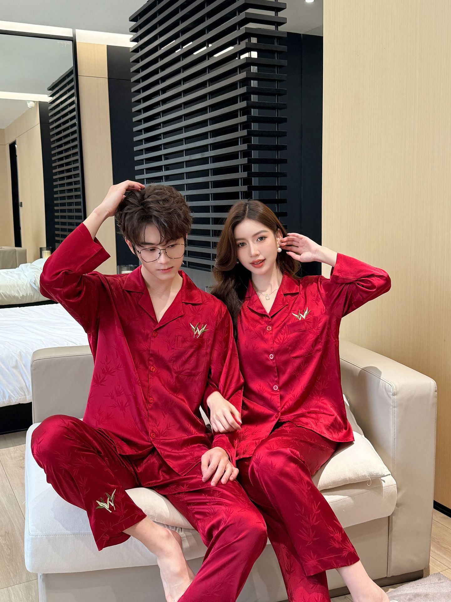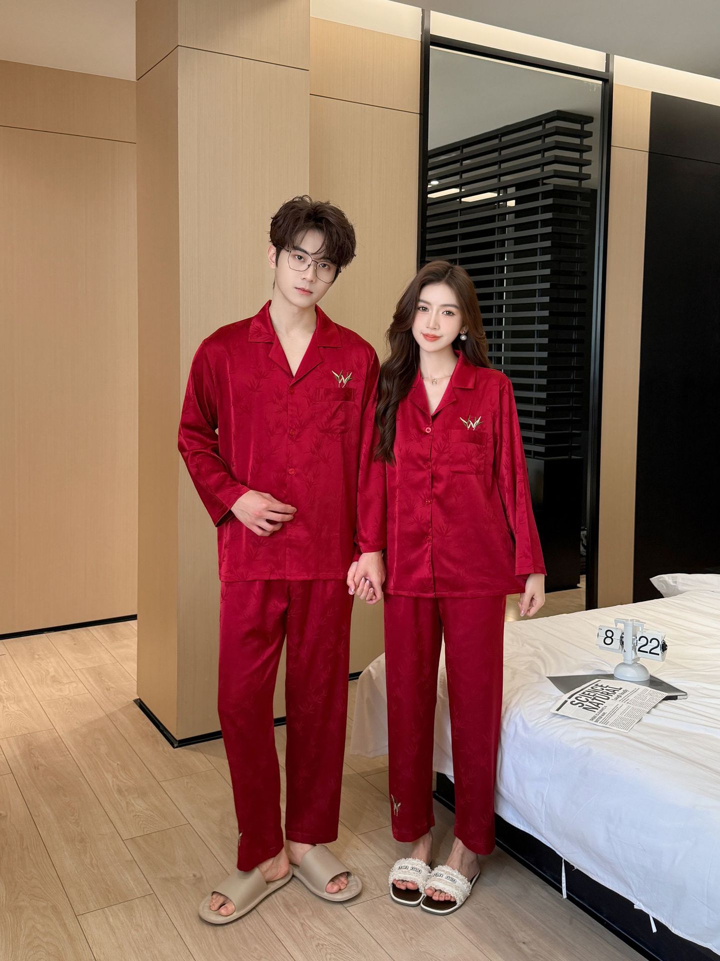 웨딩 파자마 커플 붉은 봄과 가을 대나무 잎 하이 엔드 웨딩 동반 웨딩 축제 세트 홈 서비스 1179스토어 가기