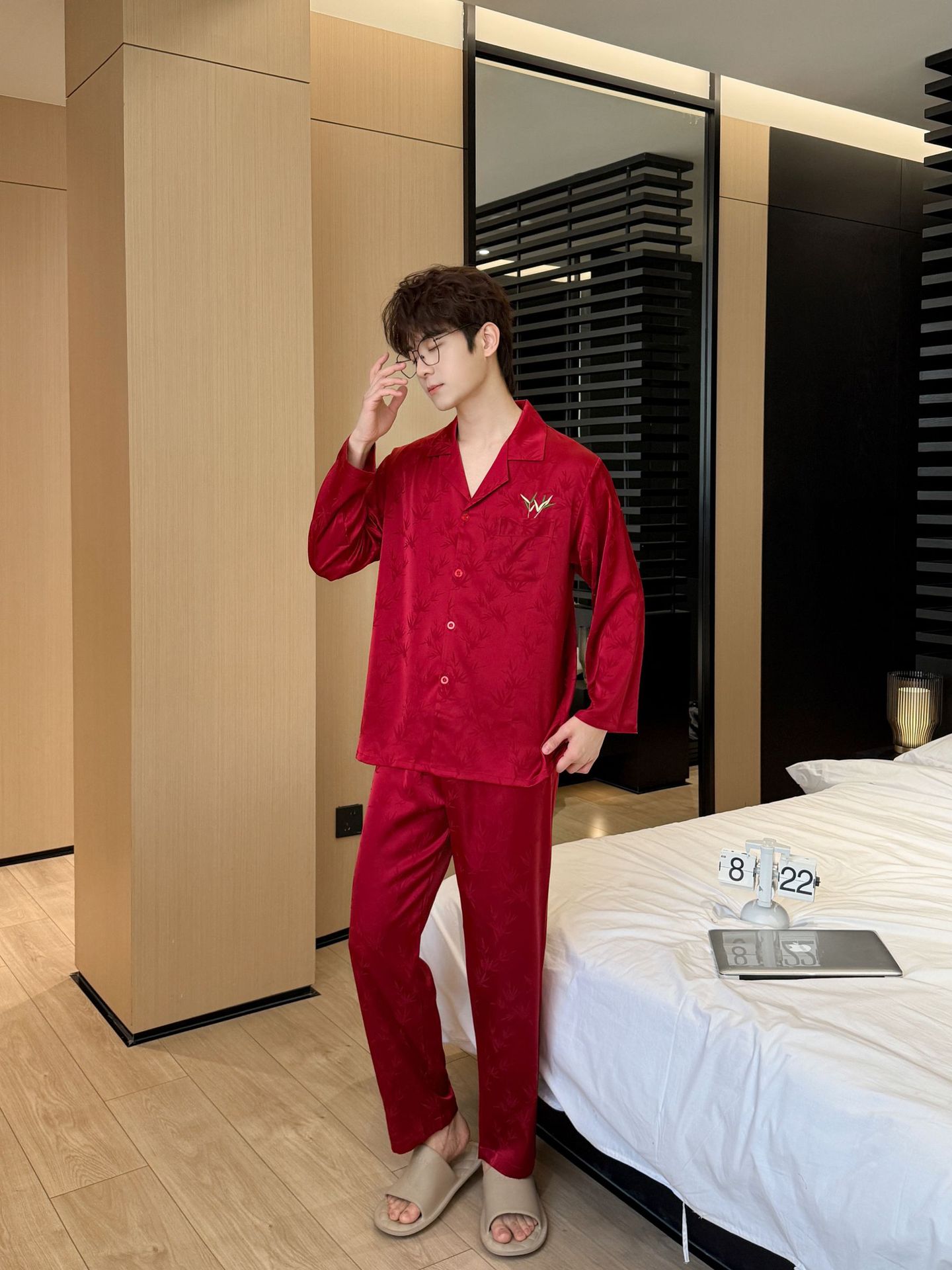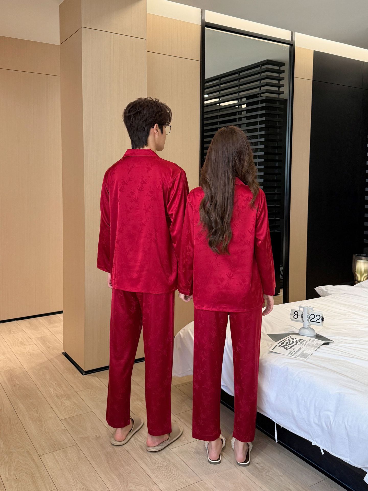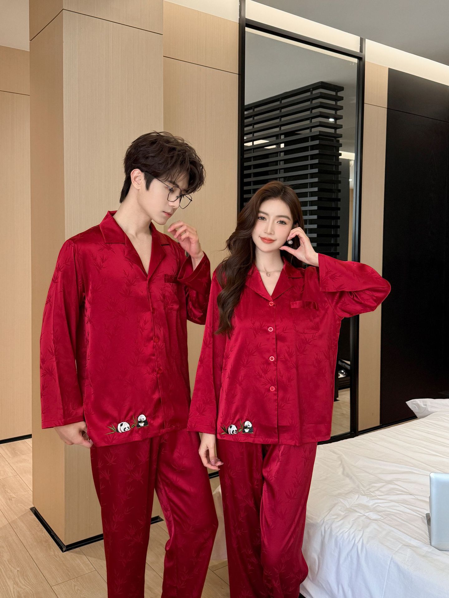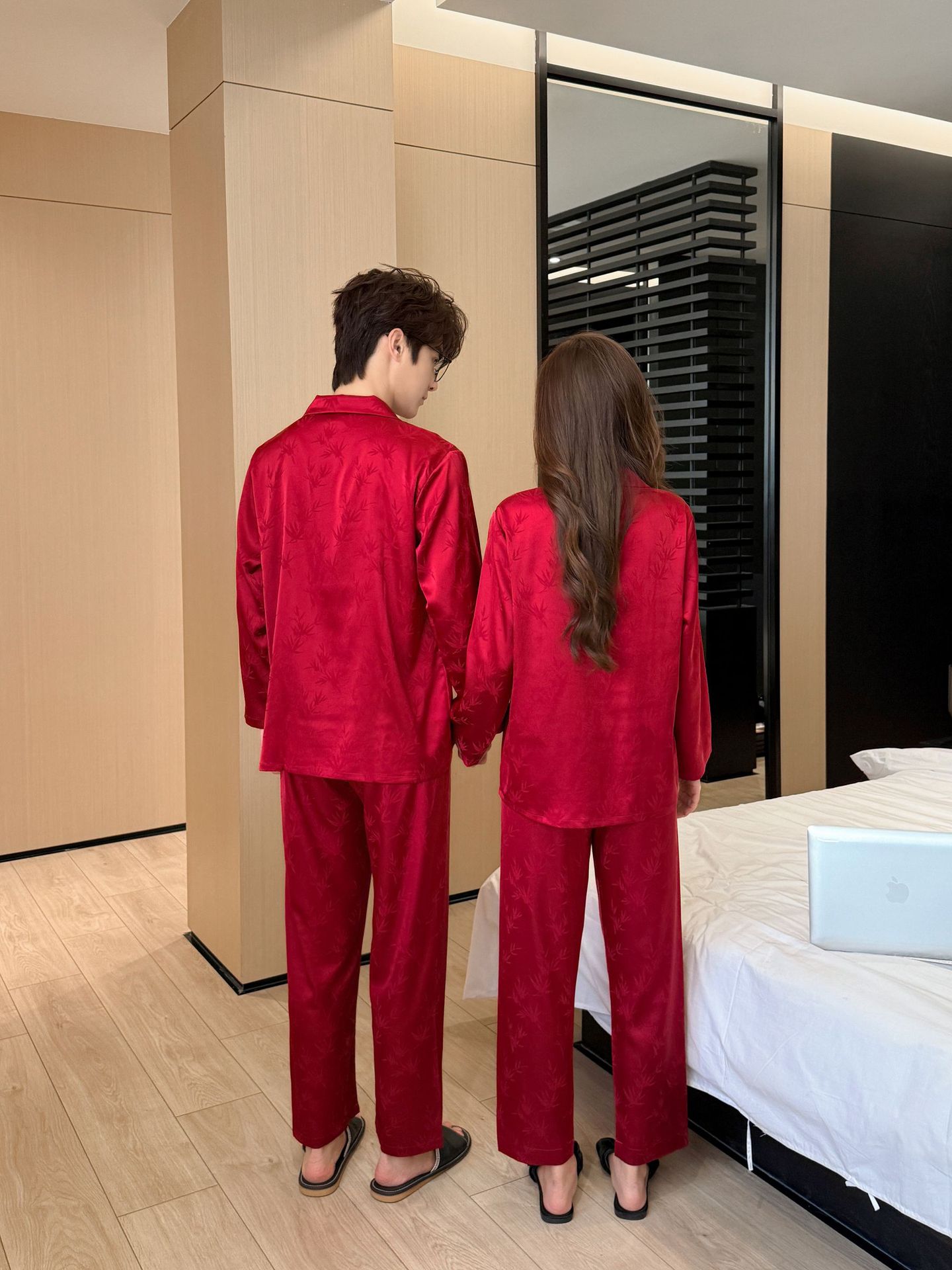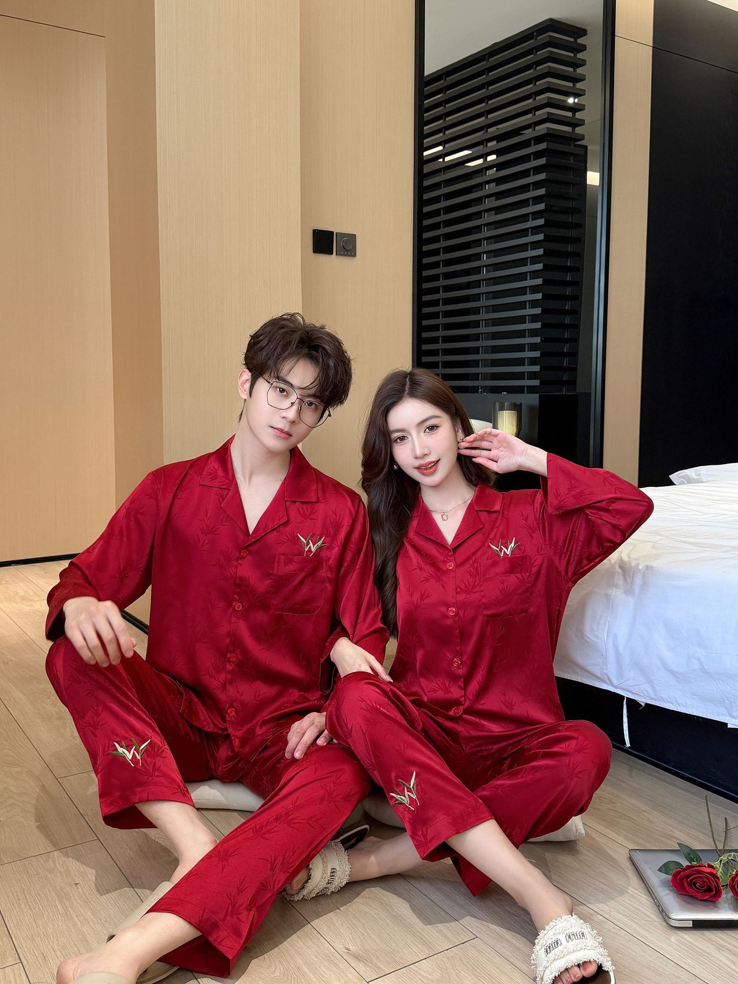 웨딩 파자마 커플 붉은 봄과 가을 대나무 잎 하이 엔드 웨딩 동반 웨딩 축제 세트 홈 서비스 1179