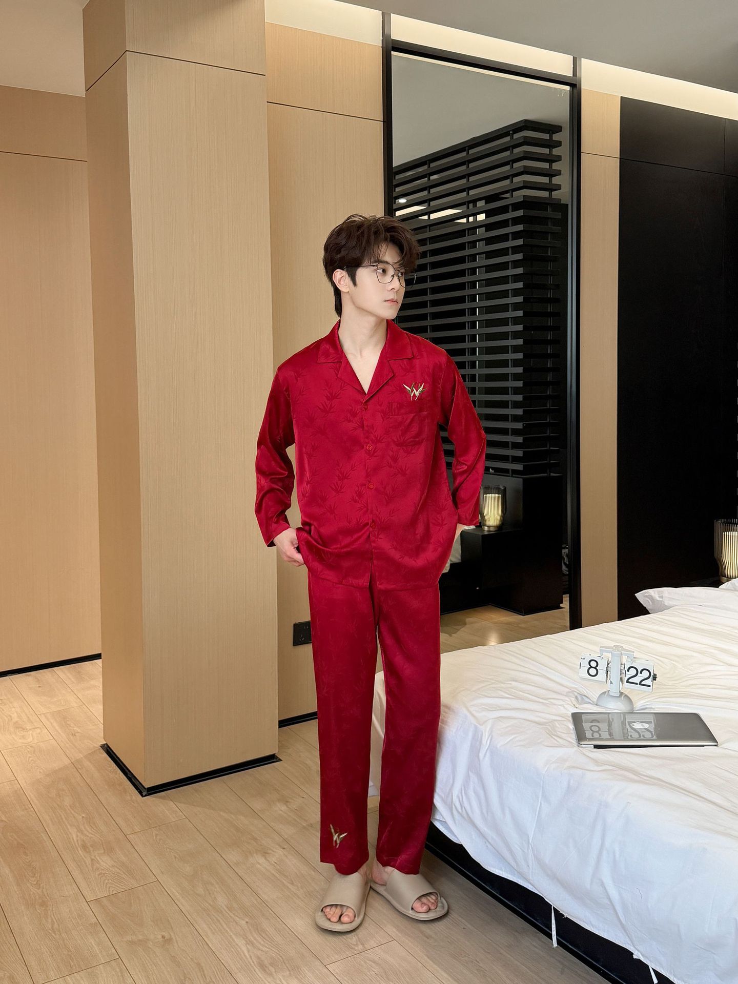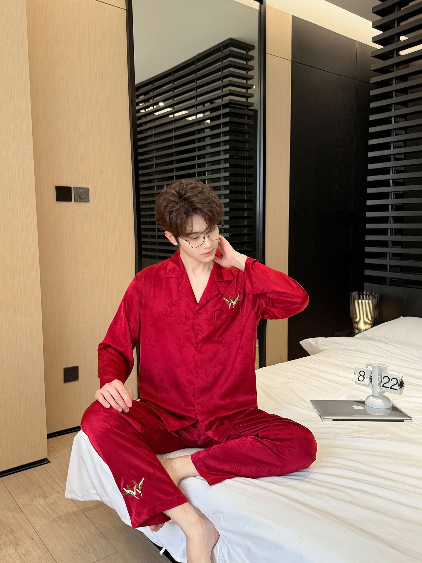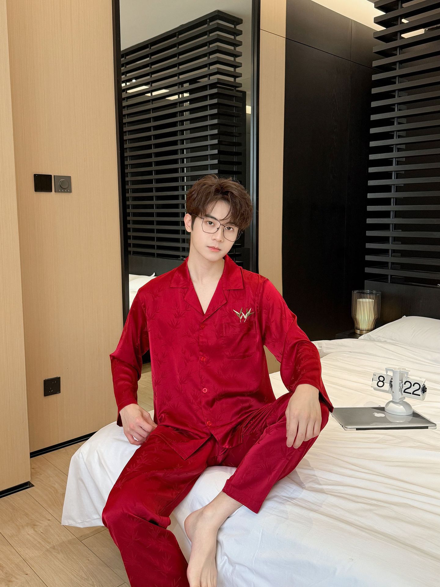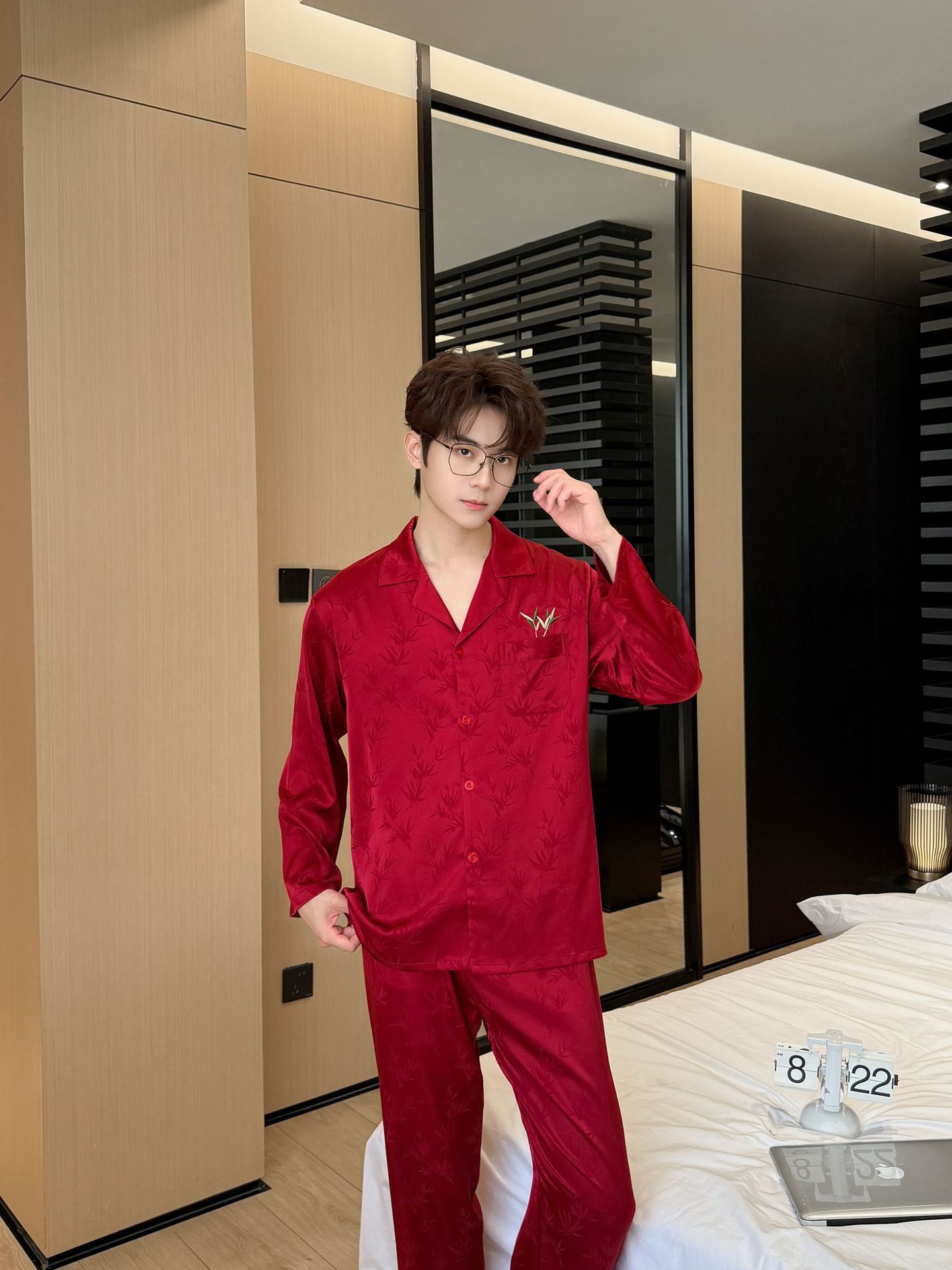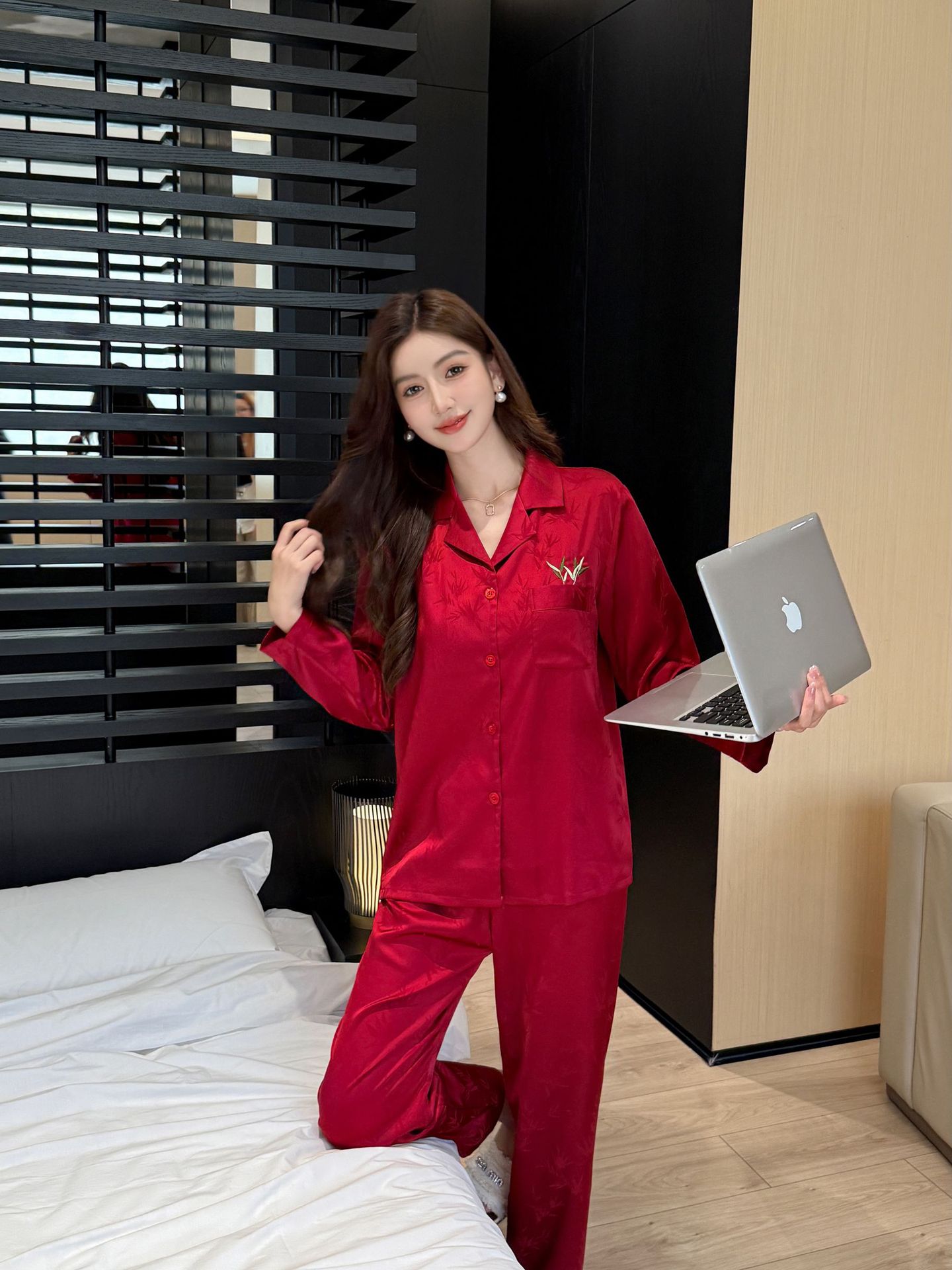 웨딩 파자마 커플 붉은 봄과 가을 대나무 잎 하이 엔드 웨딩 동반 웨딩 축제 세트 홈 서비스 1179