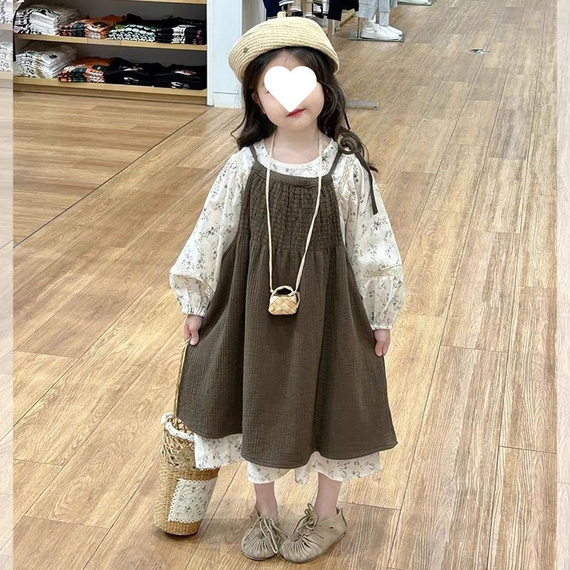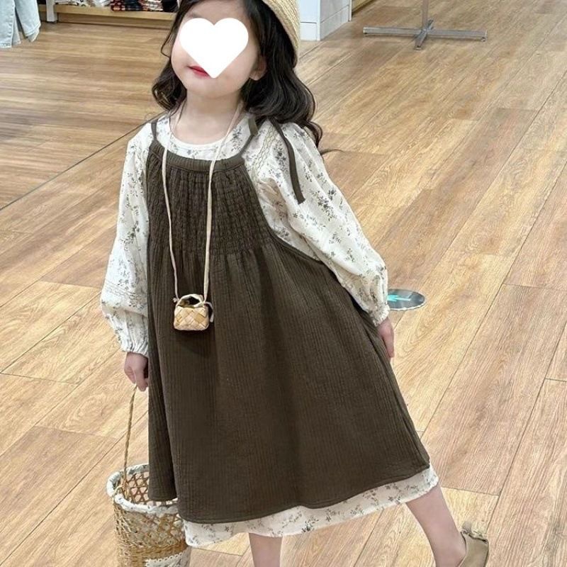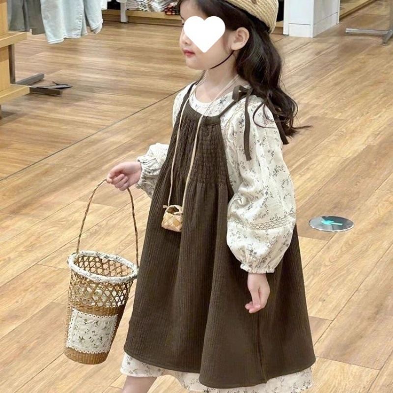 여자 2025 봄 가을 새 아동복 세트 한국식 캐주얼 꽃 긴 원피스 아기 거품 소매 원피스 투피스 세트