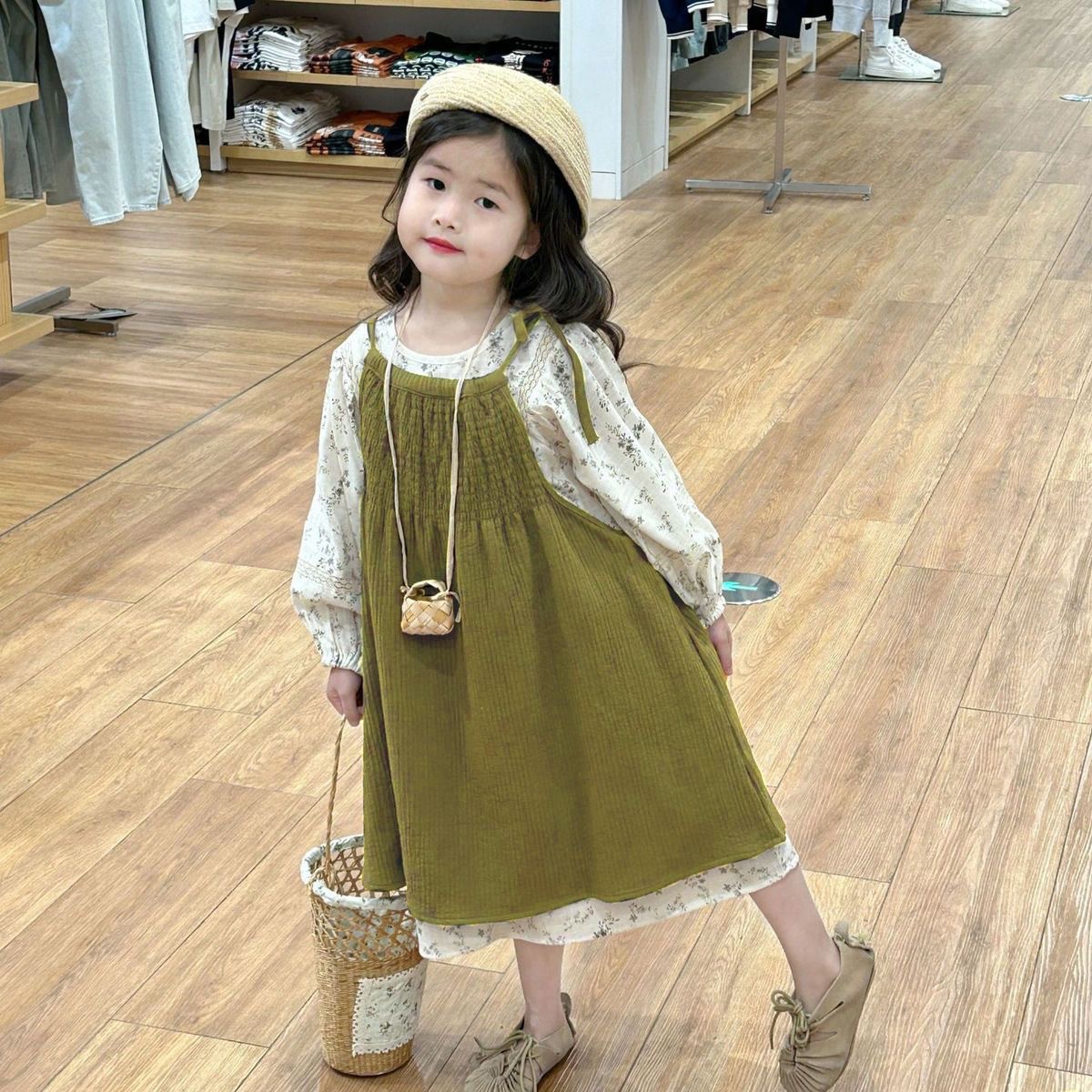 • 브라운 서스펜더 스커트 + 꽃무늬 드레스