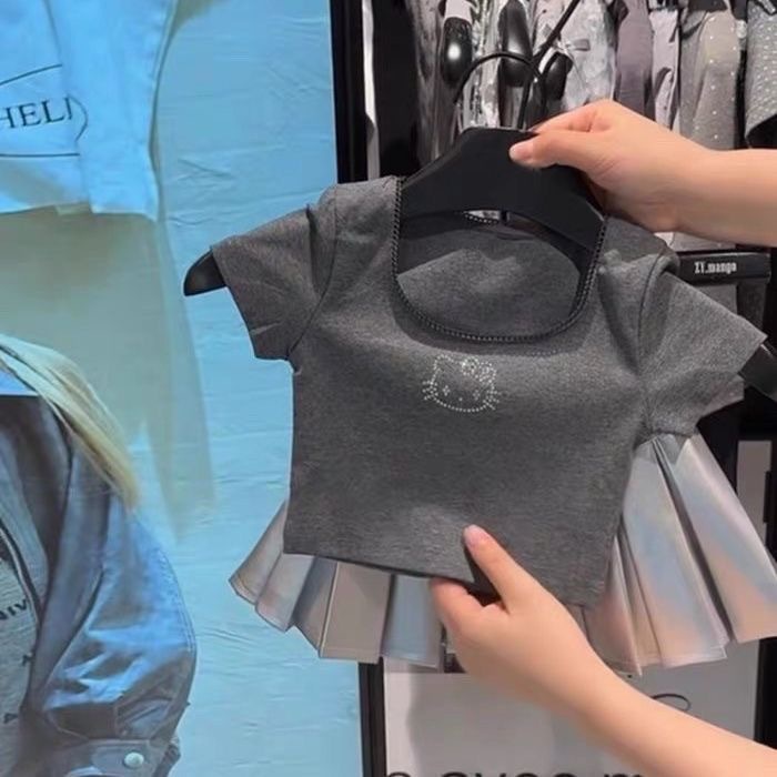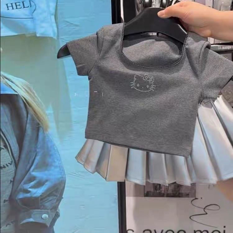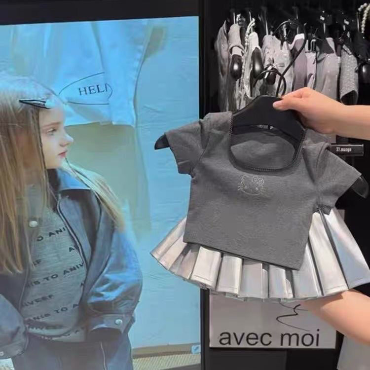 한국 아동복 소녀 봄 2025 새로운 아기 귀여운 만화 고양이 반팔 티셔츠 소녀 주름 치마 세트스토어 가기