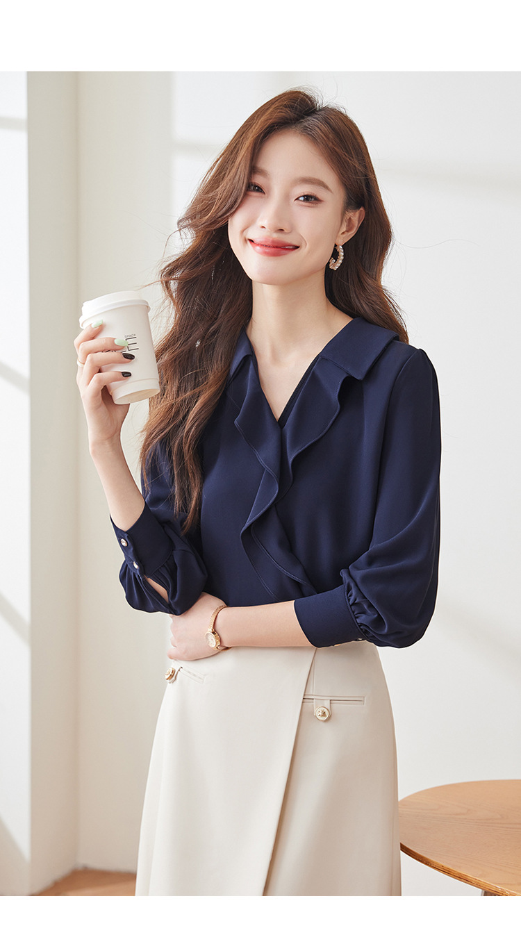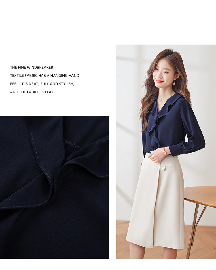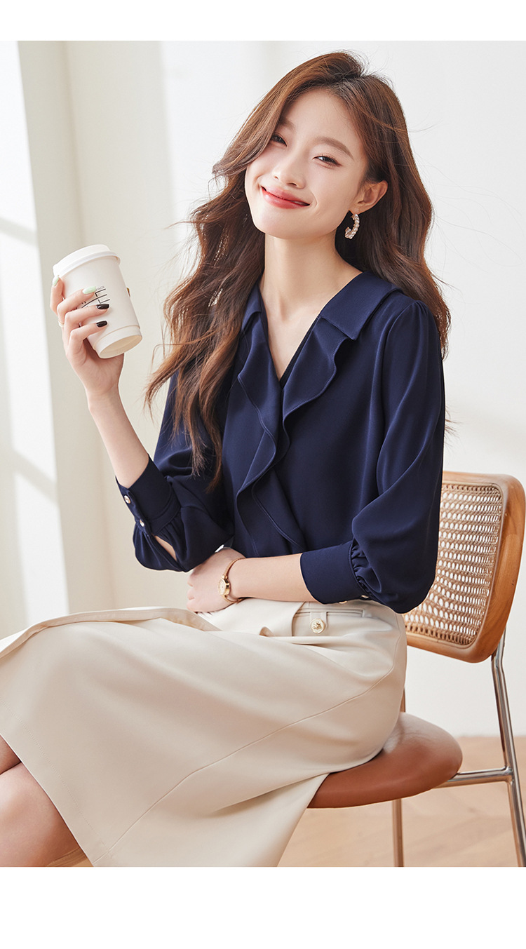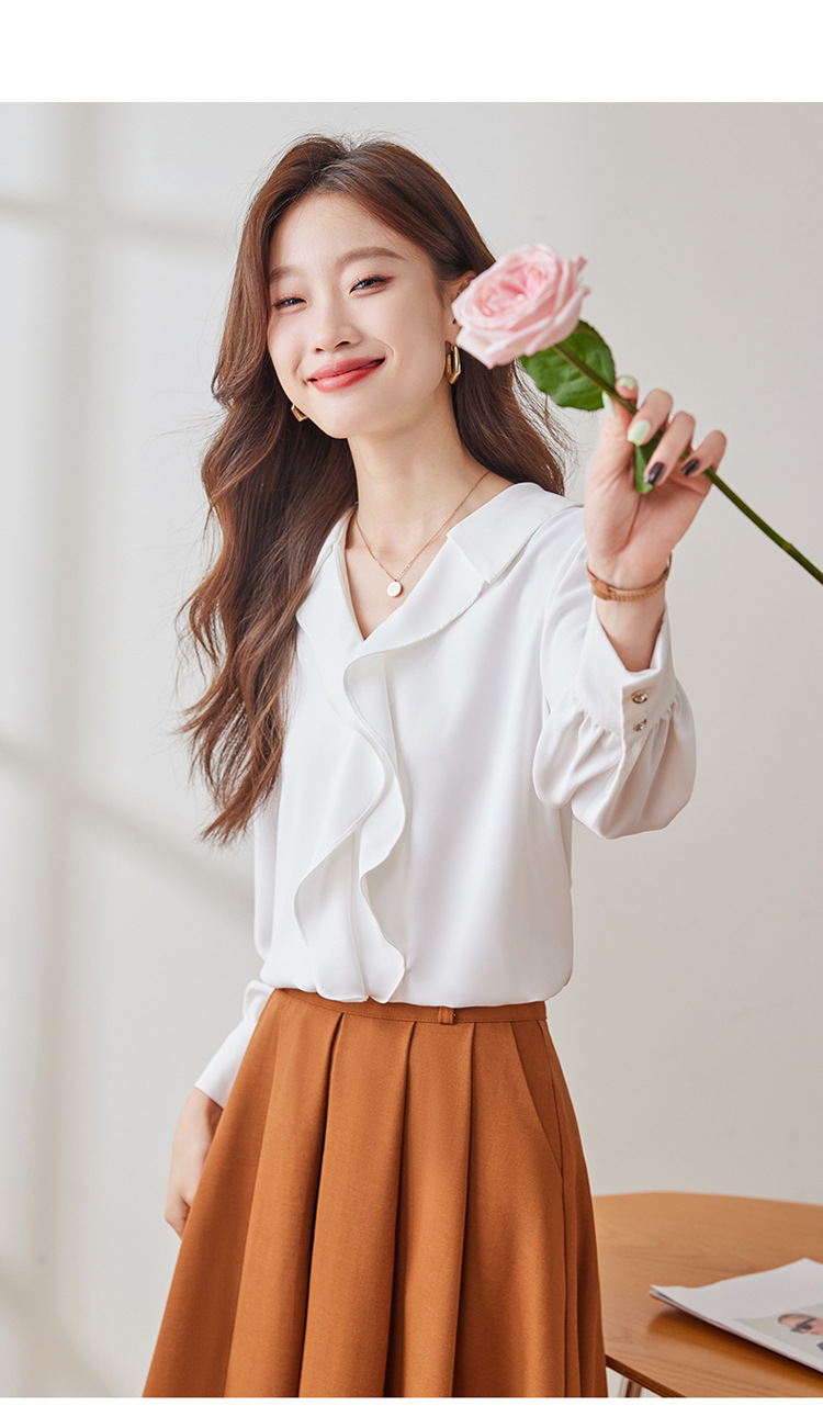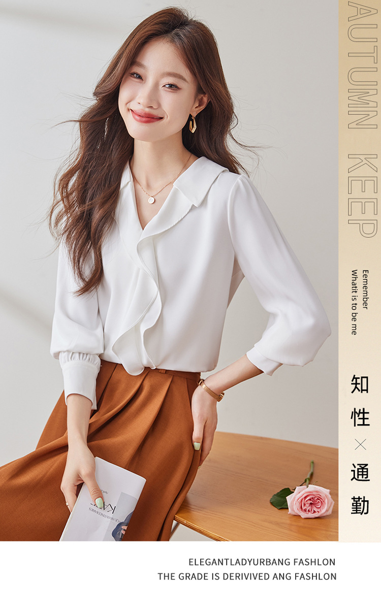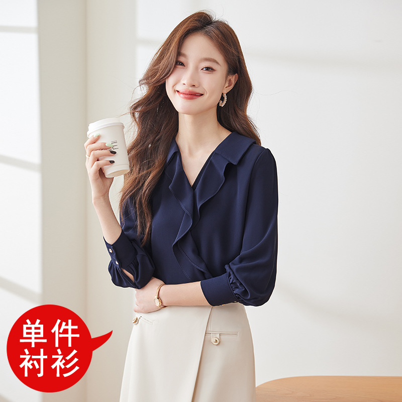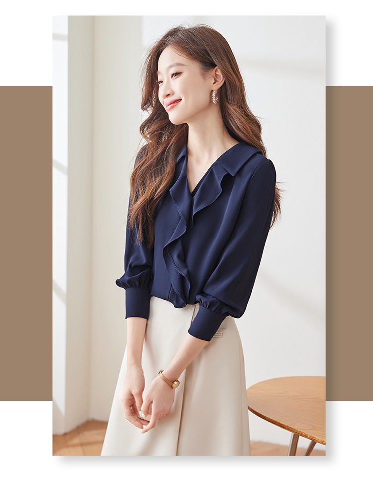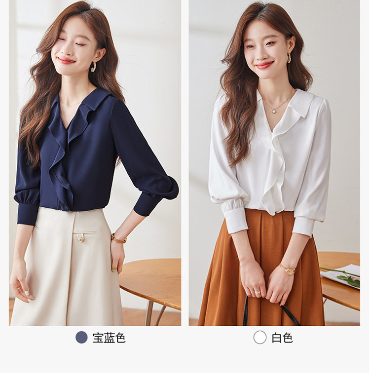 우아한 V 넥 러플 쉬폰 셔츠 여성의 2025 봄 캐주얼 올 매치 OL 패션 간단한 긴 소매 셔츠