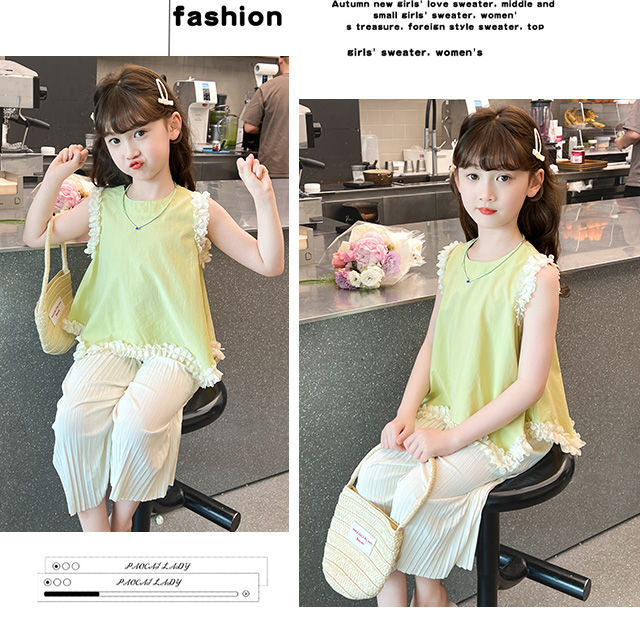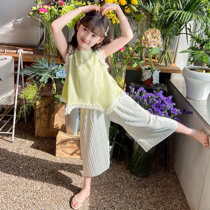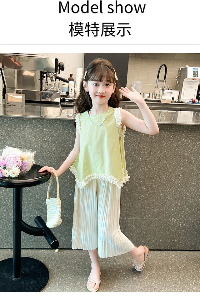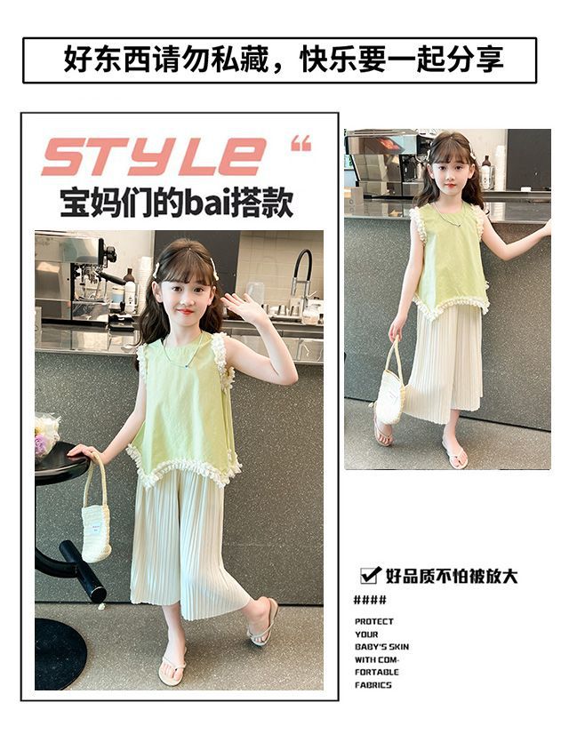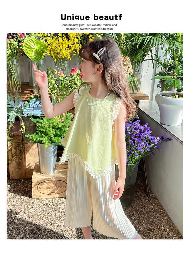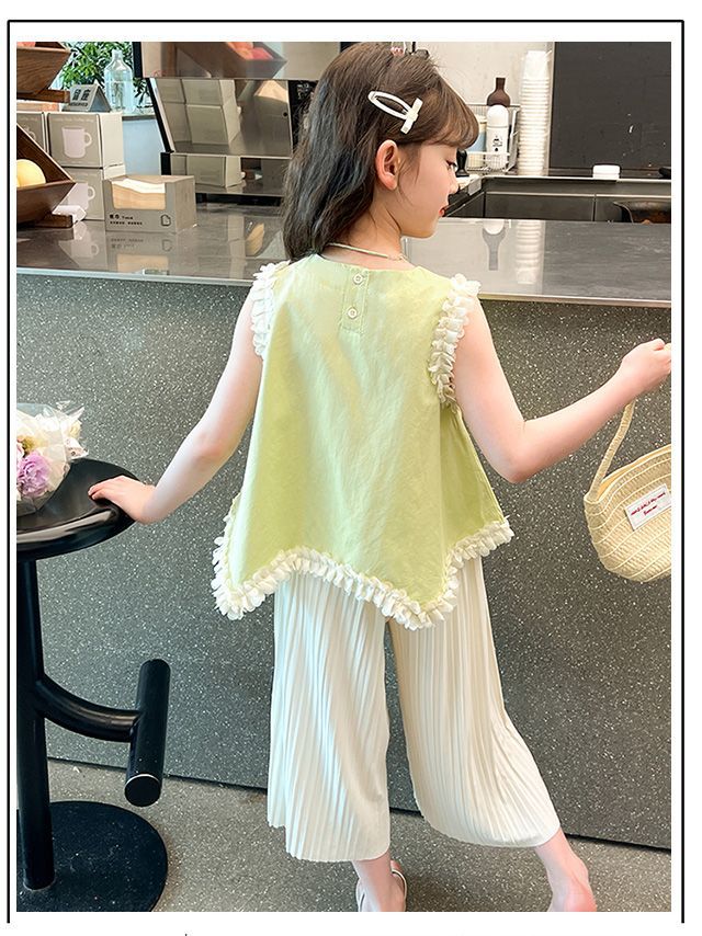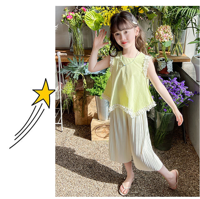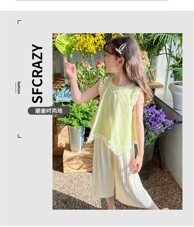 소녀 여름 외국 스타일의 세트 2025 인터넷-유명한 아기 소녀 불규칙한 레이스 탑 어린이 와이드 레그 바지스토어 가기