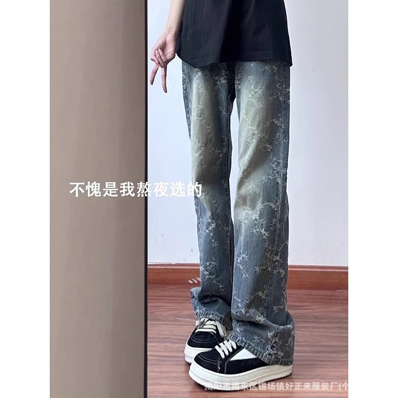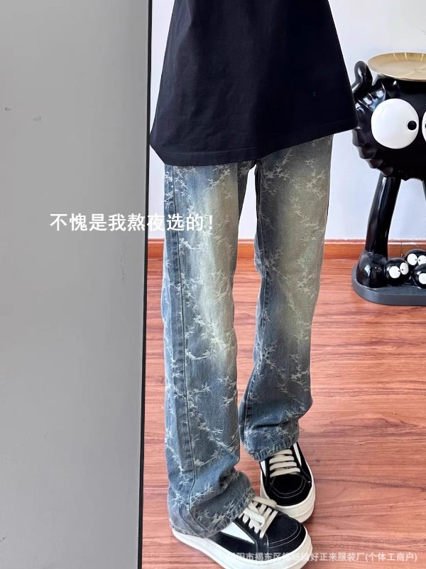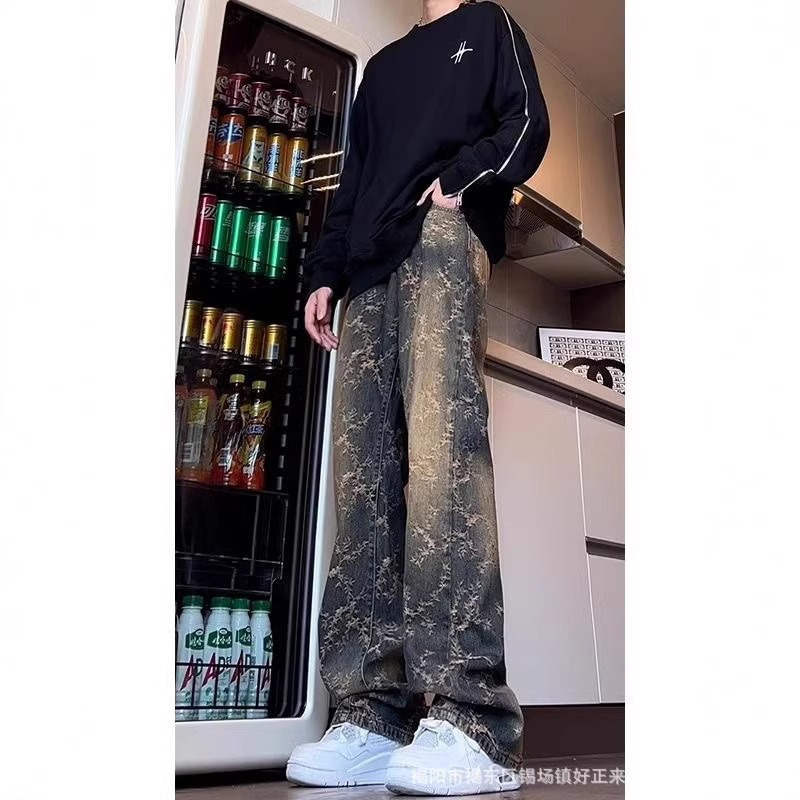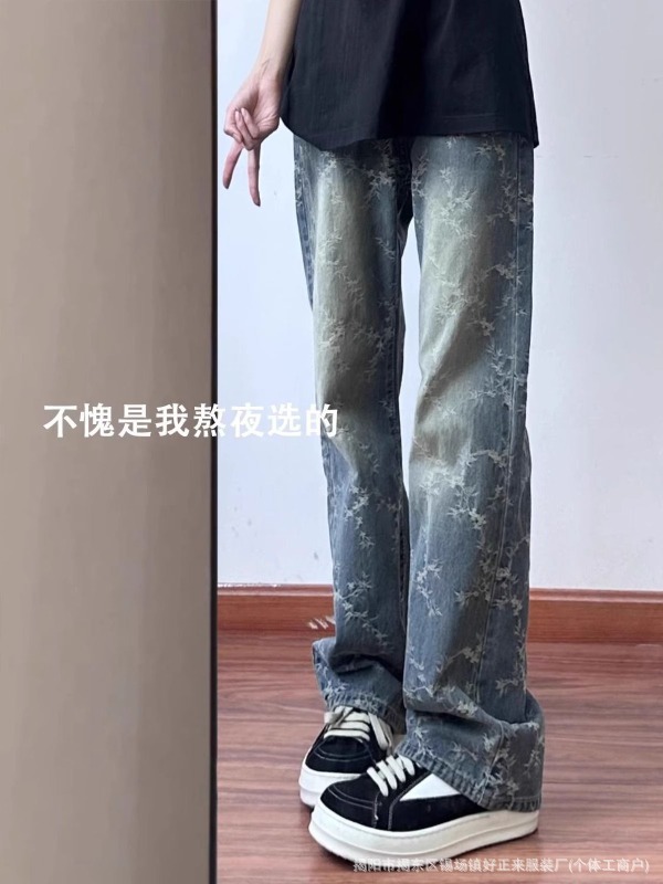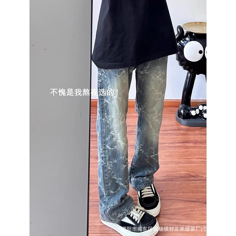 자카드 청바지 남성 가을 미국 스타일 레트로 하이 스트리트 팬츠 봄과 가을 십대 좁은 스트레이트 바지스토어 가기