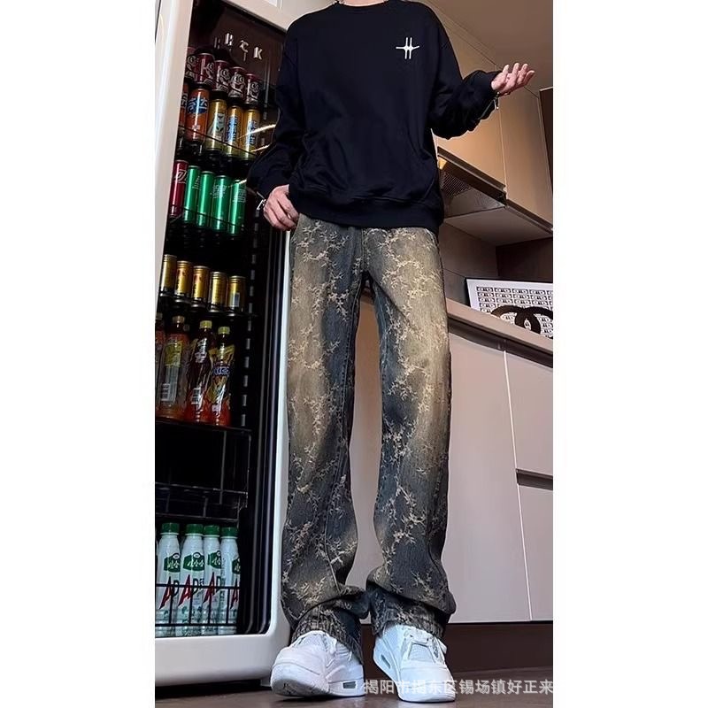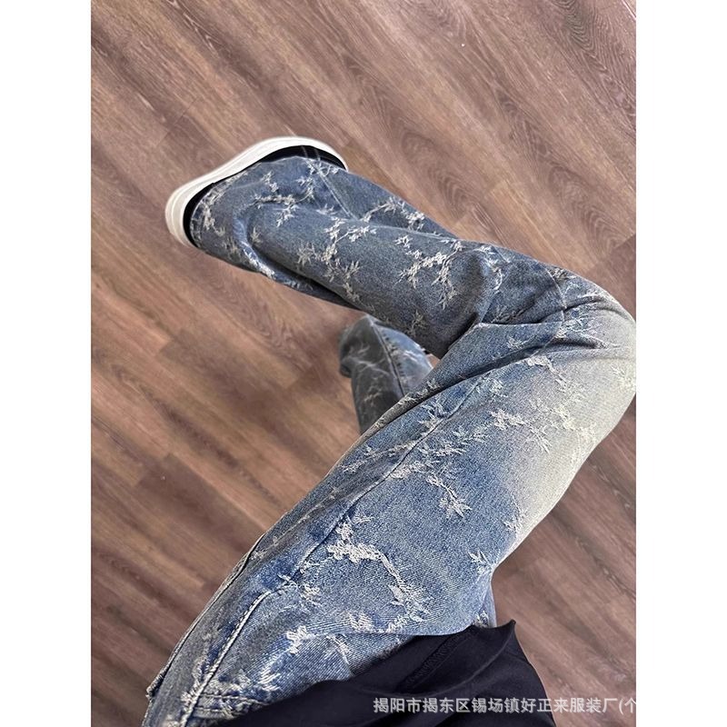 자카드 데님 팬츠 남성용 가을 레트로 하이 스트리트 부츠컷 팬츠 봄 가을 청소년용 슬림핏 스트레이트 팬츠 트렌디 브랜드스토어 가기