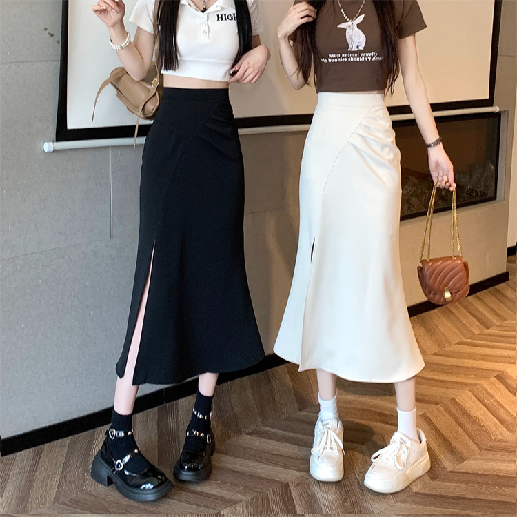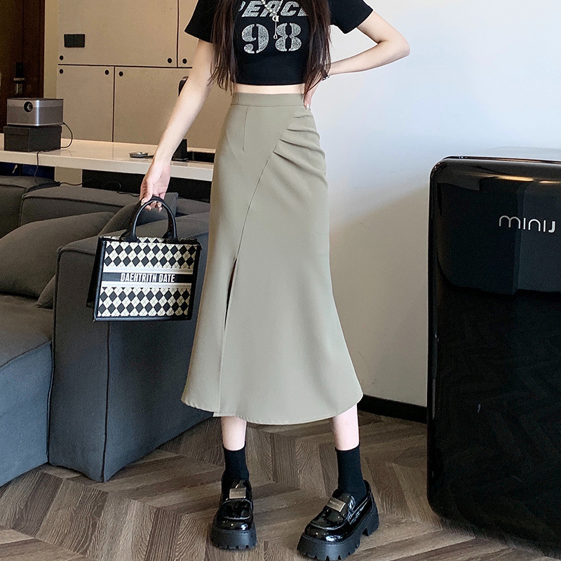 디자인 분할 세트 Fishtail 치마 여성의 여름 높은 허리 배꼽 덮음 치마를 덮는 치마를 덮는 중간 길이의 힙합 스커트