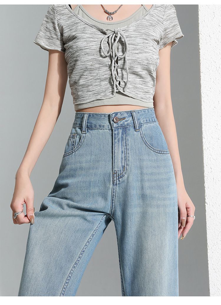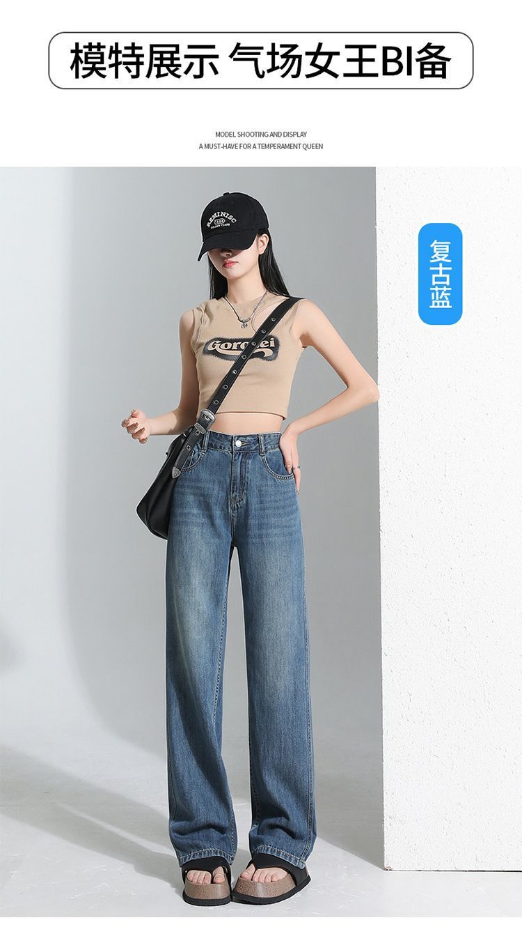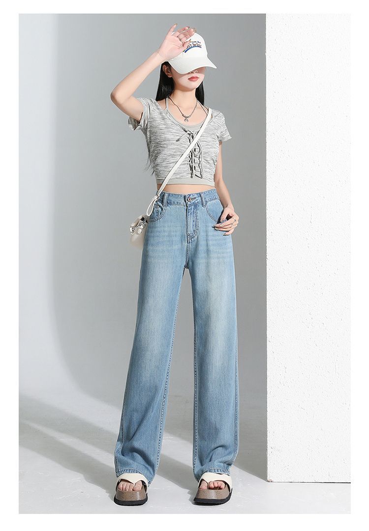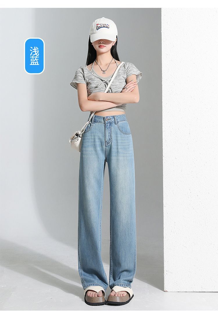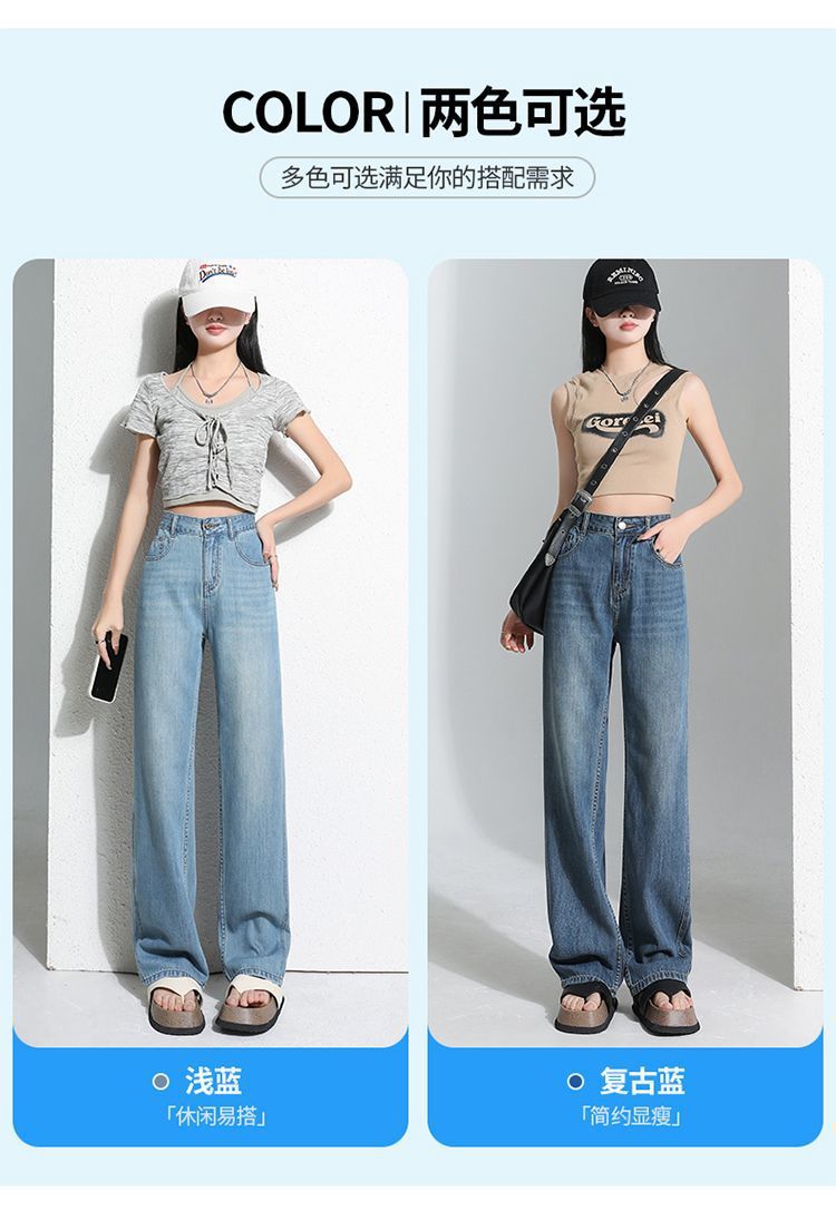 Tencel 얇은 청바지 여자 2025 새로운 여름 높은 허리 느슨한 투약 아이스 실크 여자의 스트레이트 와이드 다리 바지