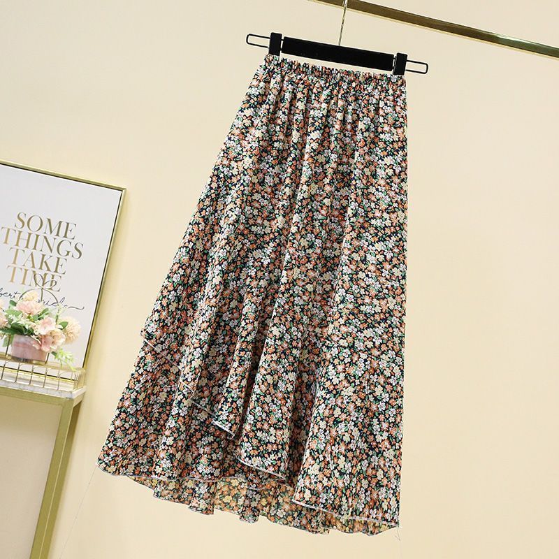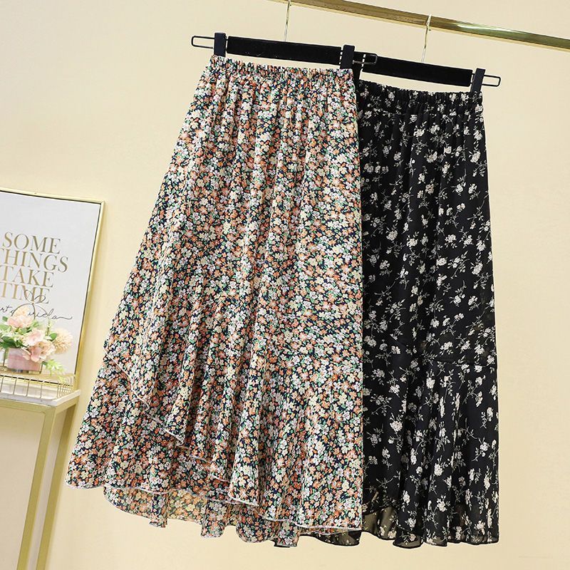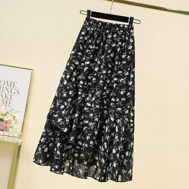 쉬폰 꽃 치마 2025 봄과 여름 새로운 도착 플러스 사이즈 슬리밍 A-모양의 드랩 된 중간 길이 스커트스토어 가기