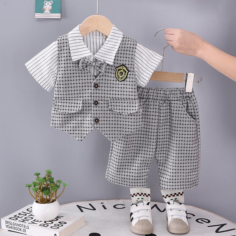 2025 Summer New Boys 'Houndstooth Bow-tie Vest 반팔 3 피스 세트 보이즈 베이비 캐주얼 반바지 트렌디 세트스토어 가기