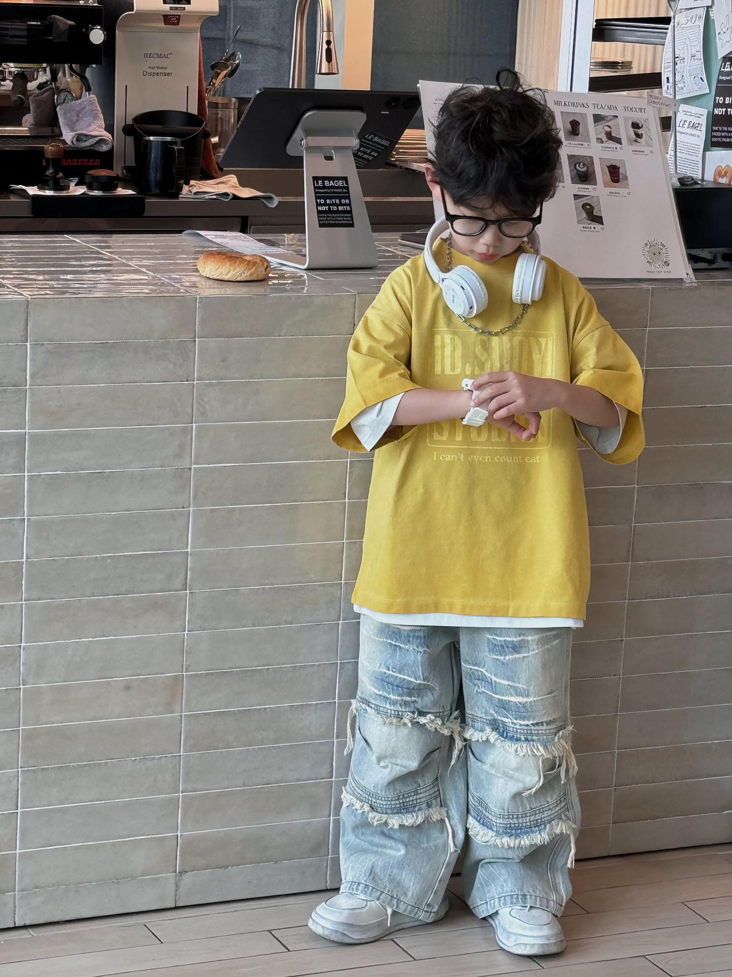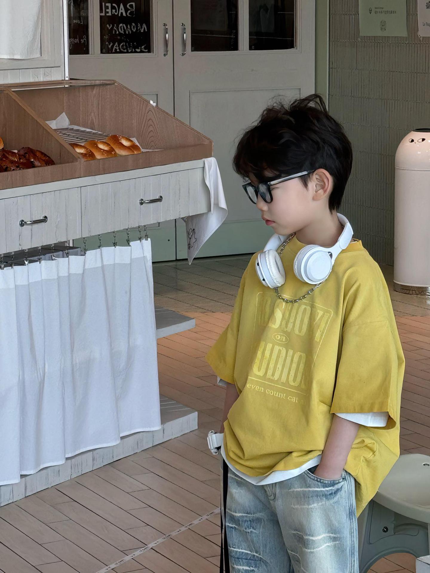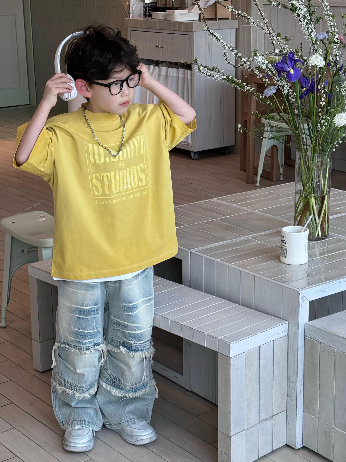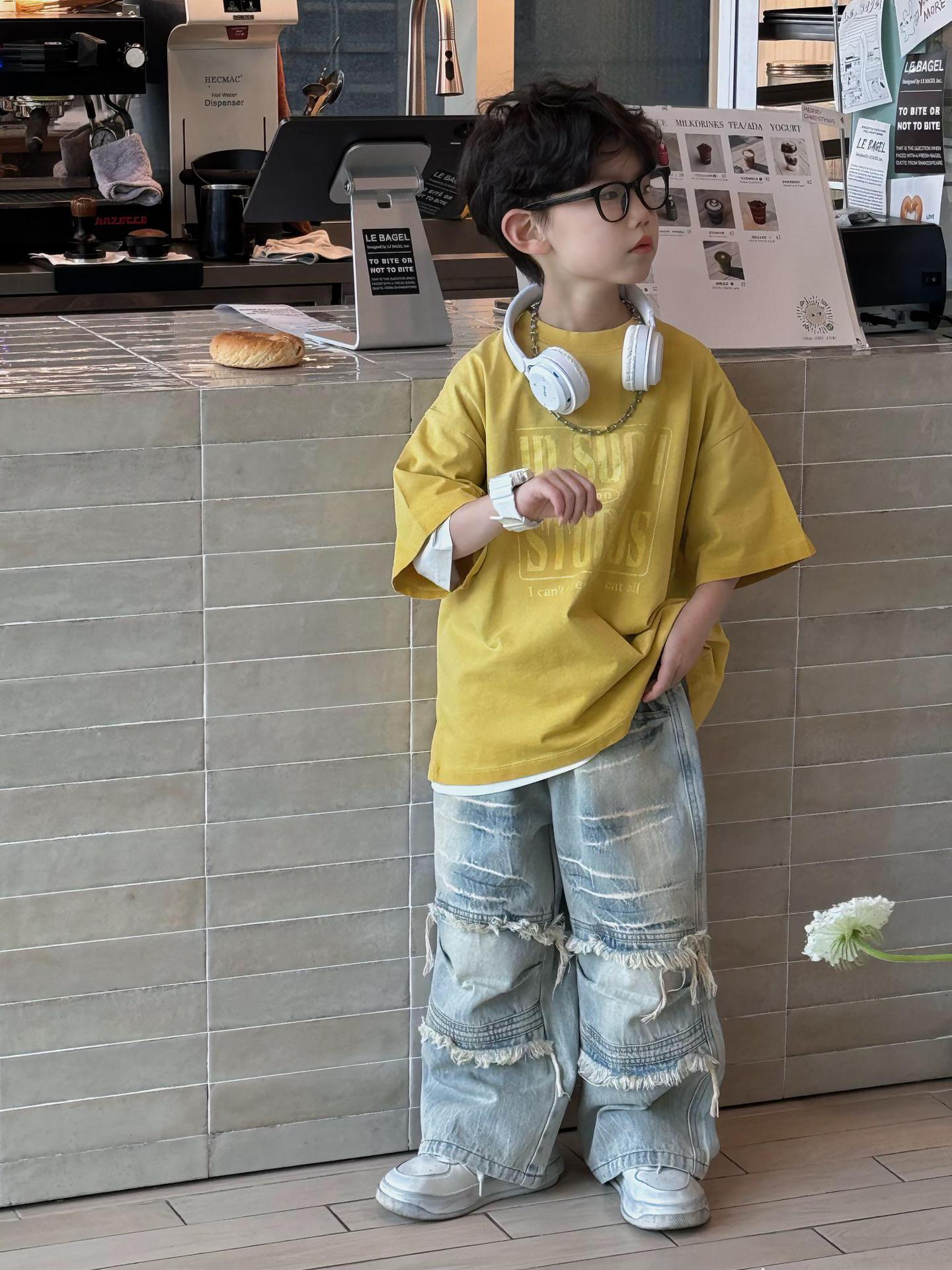 티루 2025 봄과 여름 새로운 한국 스타일 소년 밝은 색 편지 디자인 센스 풀오버 반팔 티셔츠 어린이 최고 트렌디스토어 가기