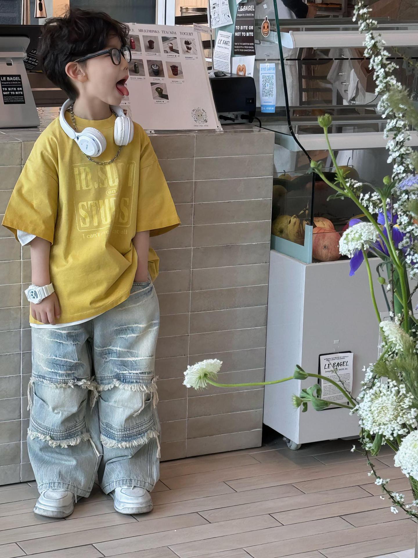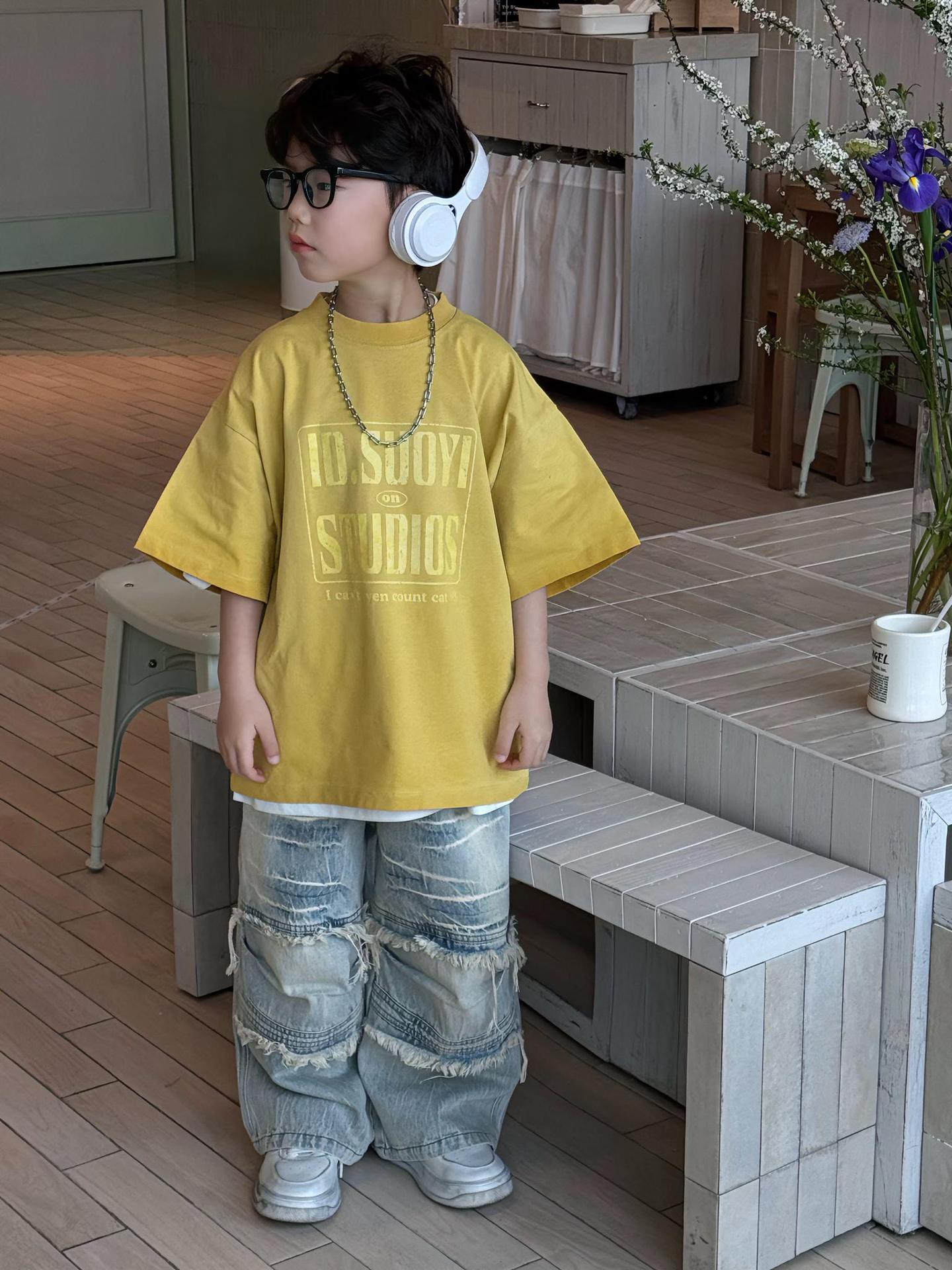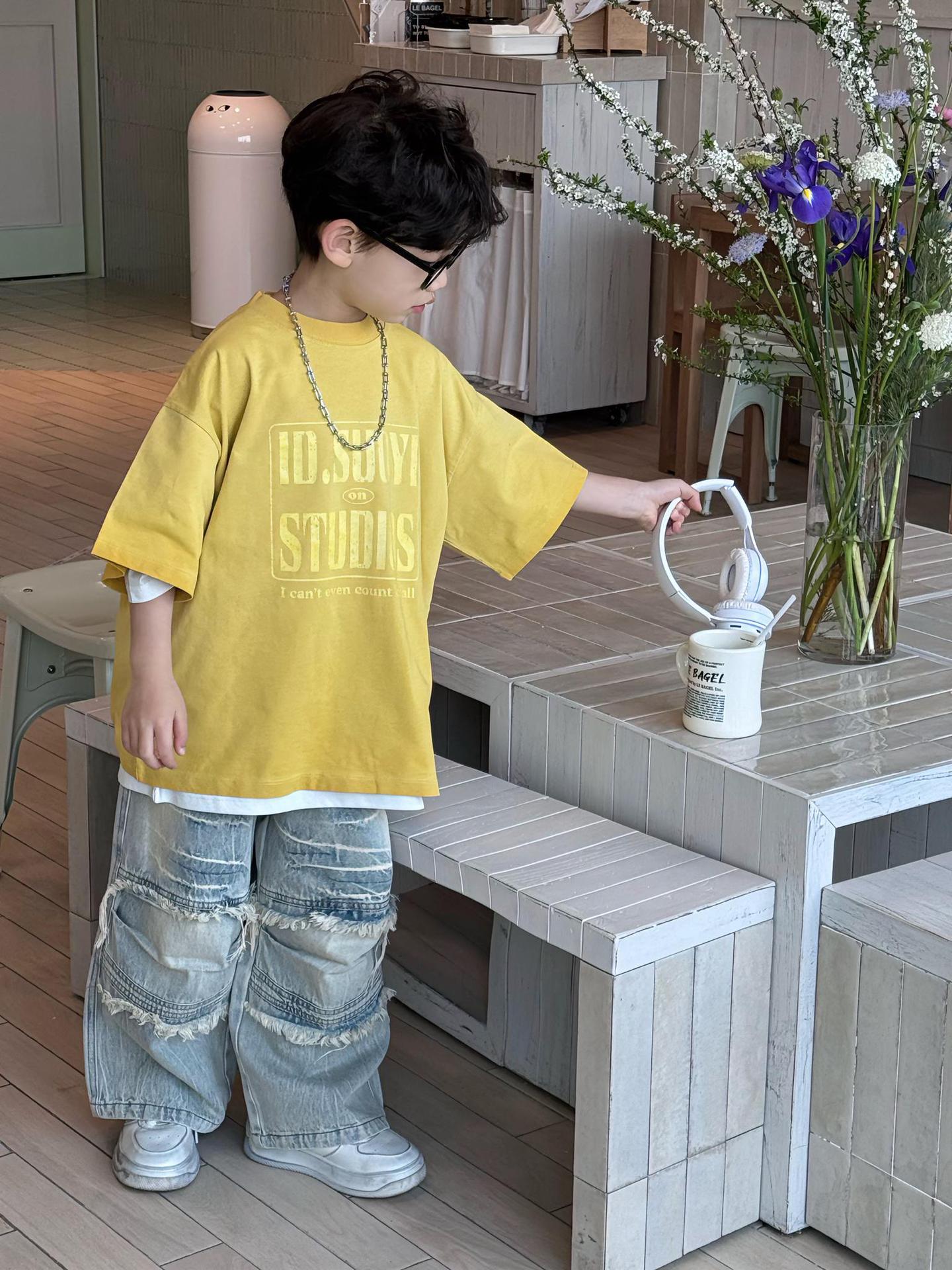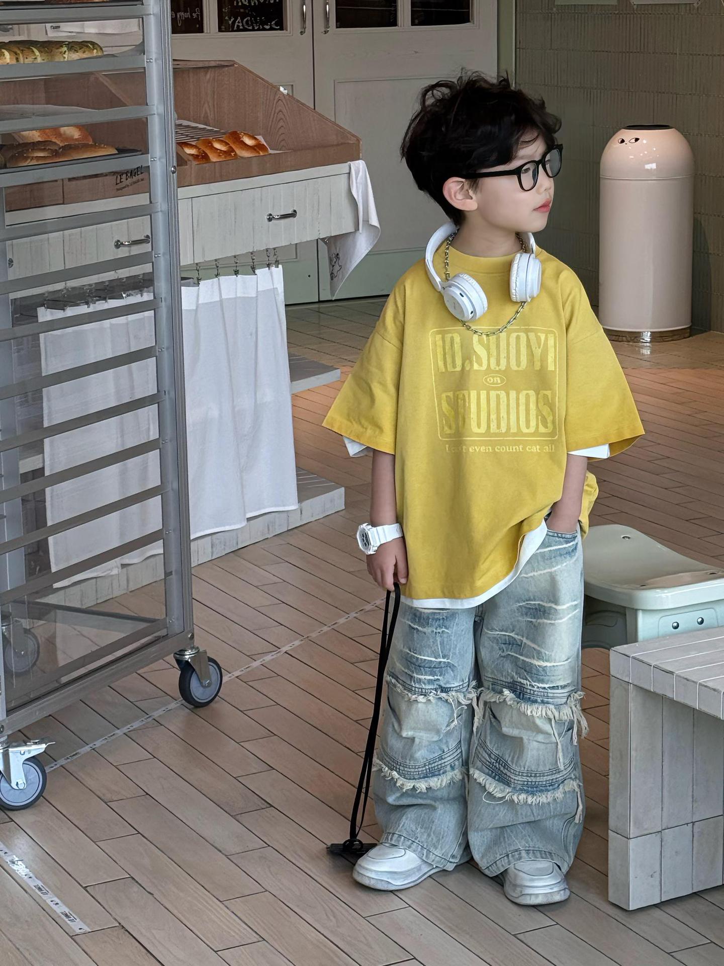 티루 2025 봄과 여름 새로운 한국 스타일 소년 밝은 색 편지 디자인 센스 풀오버 반팔 티셔츠 어린이 최고 트렌디스토어 가기