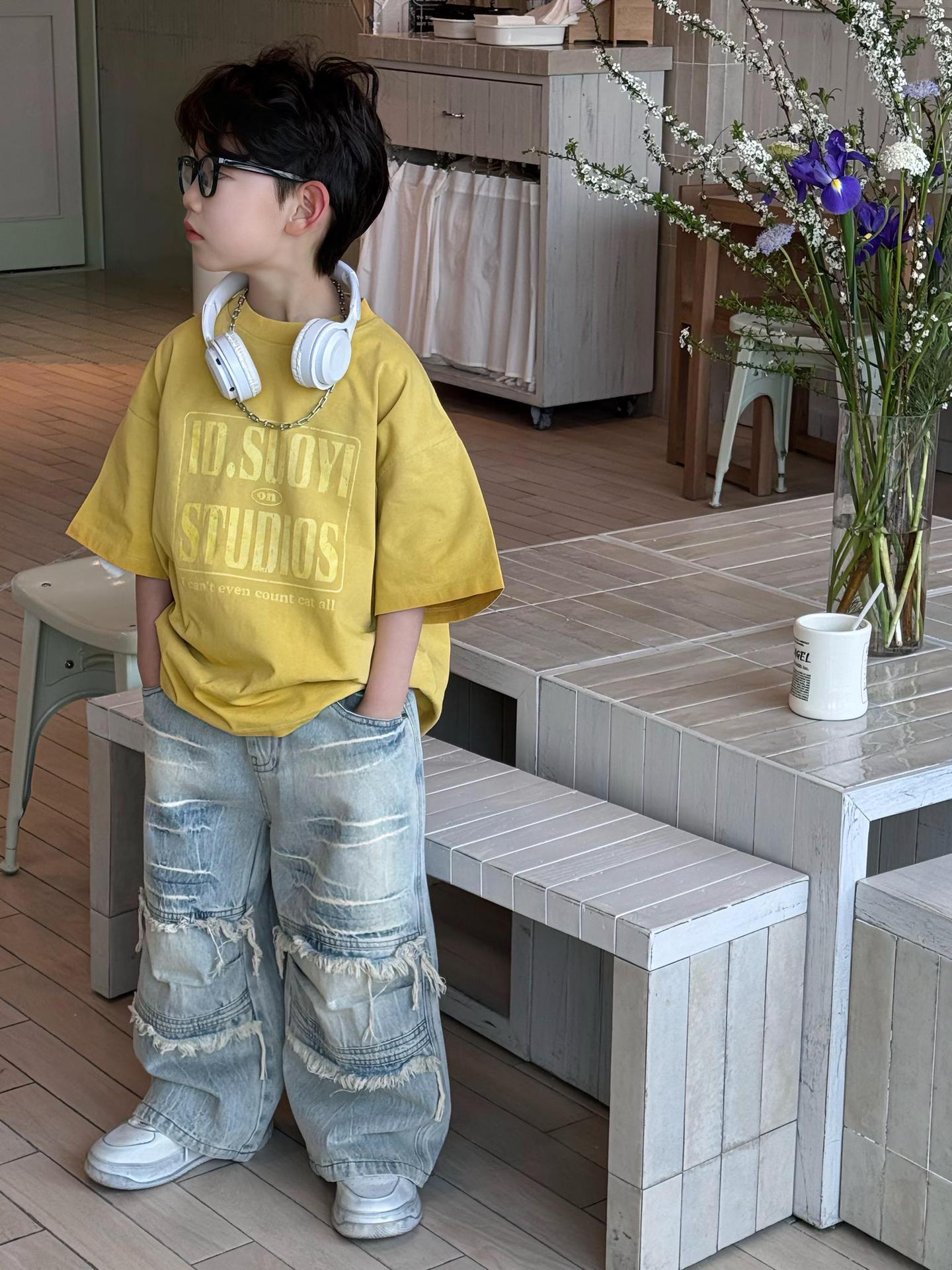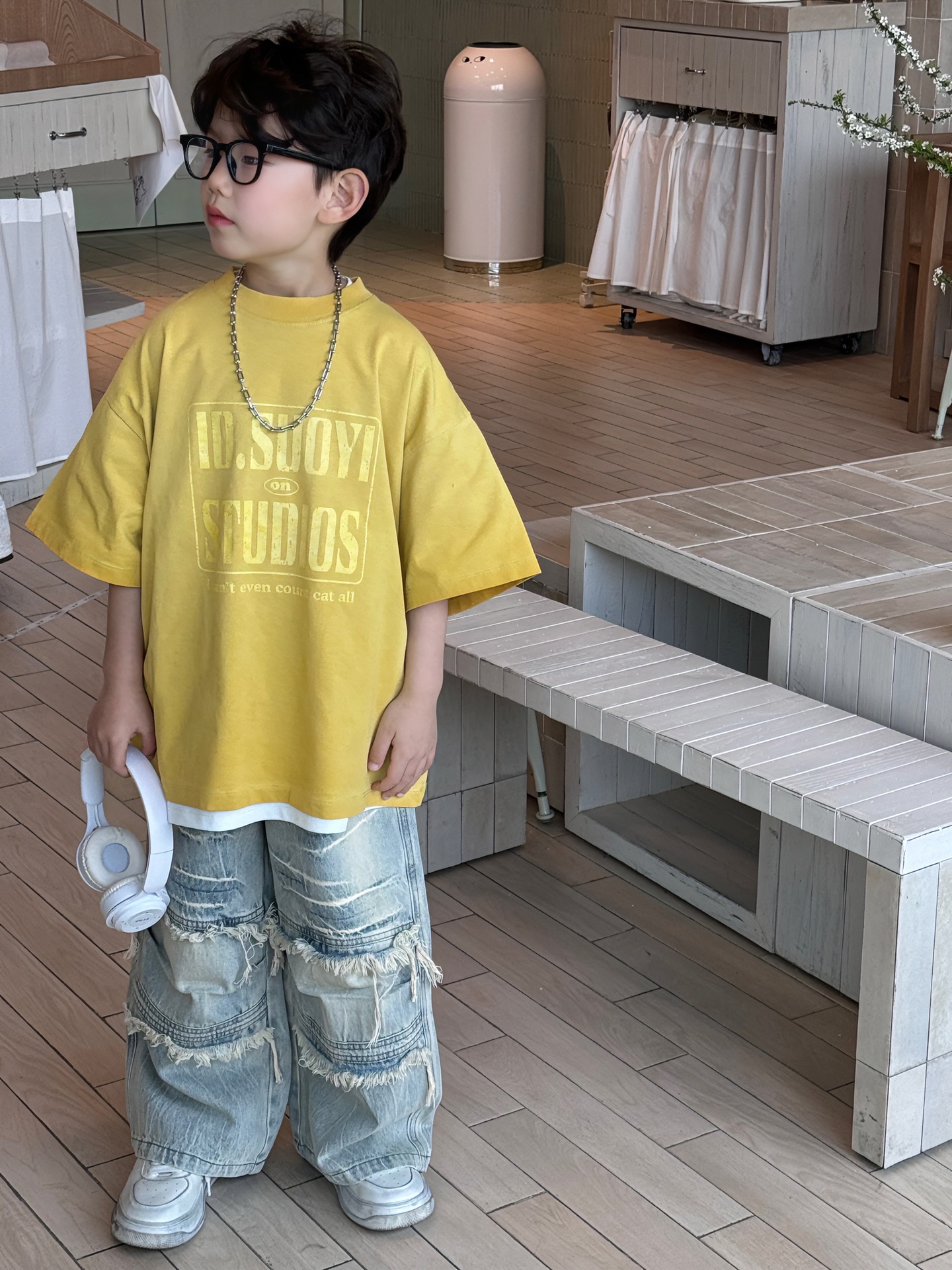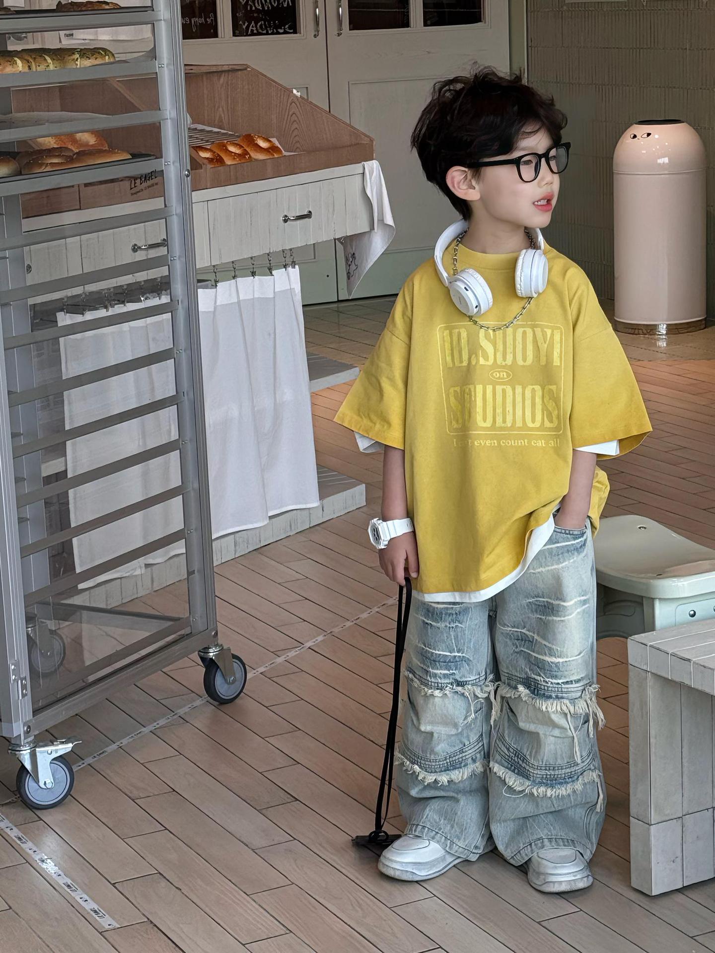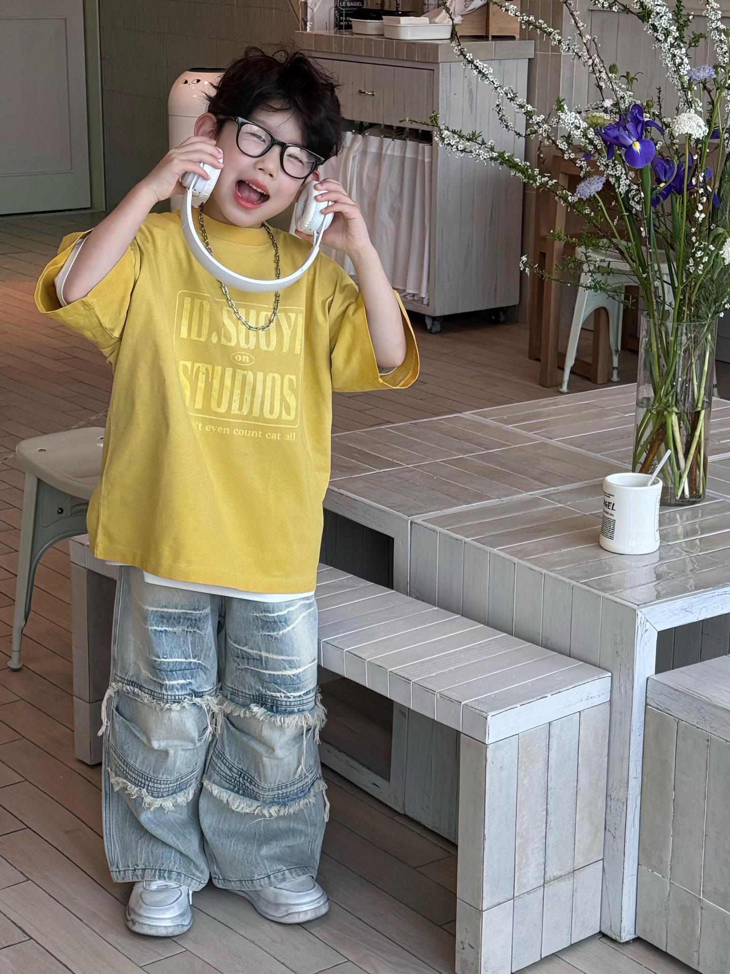 티루 2025 봄과 여름 새로운 한국 스타일 소년 밝은 색 편지 디자인 센스 풀오버 반팔 티셔츠 어린이 최고 트렌디스토어 가기