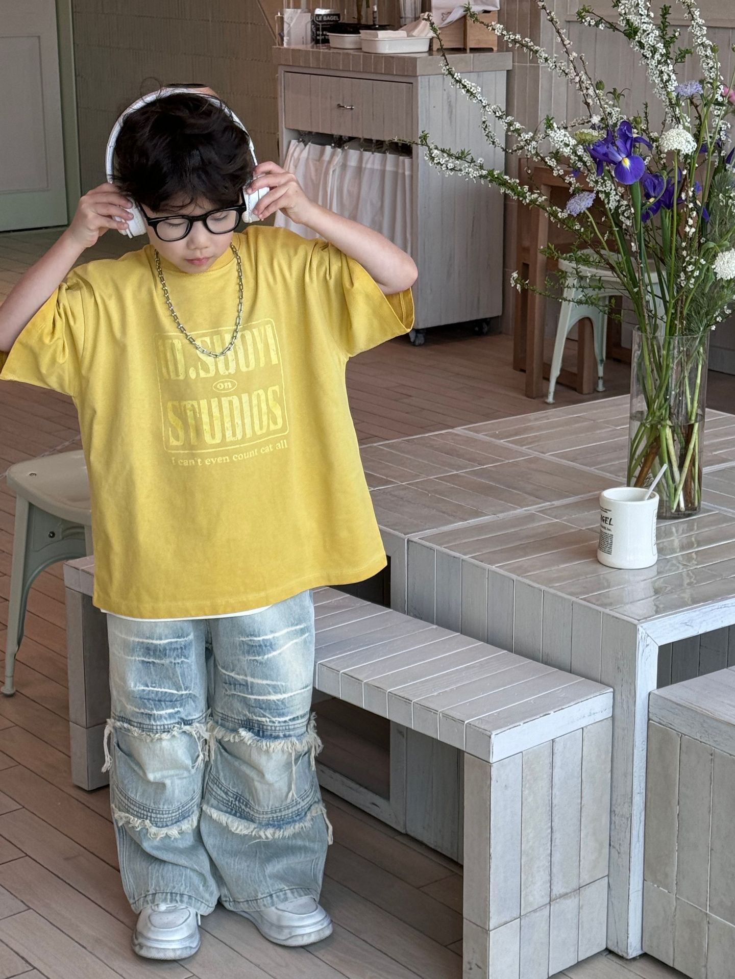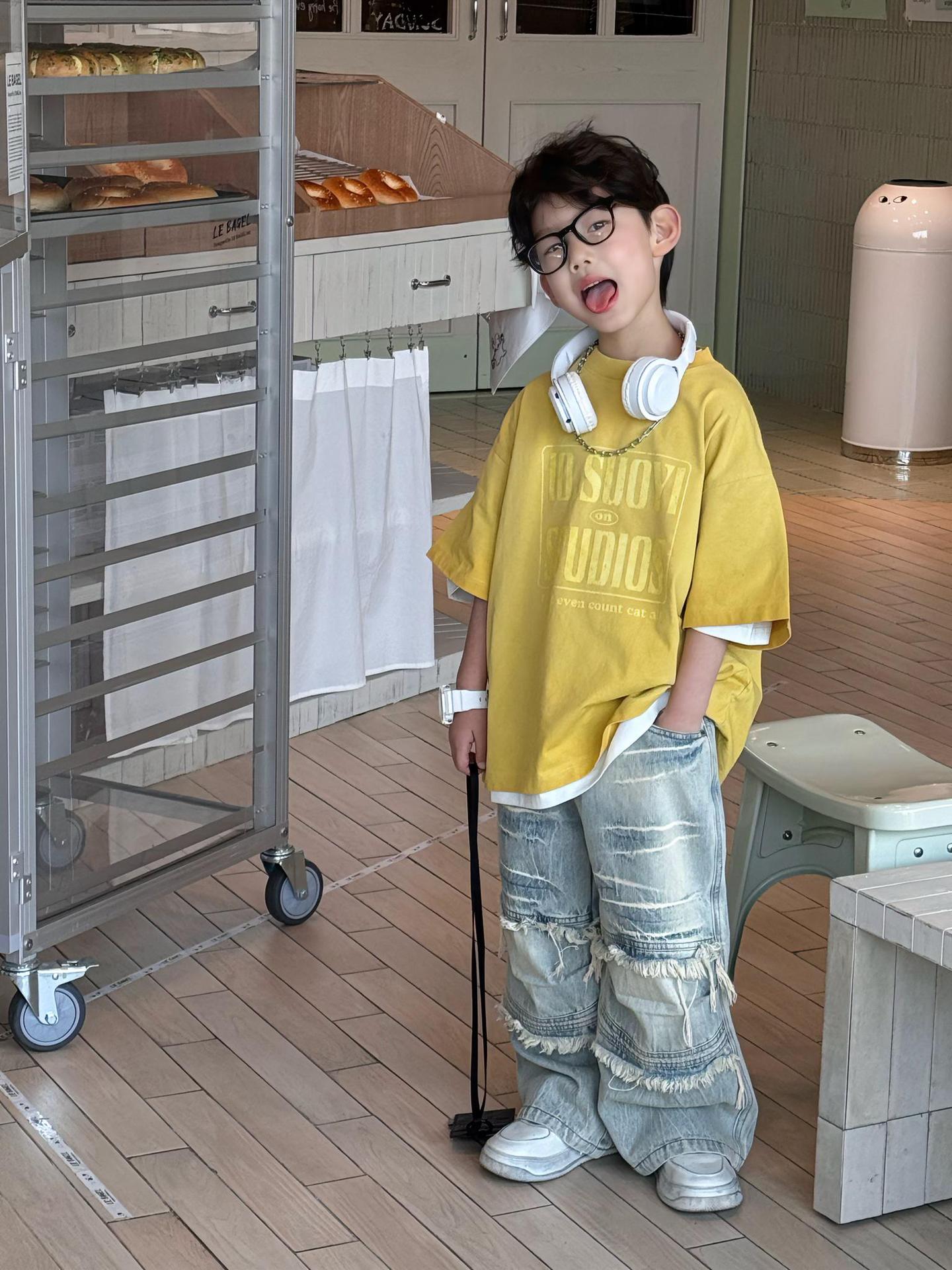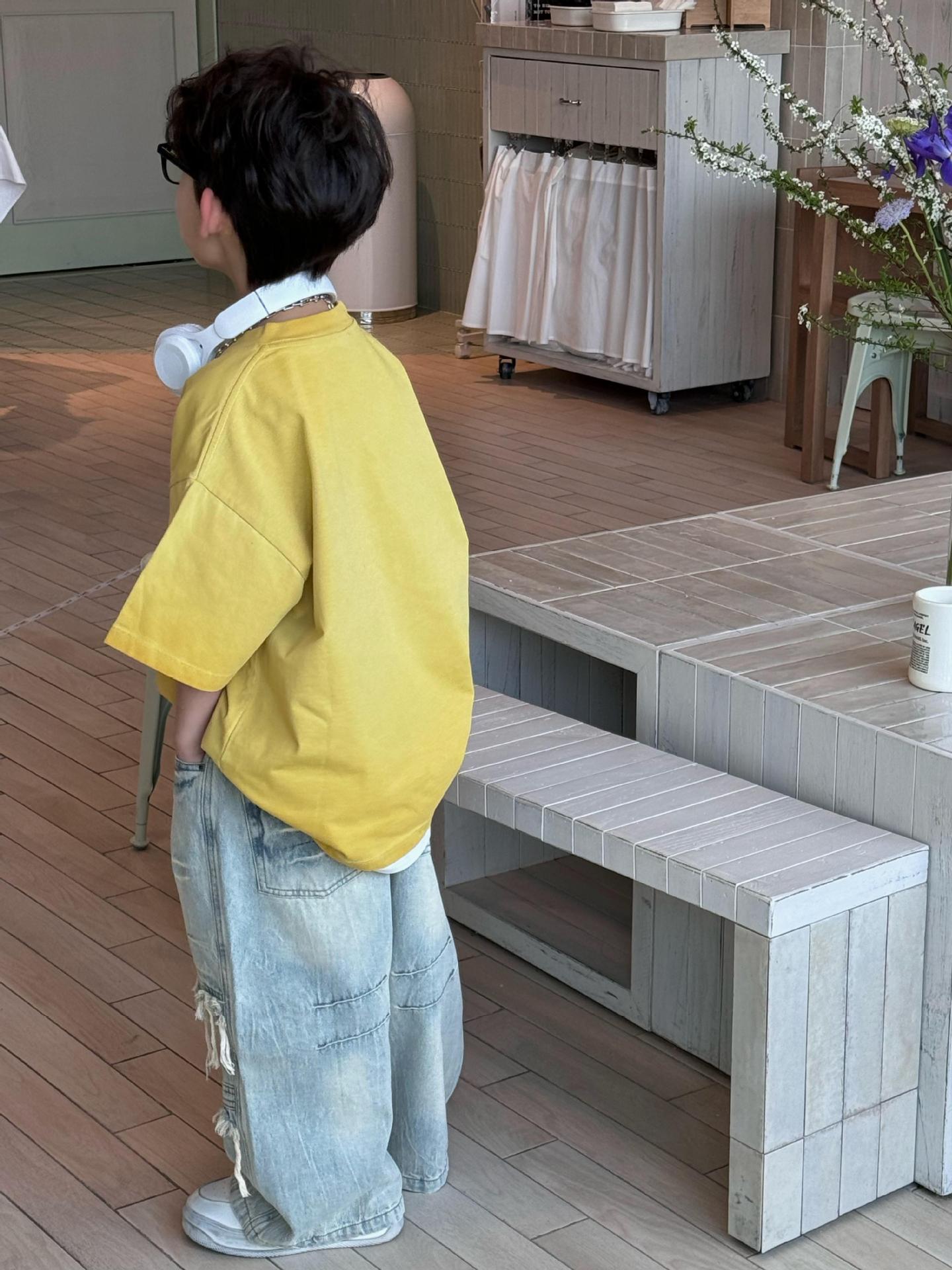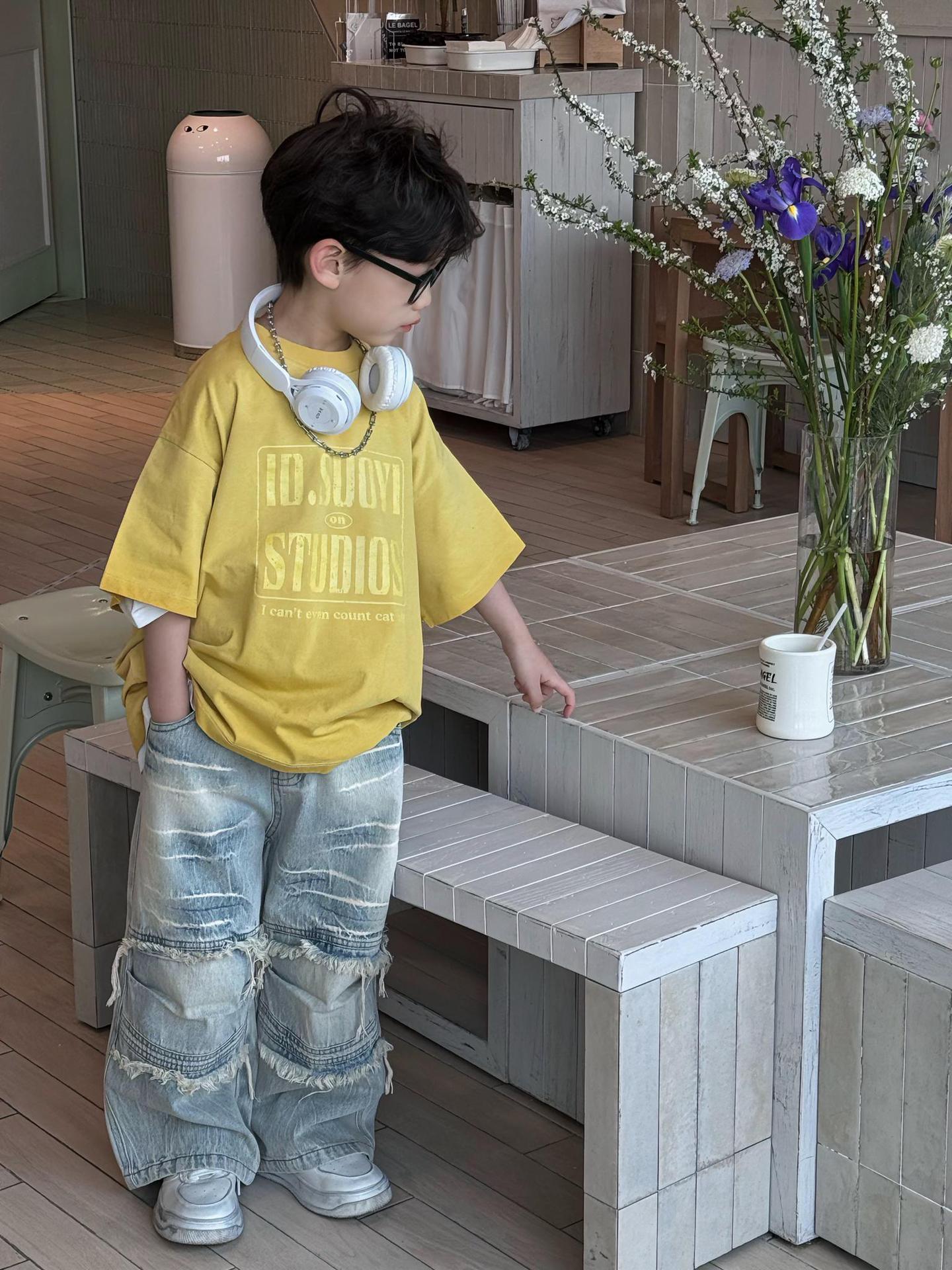 티루 2025 봄과 여름 새로운 한국 스타일 소년 밝은 색 편지 디자인 센스 풀오버 반팔 티셔츠 어린이 최고 트렌디스토어 가기