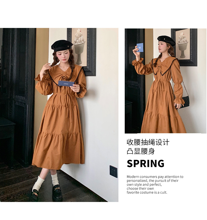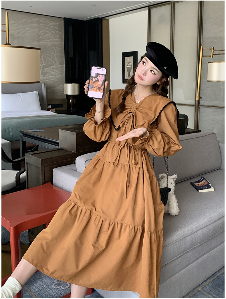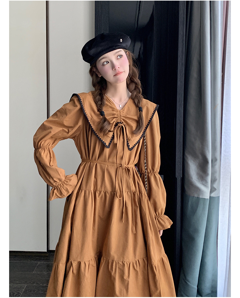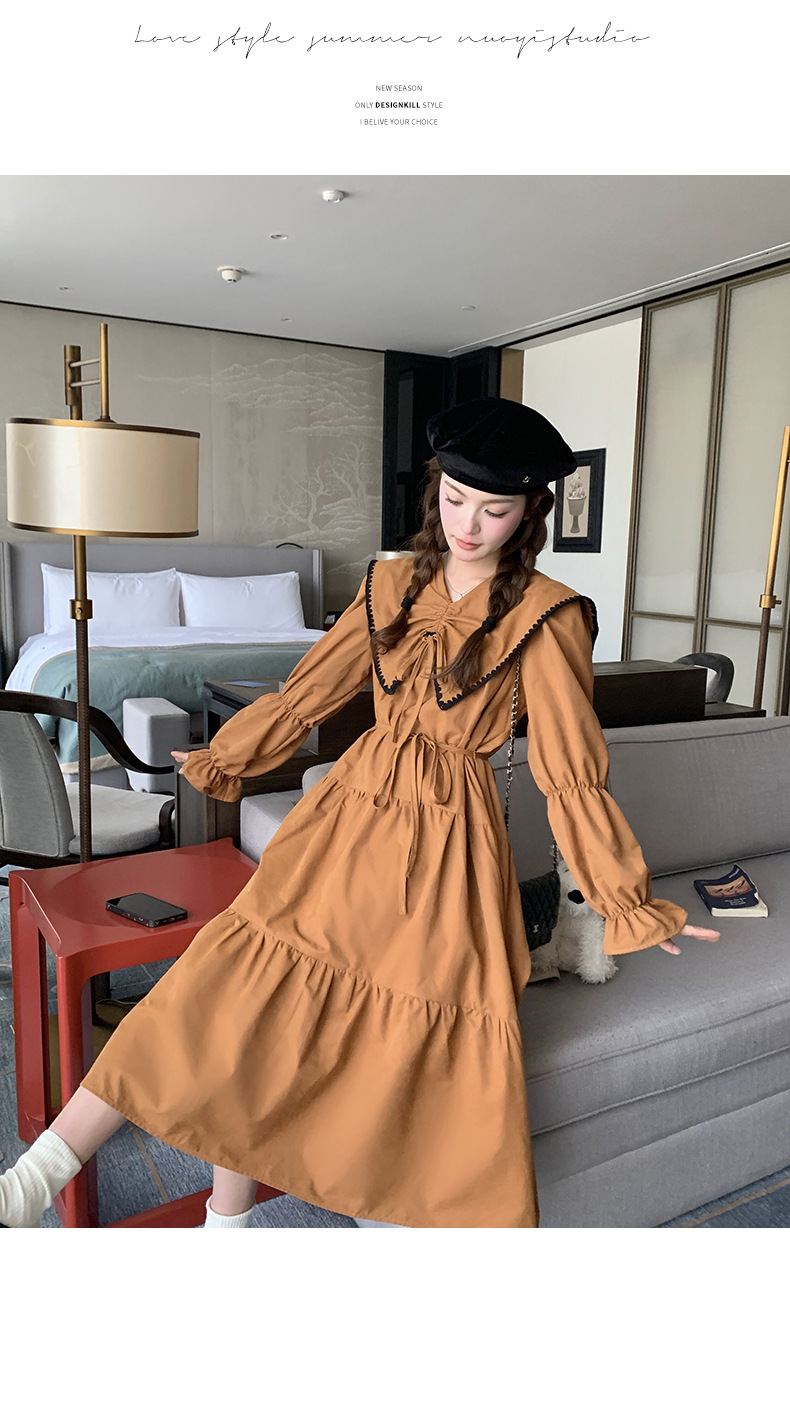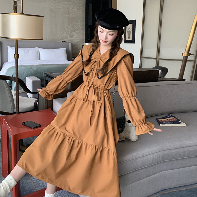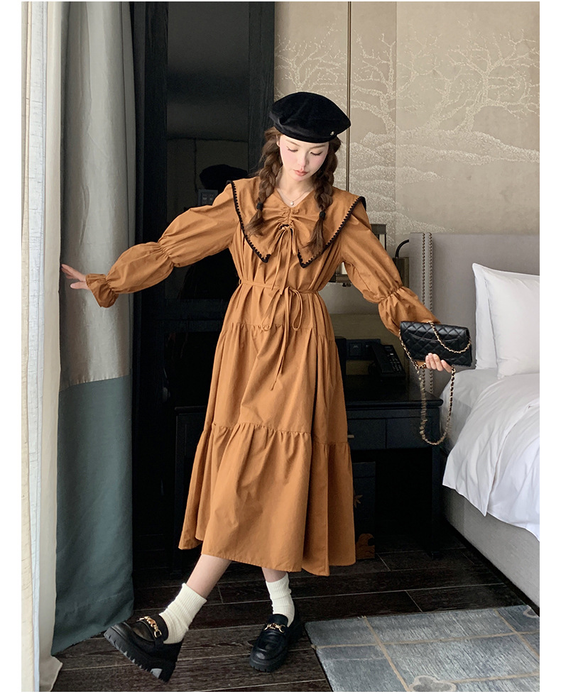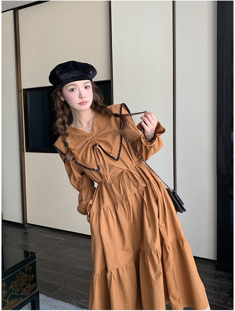 [멩메이] 25 봄 우아한 프랑스 호박 컬러 인형 칼라 긴 소매 원피스 여성의 부드러운 스타일 기질 긴 원피스 패션스토어 가기