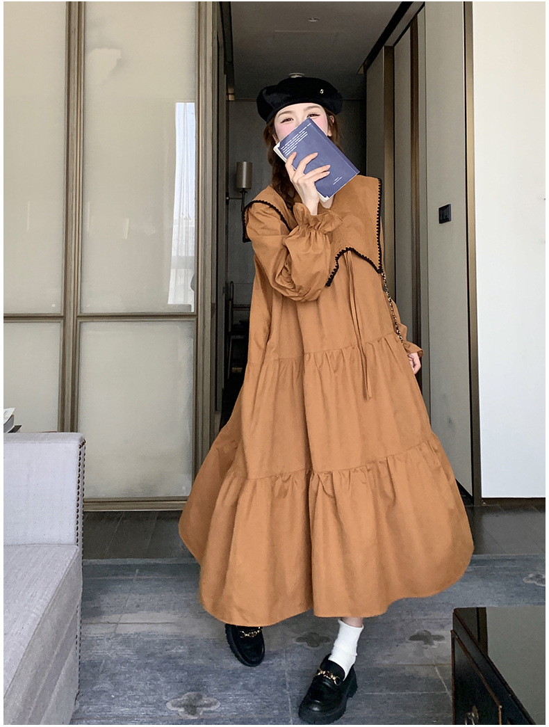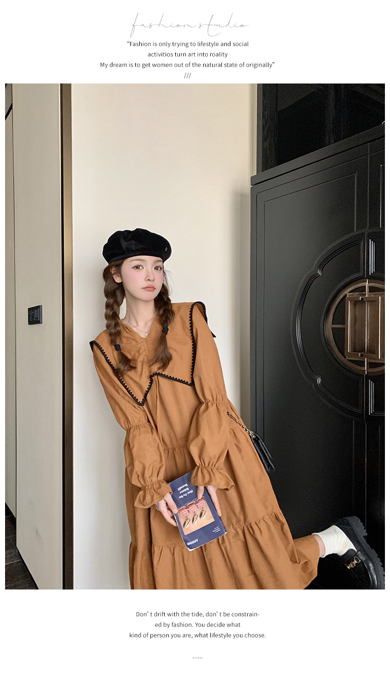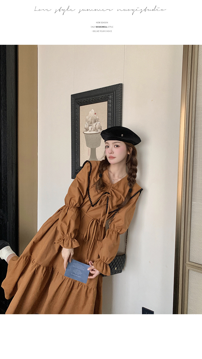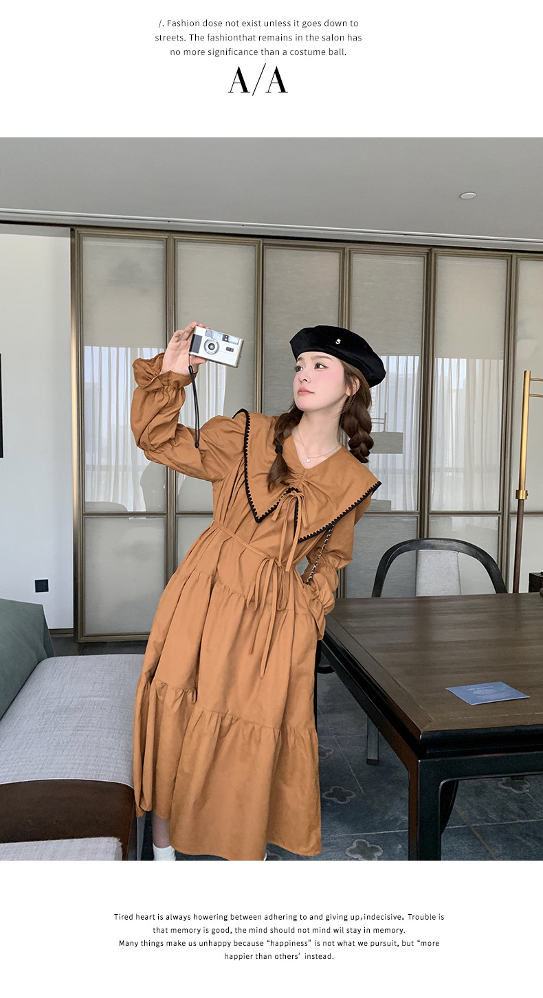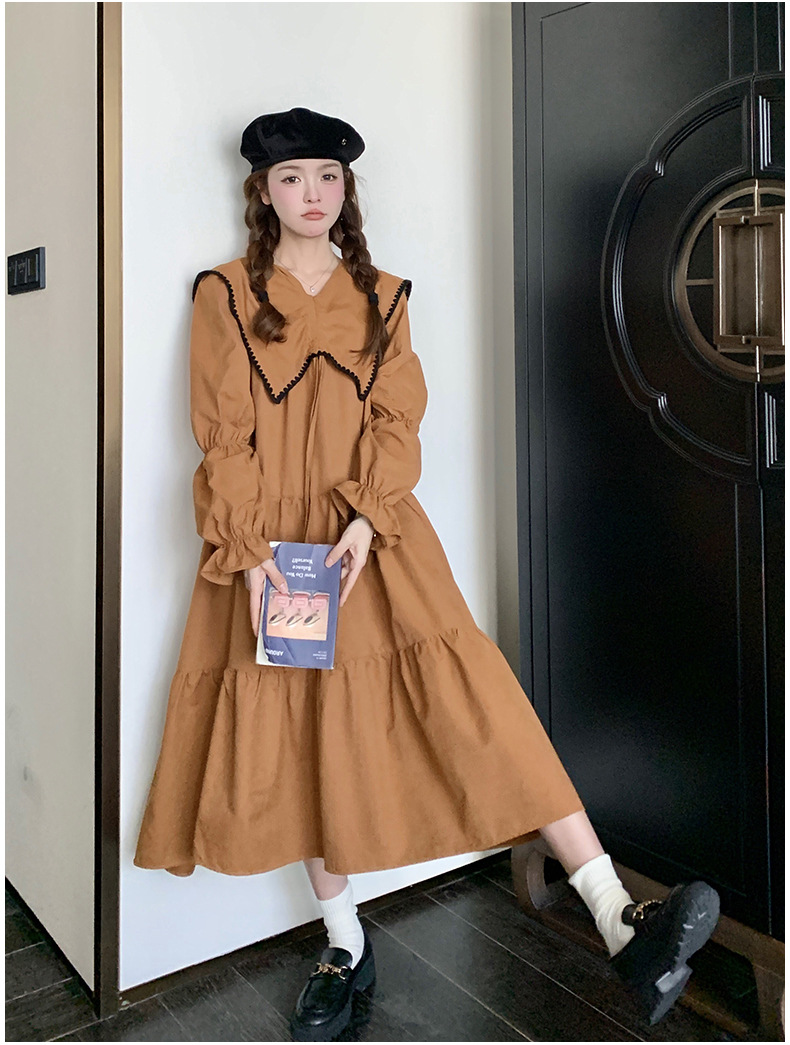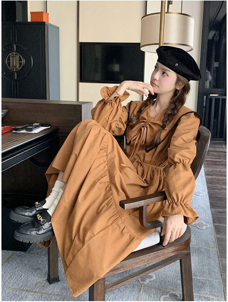 [멩메이] 25 봄 우아한 프랑스 호박 컬러 인형 칼라 긴 소매 원피스 여성의 부드러운 스타일 기질 긴 원피스 패션스토어 가기